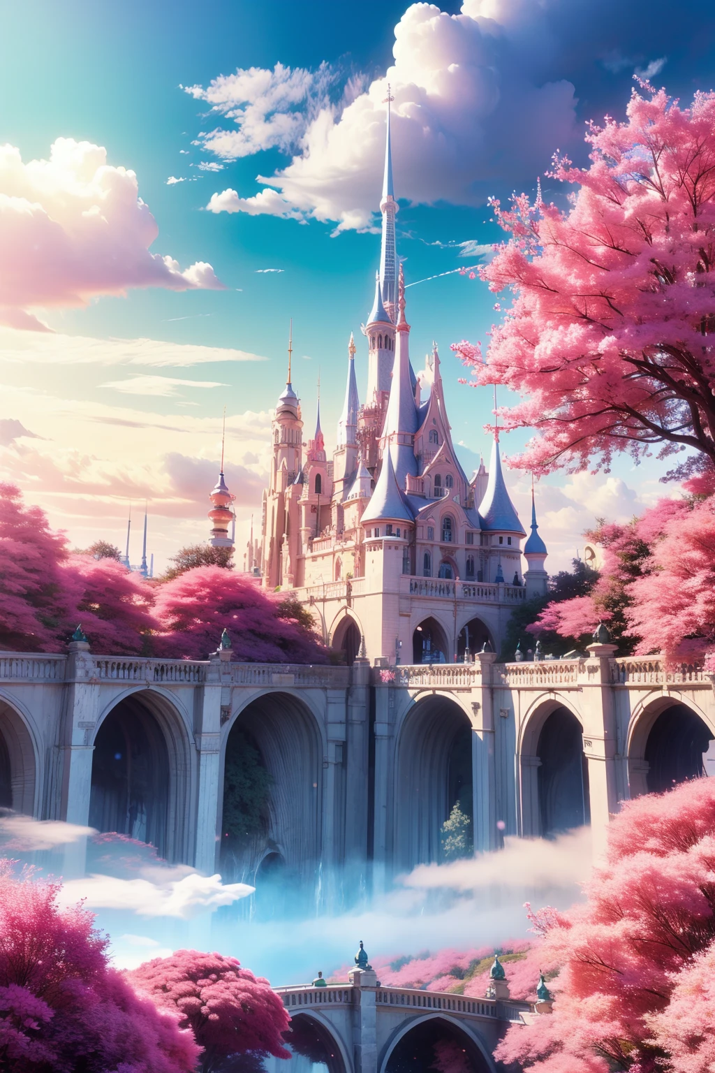 2:mhxy, cloud, scenery, sky, outdoors, no humans, tree, blue sky, day, bird, bridge, cloudy sky, fantasy, cherry blossoms, cityscape, building, castle, city.