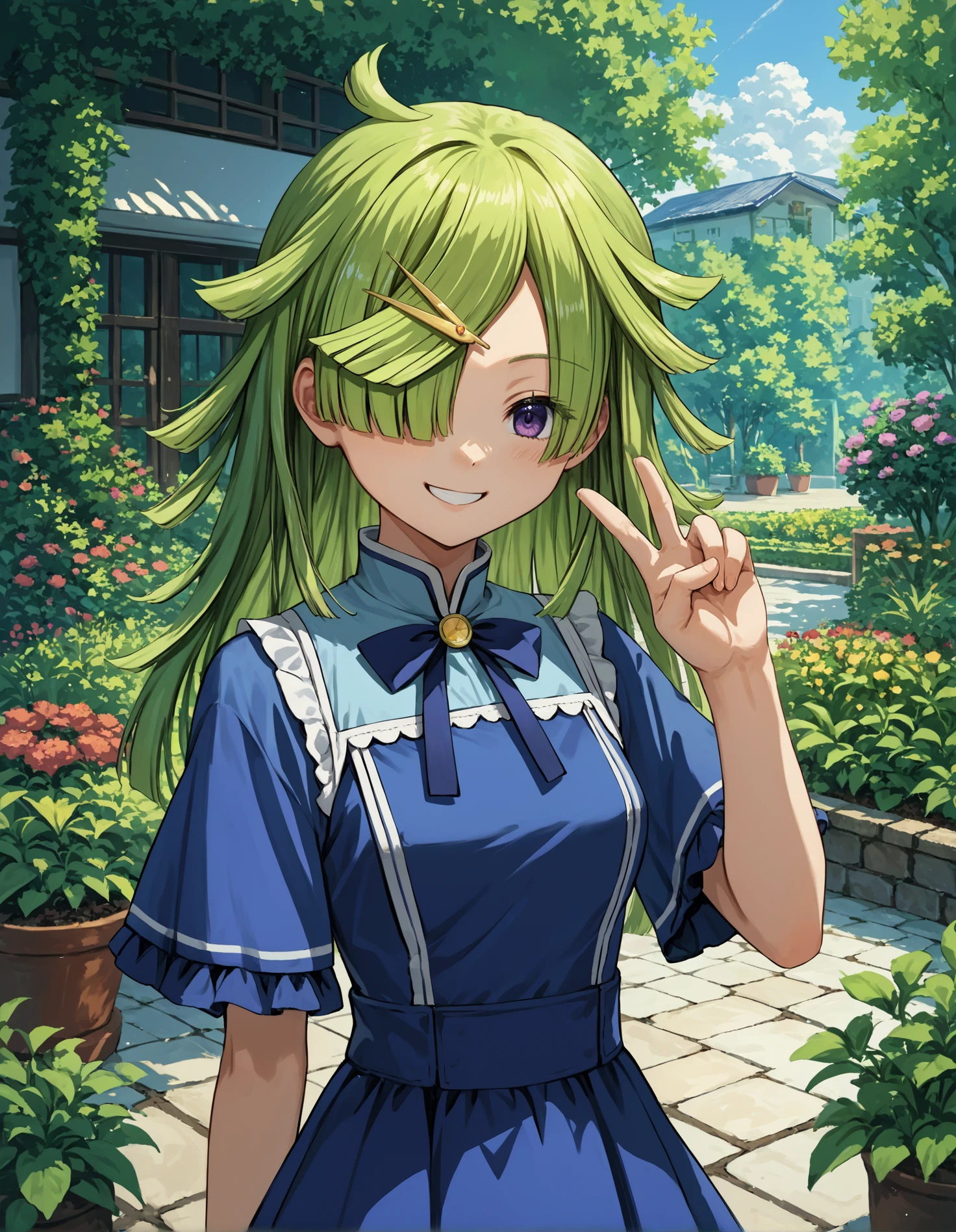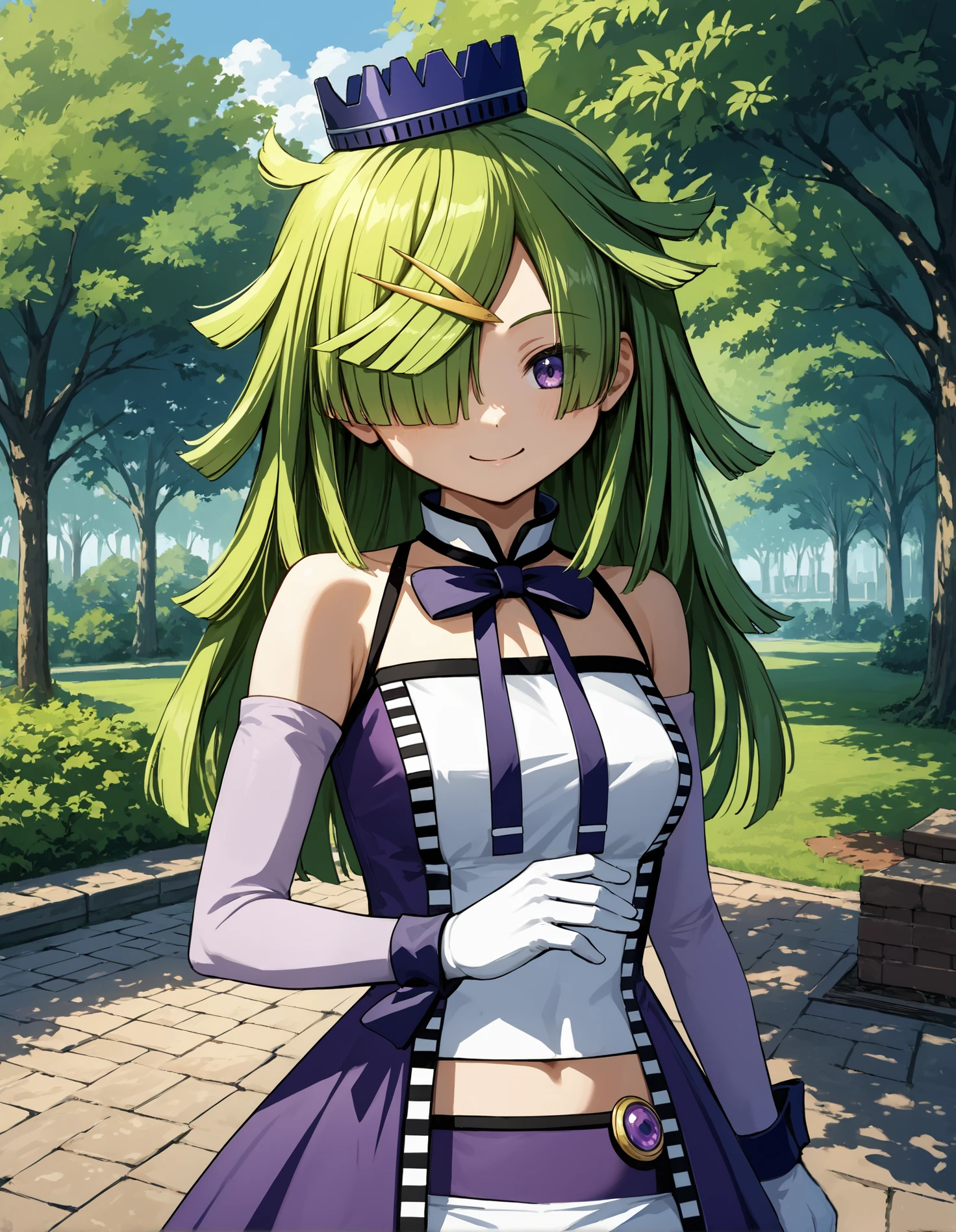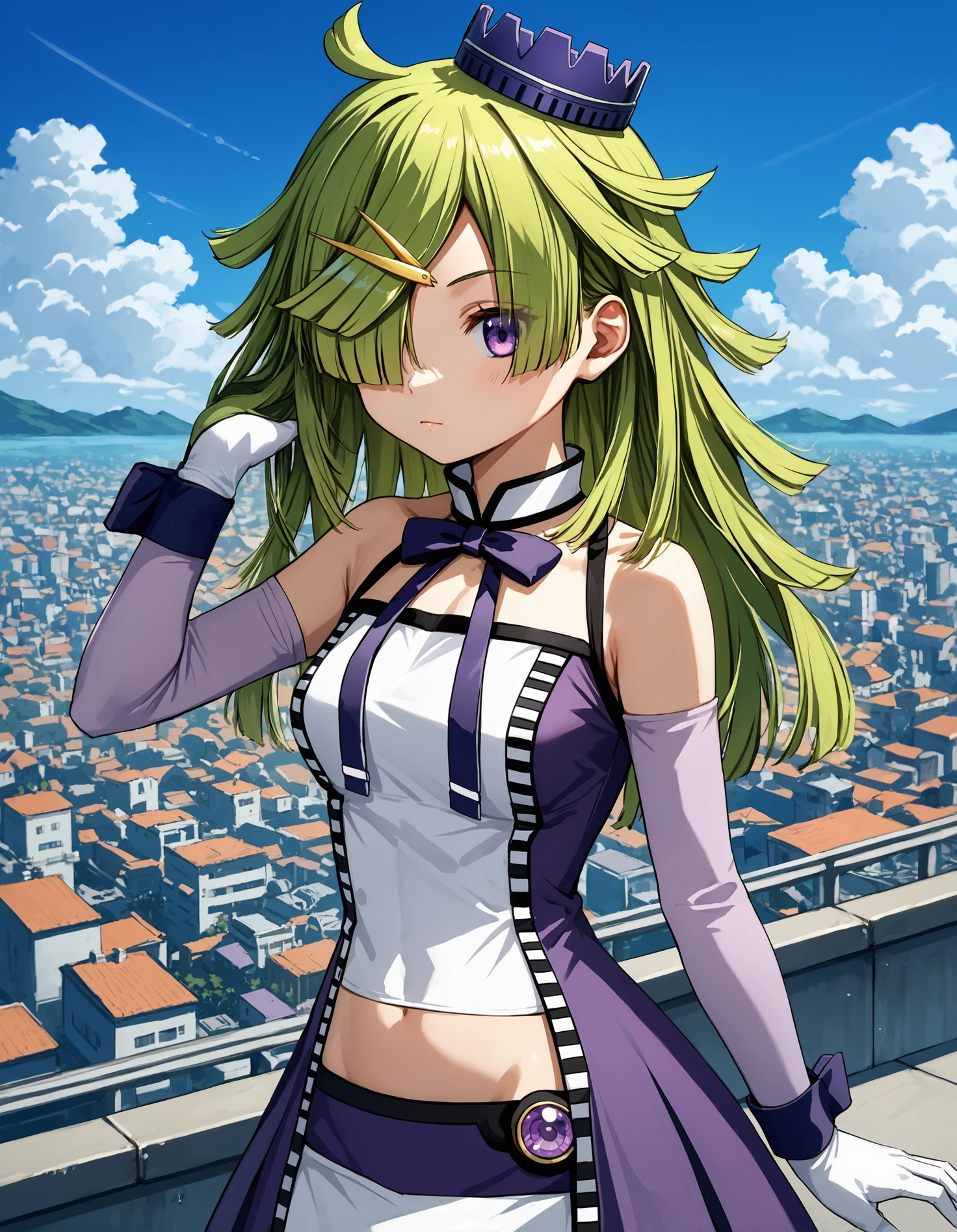 Appearance: green hair, blunt ends, one eye covered, purple eyes