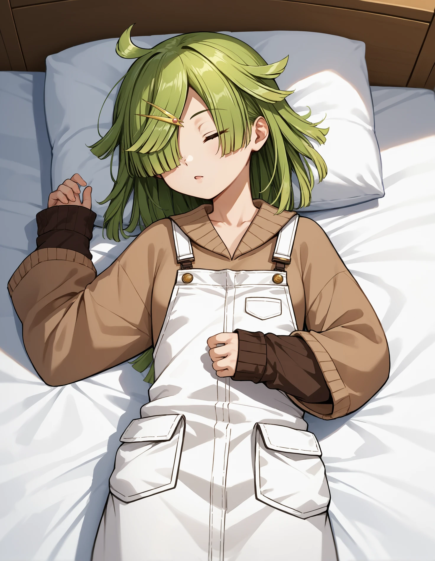 Casual outfit: scene0akimabayu, mbycsl, ahoge, gold hairpin, brown sweater, short over long sleeves, sleeves past wrists, white overalls, red striped thighhighs