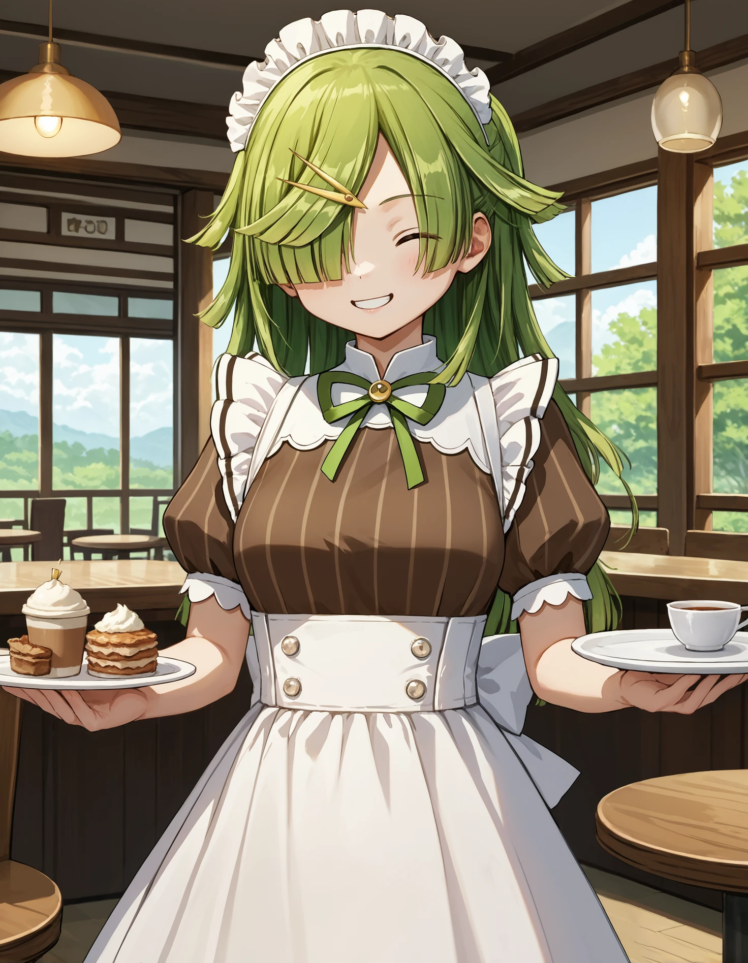 Maid outfit: scene0akimabayu, mbymai, gold hairpin, maid headdress, brown pleated shirt, short puffy sleeves, green neck bow, (white apron:0.8), white back bow