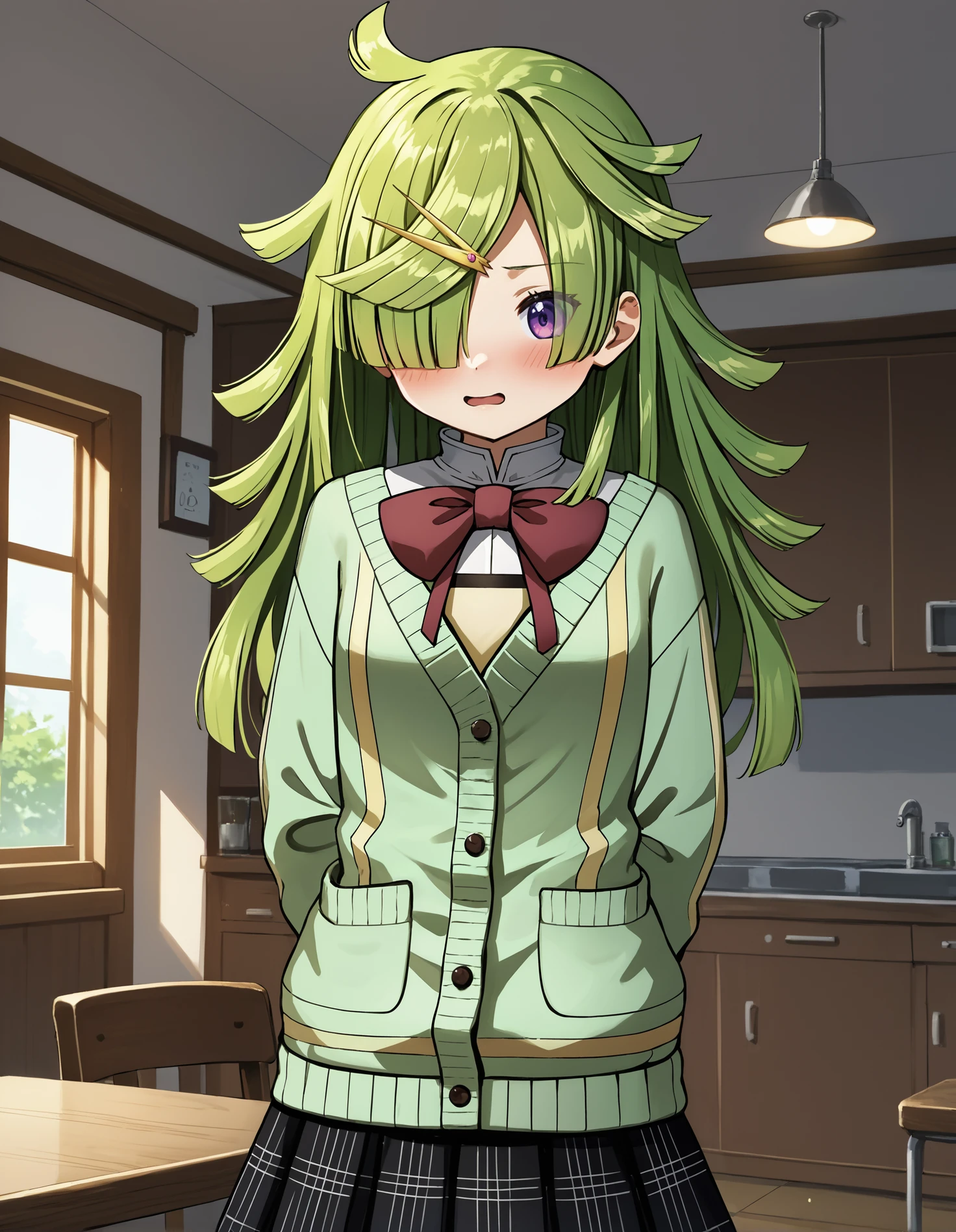 Public outfit: scene0akimabayu, mbypbc, ahoge, gold hairpin, white shirt, high collar, red bowtie, yellow vest, green cardigan, black plaid skirt, grey thighhighs