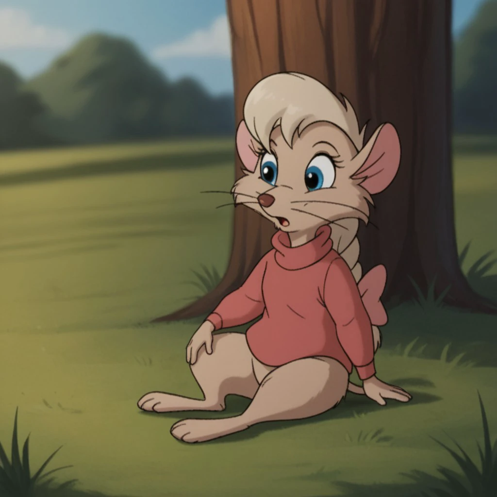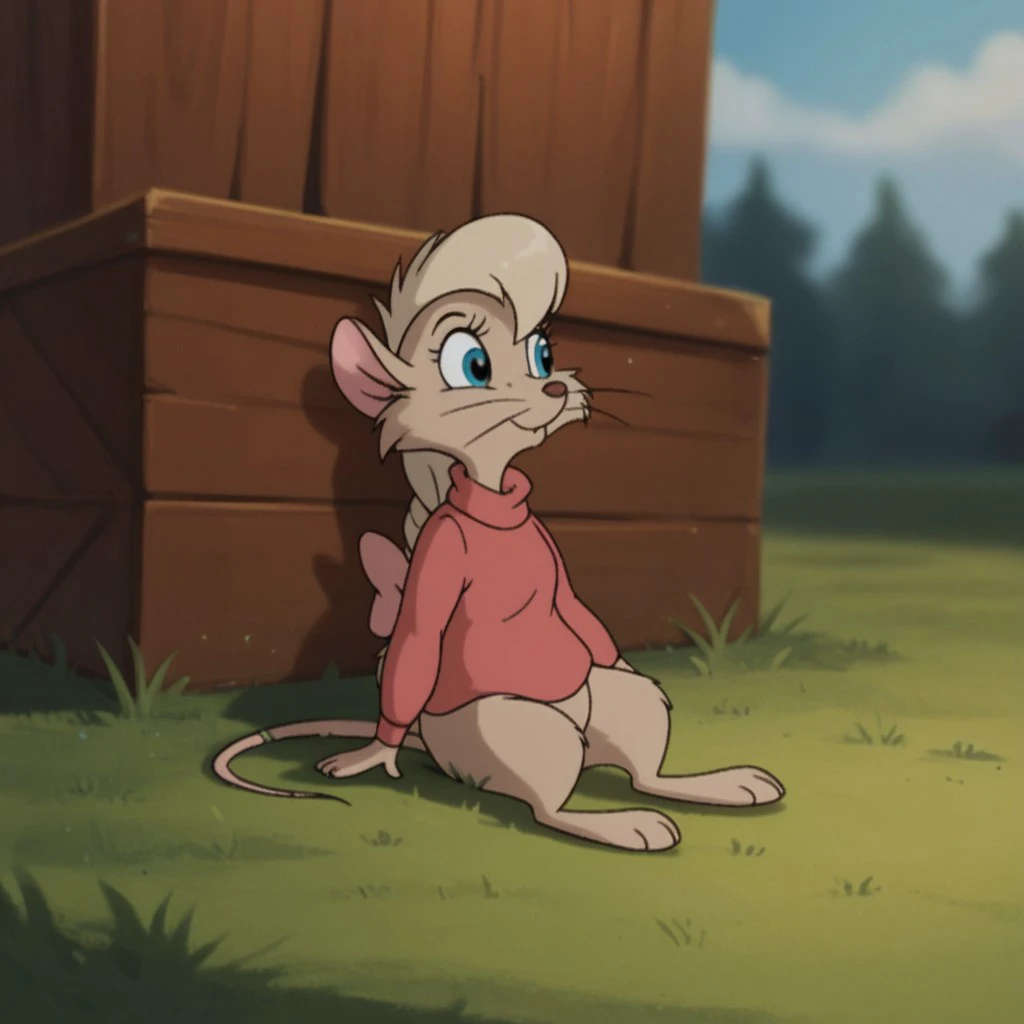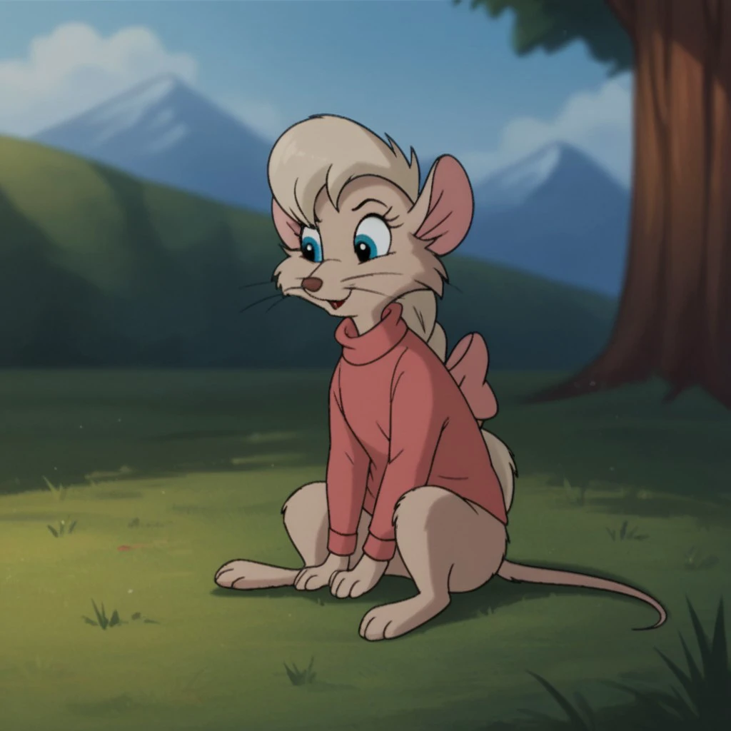 jennynimh2, semi-anthro, female, mouse, brown fur, ponytail, pink sweater, long sleeves, blue eyes, pink bow,