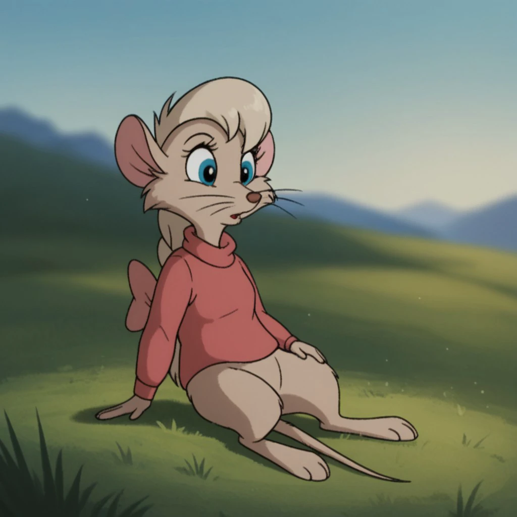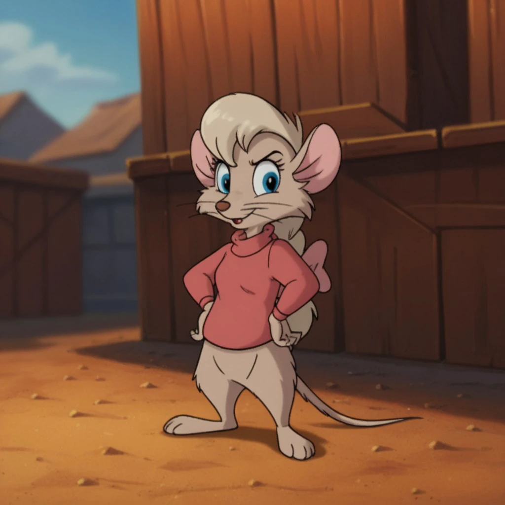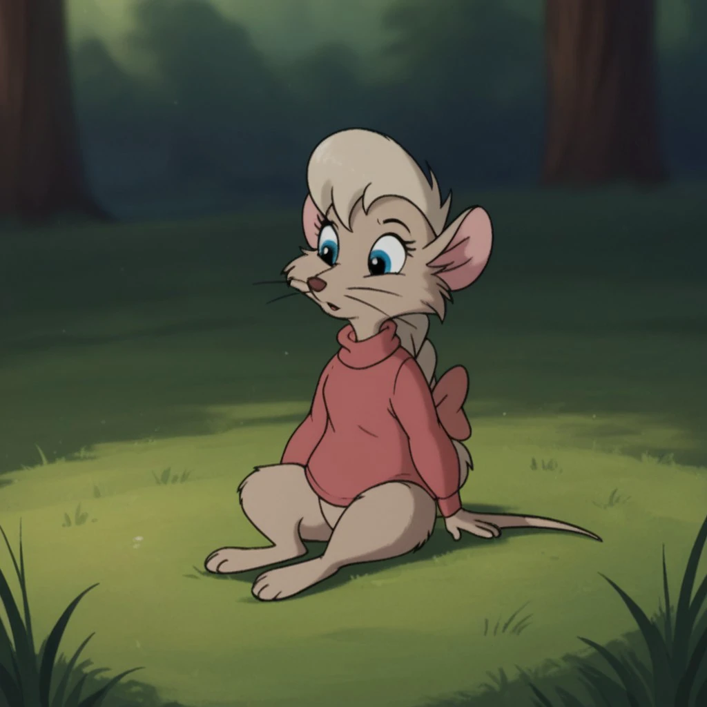 jennynimh2, semi-anthro, female, mouse, brown fur, ponytail, pink sweater, long sleeves, blue eyes, pink bow,