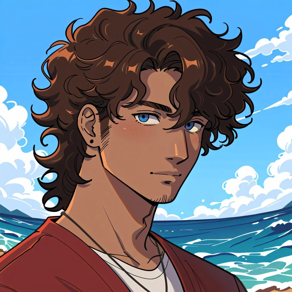 MichaelFNAF, dark hair, fluffy hair, mullet, dark skin, dark blue eyes, youthful face, facial hair, male