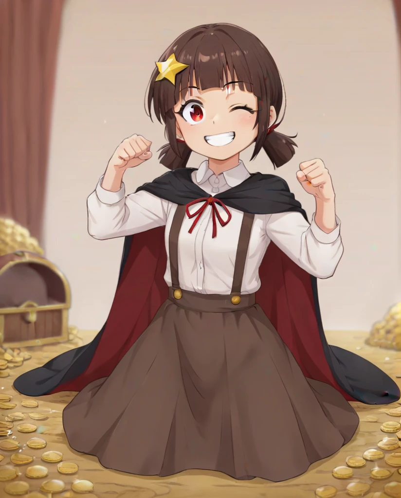 1girl, komekko, star_hair_ornament, red eyes, twintails, brown_hair, blunt_bangs, standing, low ponytail, brown skirt, suspender skirt, collared shirt, cape, skirtAged Up
