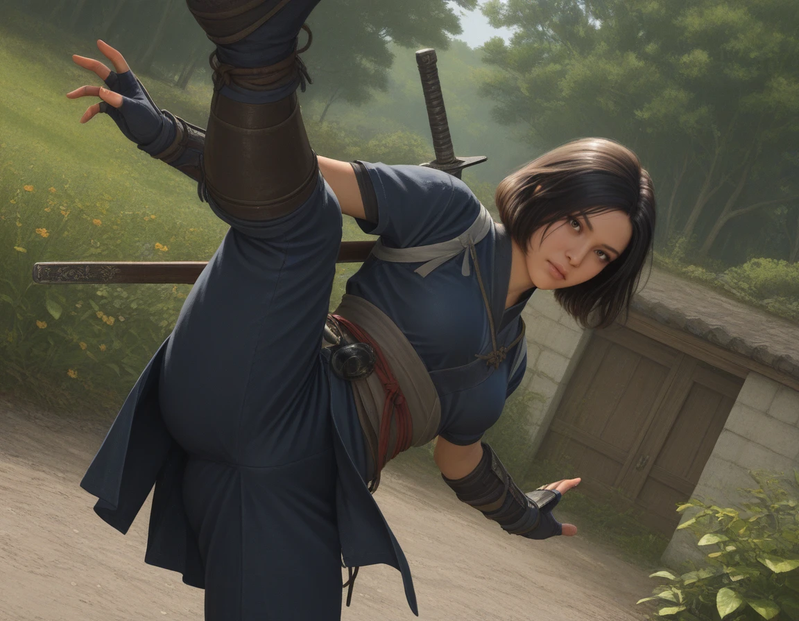 Naoe prompt: A ACNaoe woman with dark brown, shoulder-length, and slightly messy hair wearing a dark blue ninja outfit