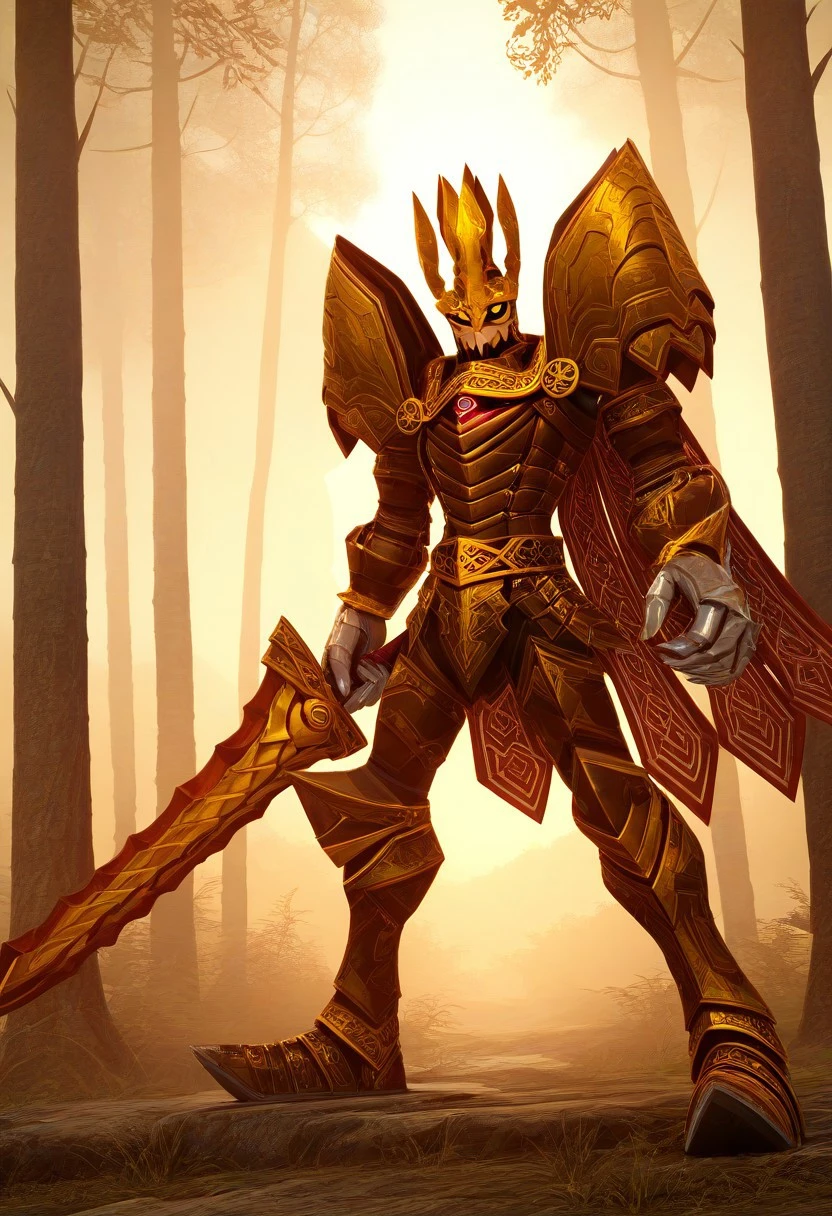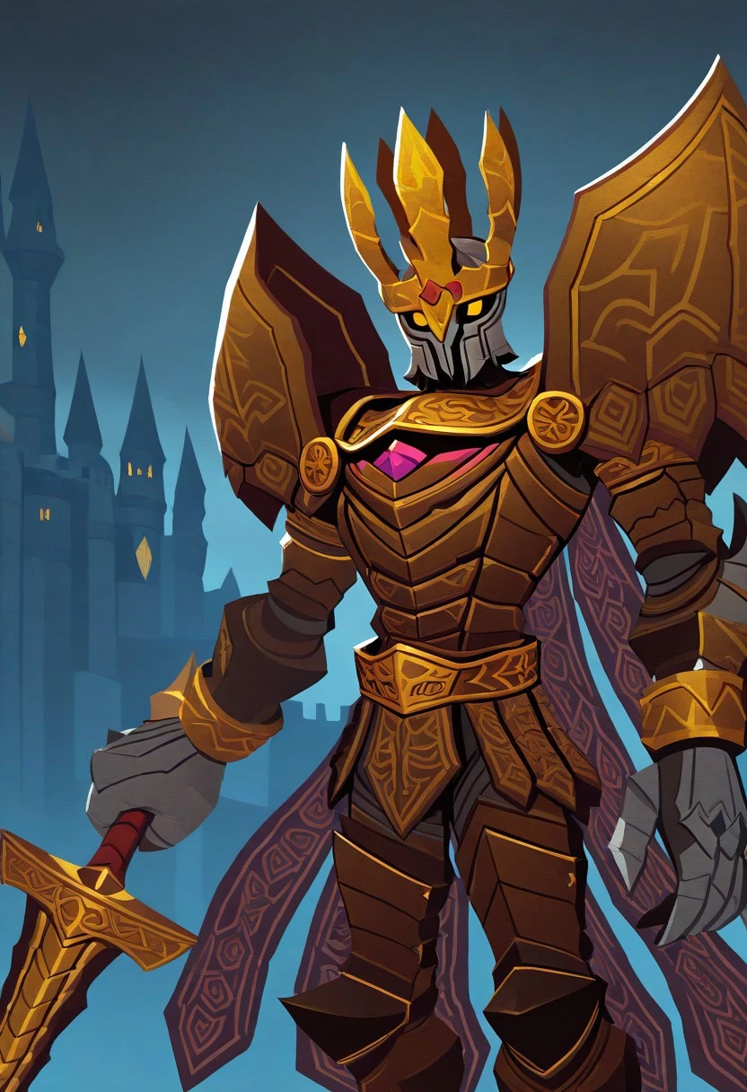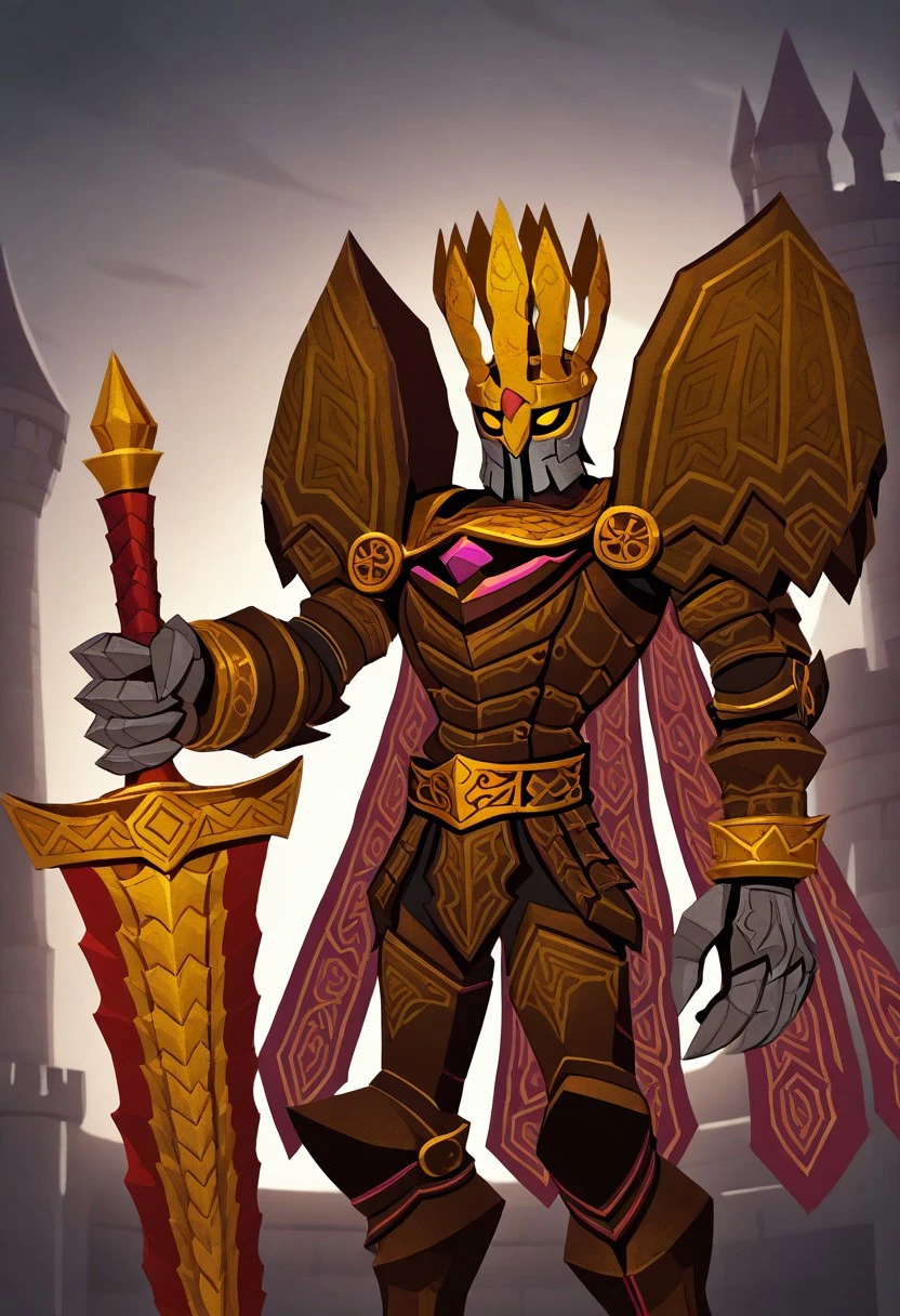 King Arthur, Helmet, Brown Armor, No Face, yellow eyes, gray gloves, holding sword