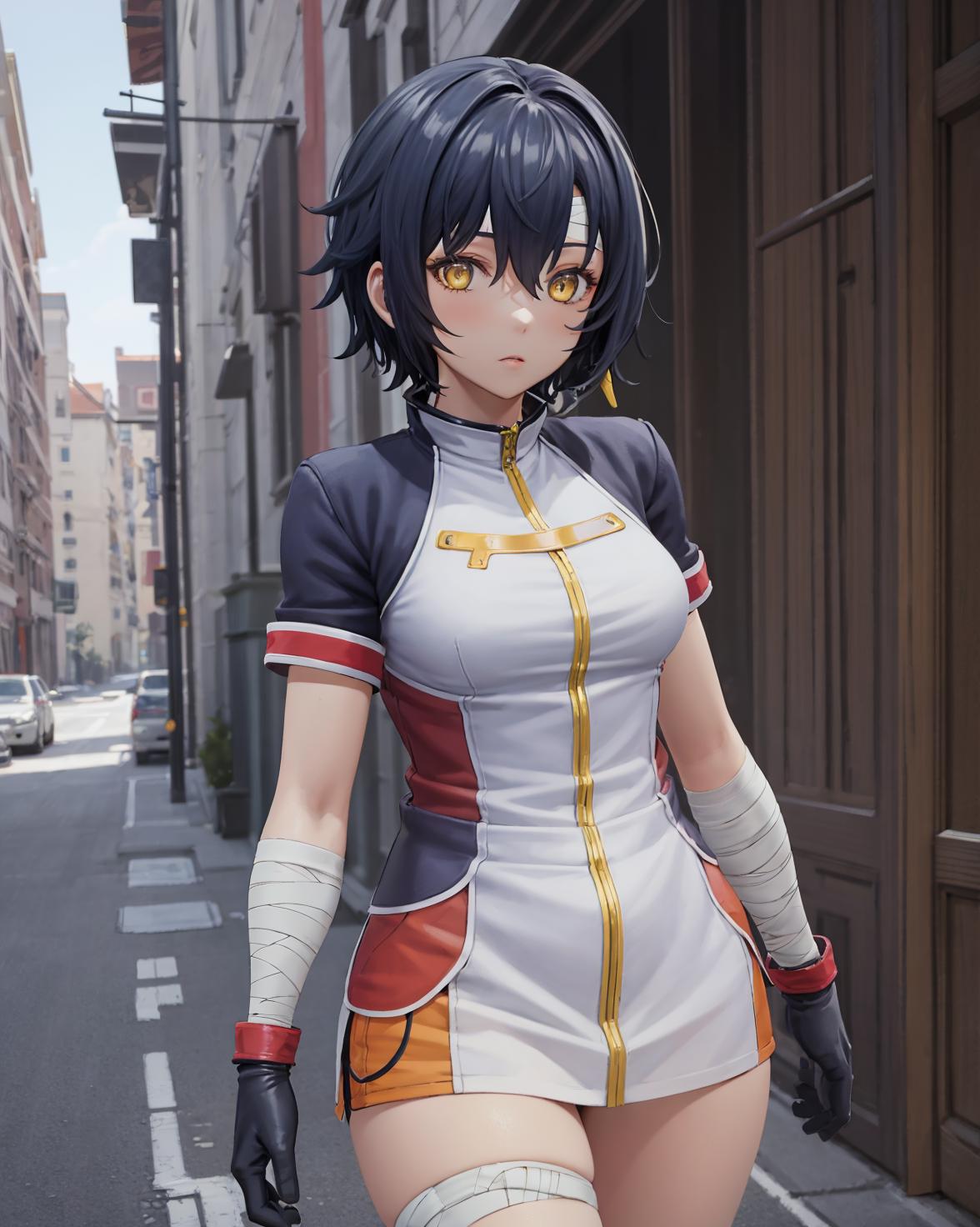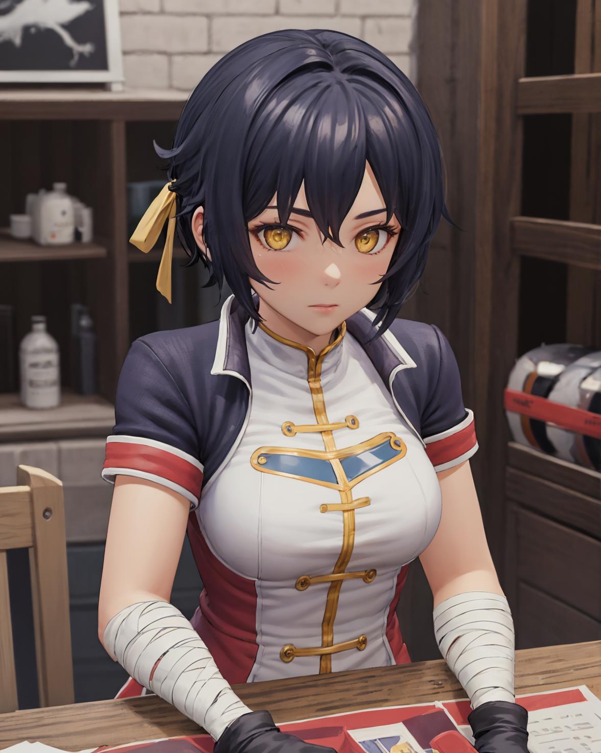 <lora:Lynn-07:0.75>, Lynn, black hair, short hair, yellow eyes, (white headband),