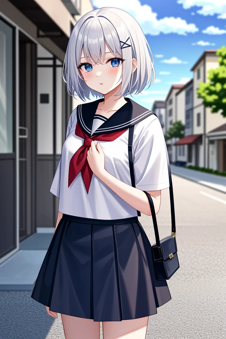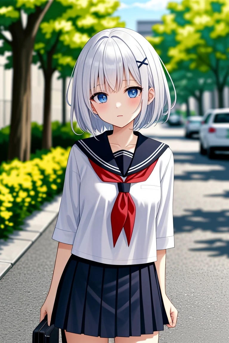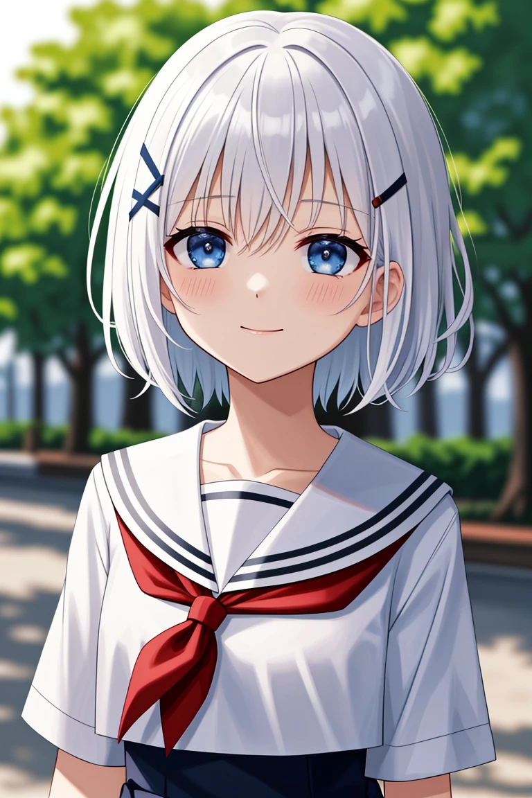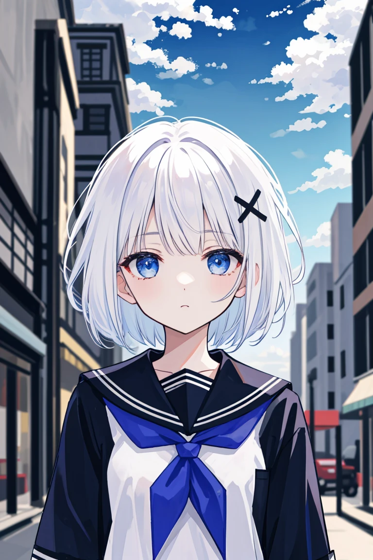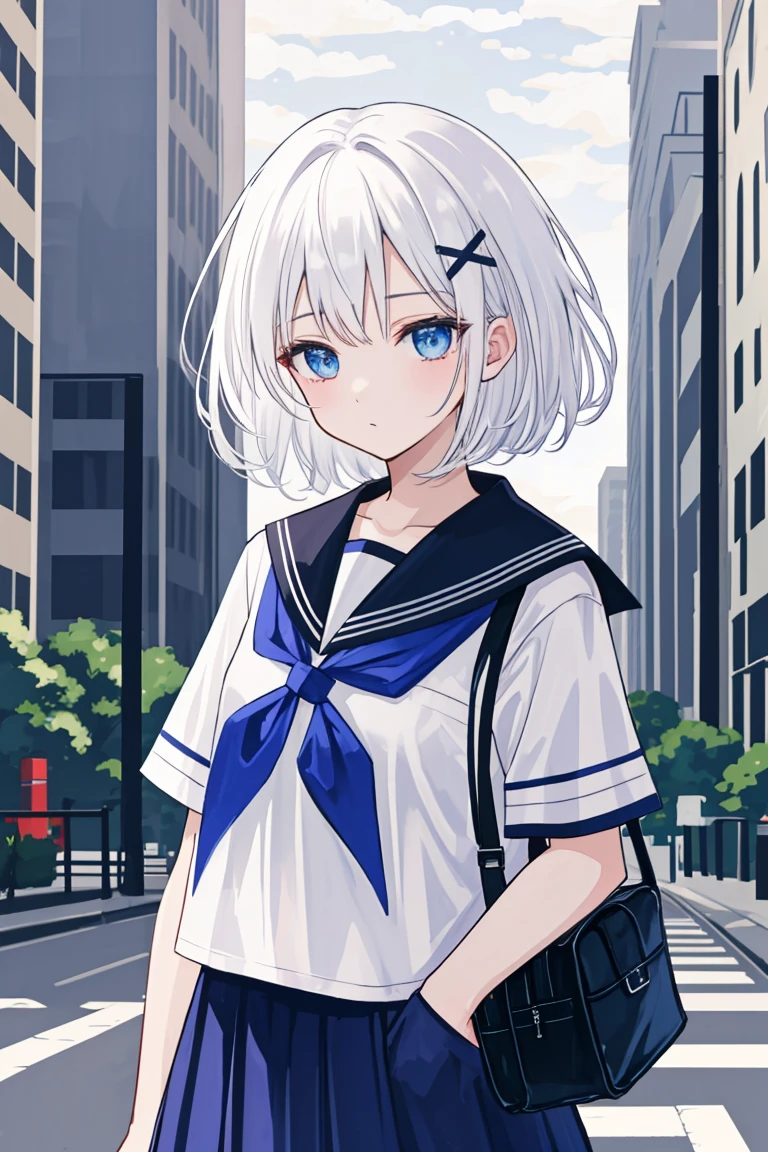 siesta diad, 1girl, short hair, white hair, x hair ornament, blue eyes, neckerchief, serafuku, bangs, red bow, white shirt, skirt