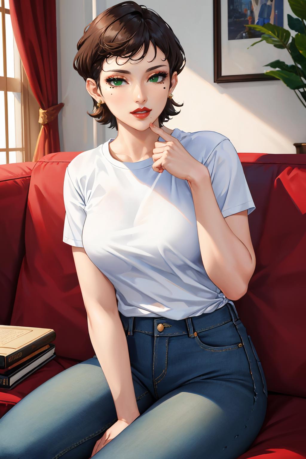 yurikosmt4, bodysuit, short hair, black hair, mole under eyes, green eyes, makeup, red lips