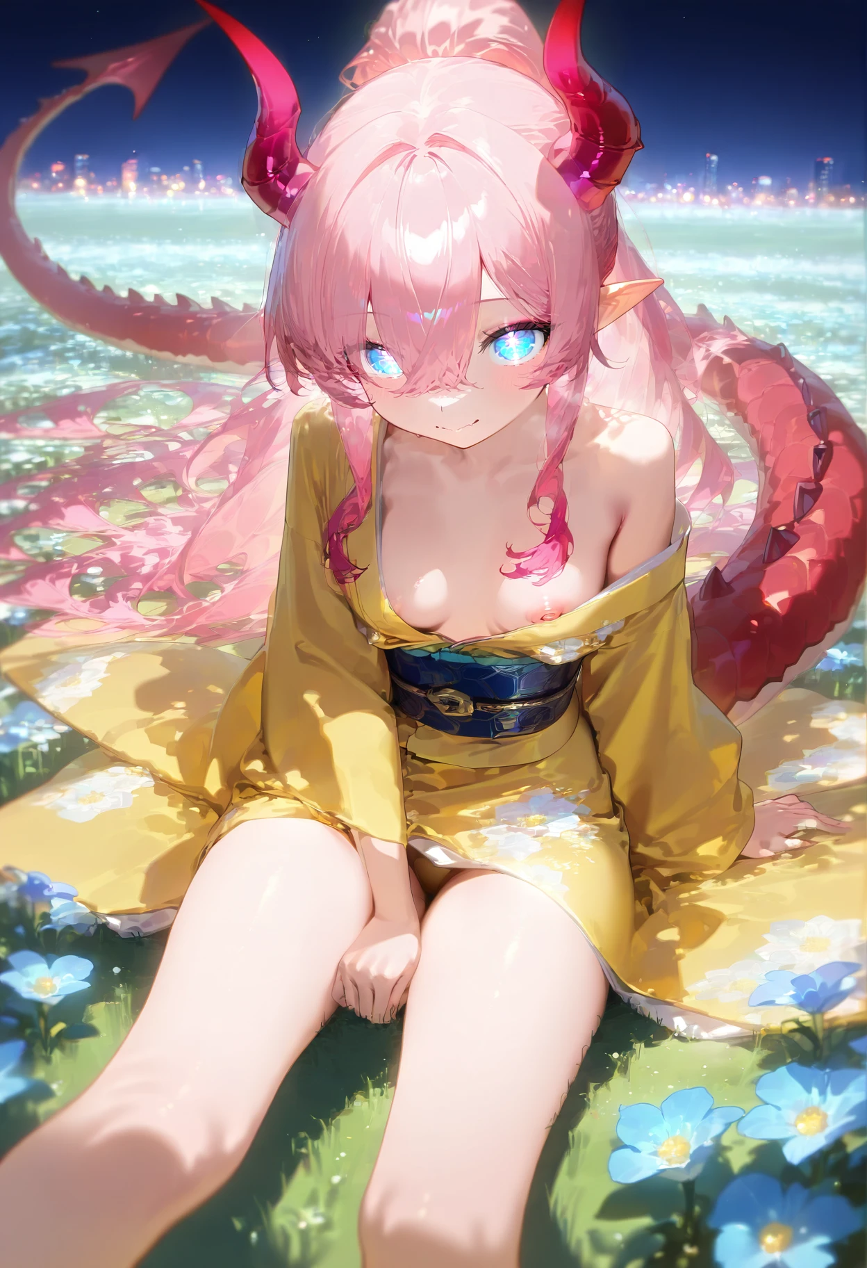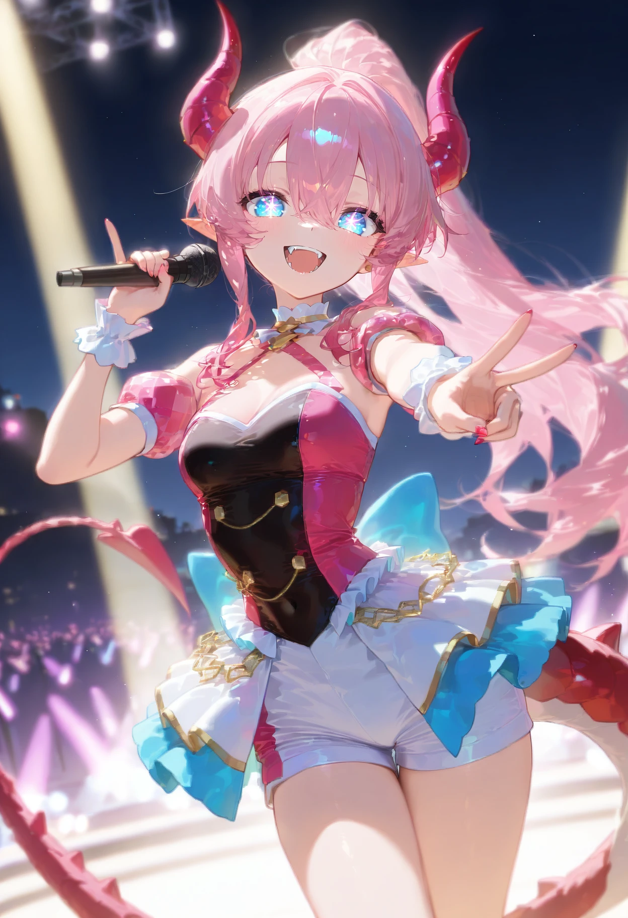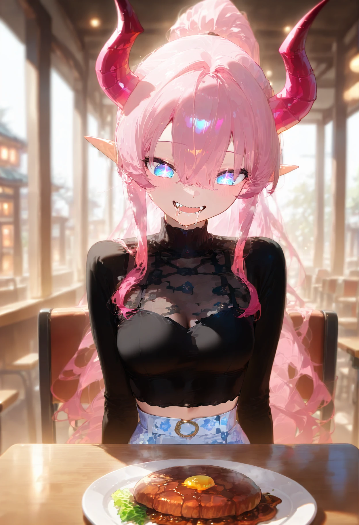 Lynn Pink, blue eyes, ponytail, tail, horns, pointy ears, fangs, (((adult))) small breasts