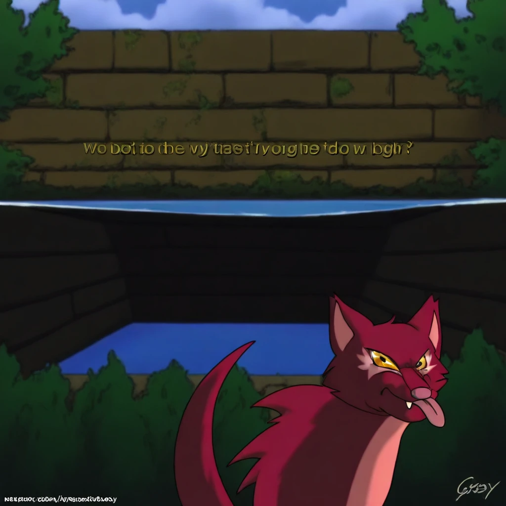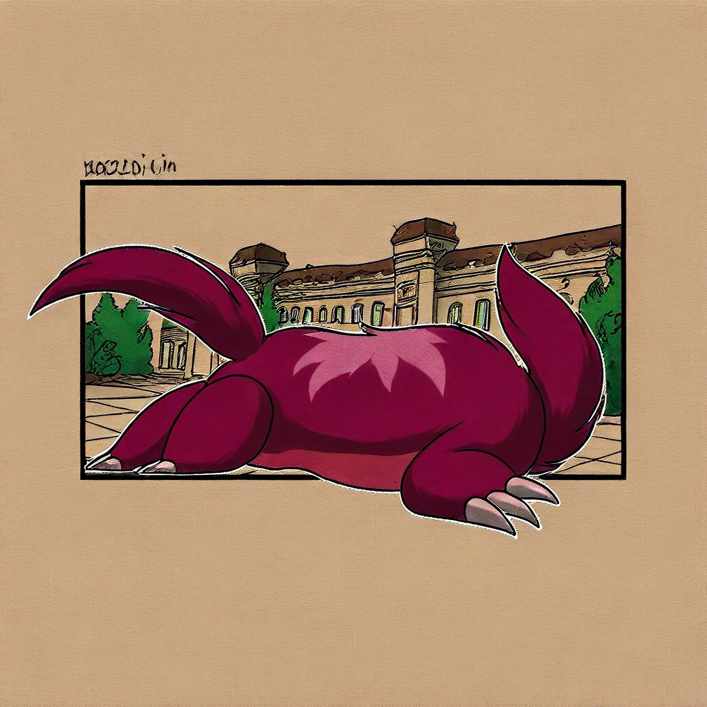 lavender neck tuft, pointy ears, short ears, brown nose, maroon fur, maroon body, lavender eye markings, green forehead gem, gold eyes, no pupils, empty eyes, big claws, six pink electric spikes on its back