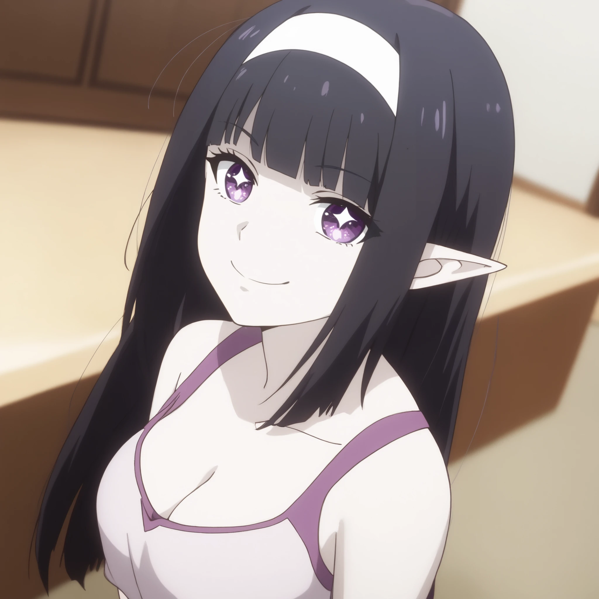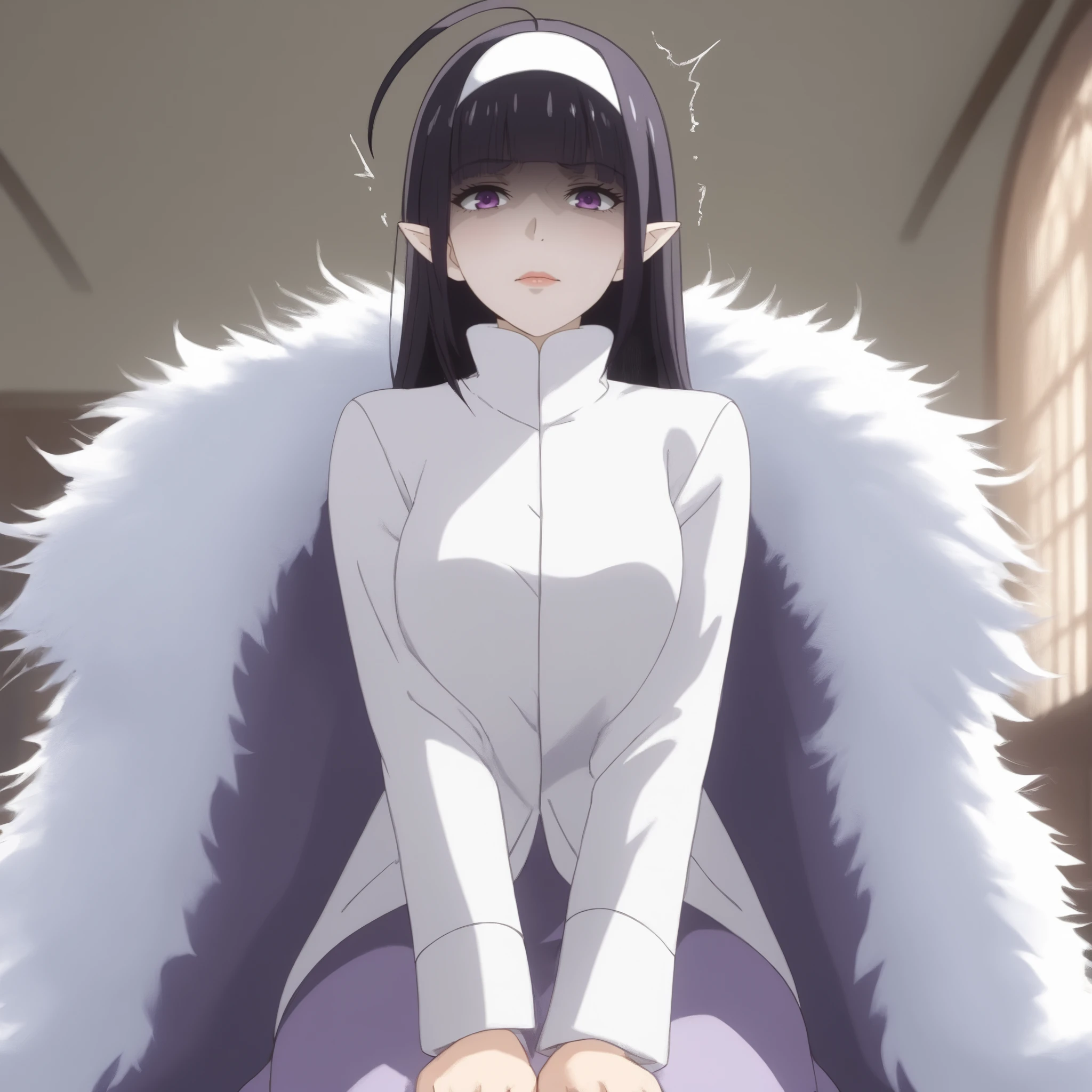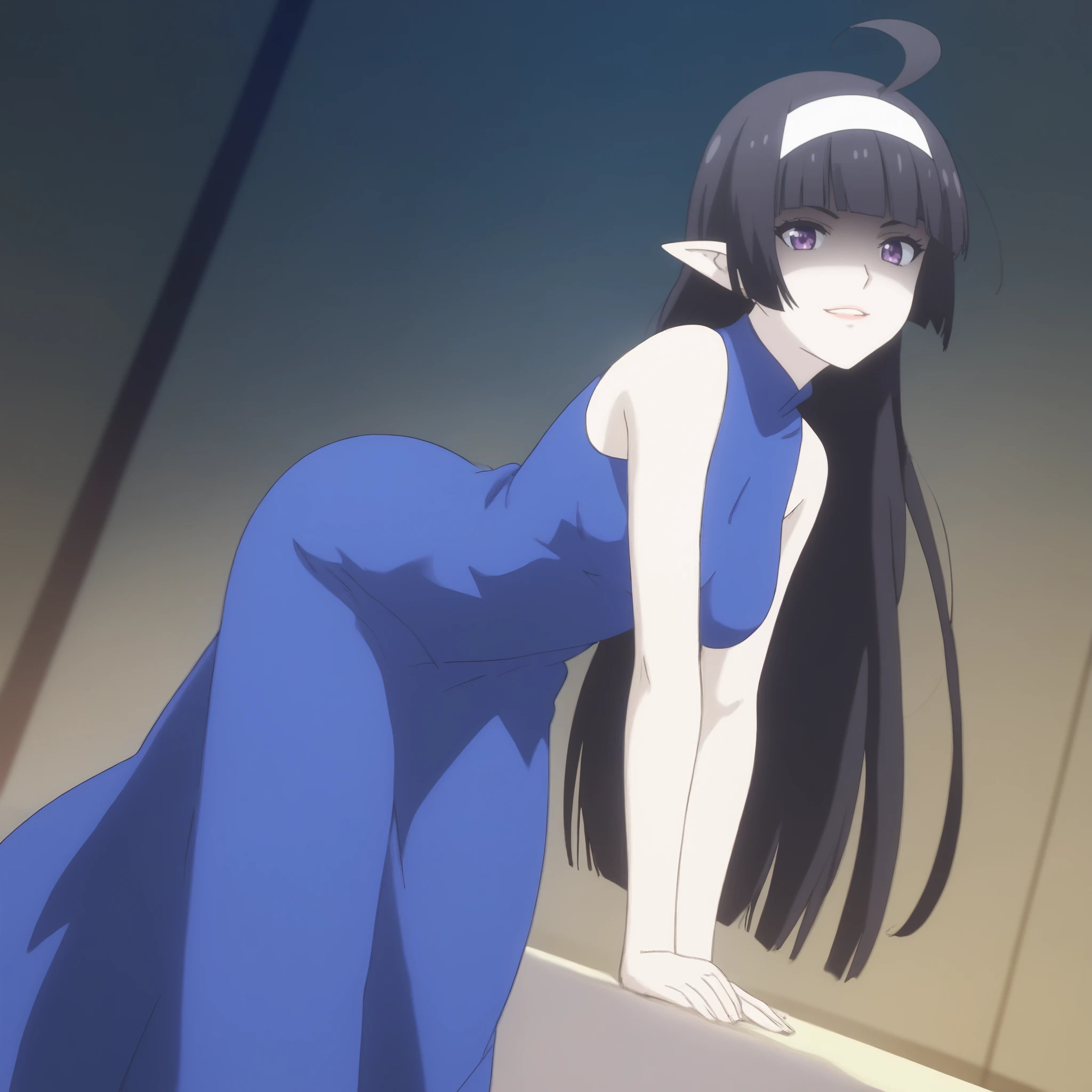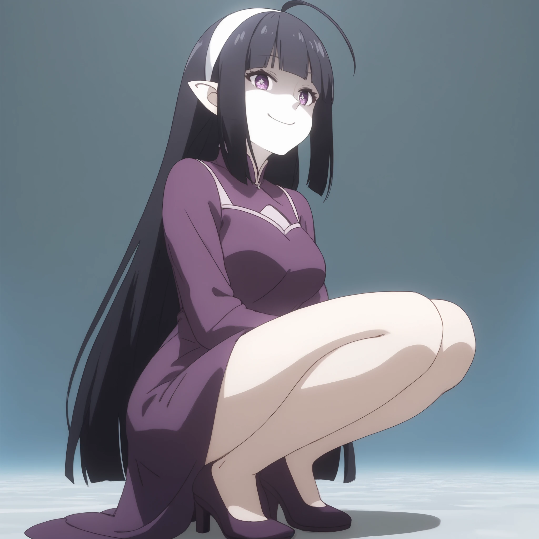 ReMonsterFu, purple eyes, black hair, very long hair, white hairband, blunt bangs, pale skin, shaded face, pointy ears, ahoge,