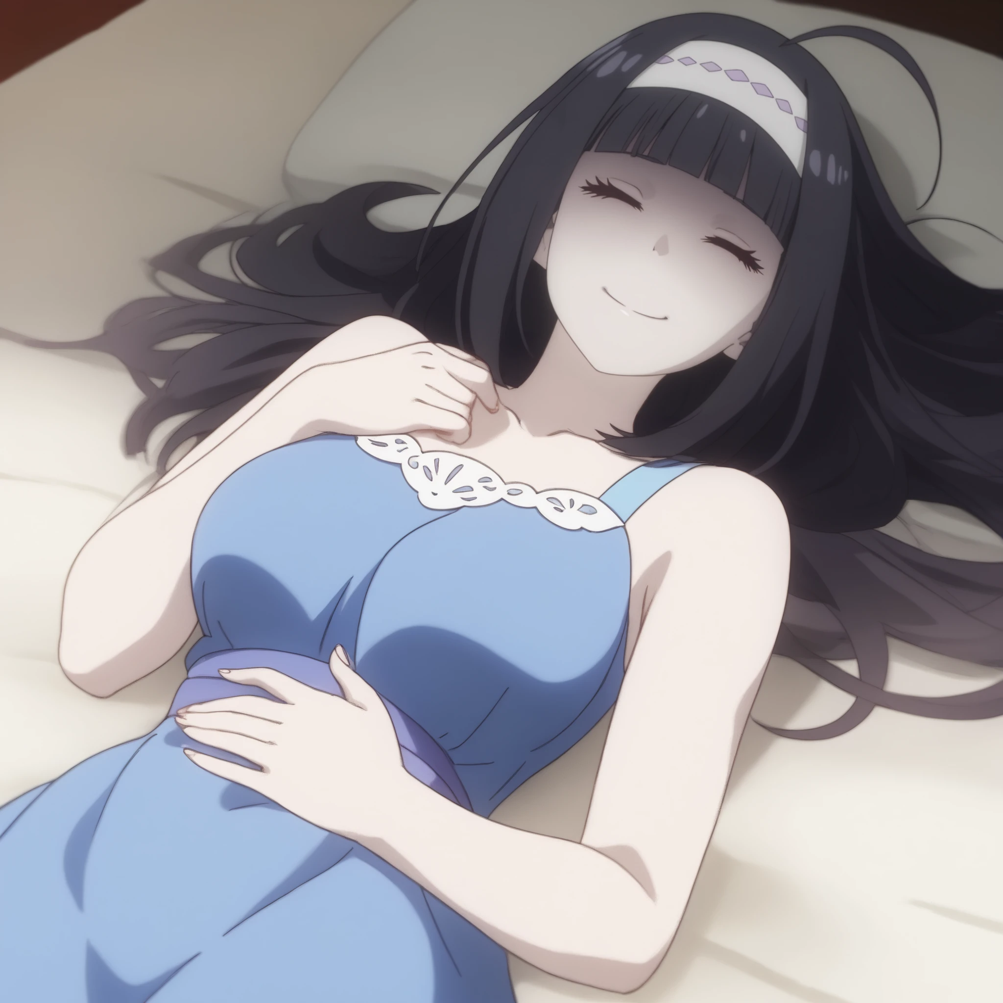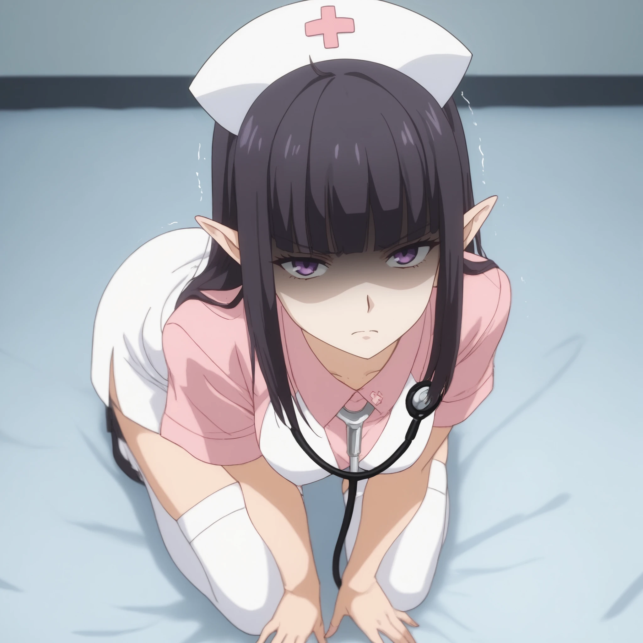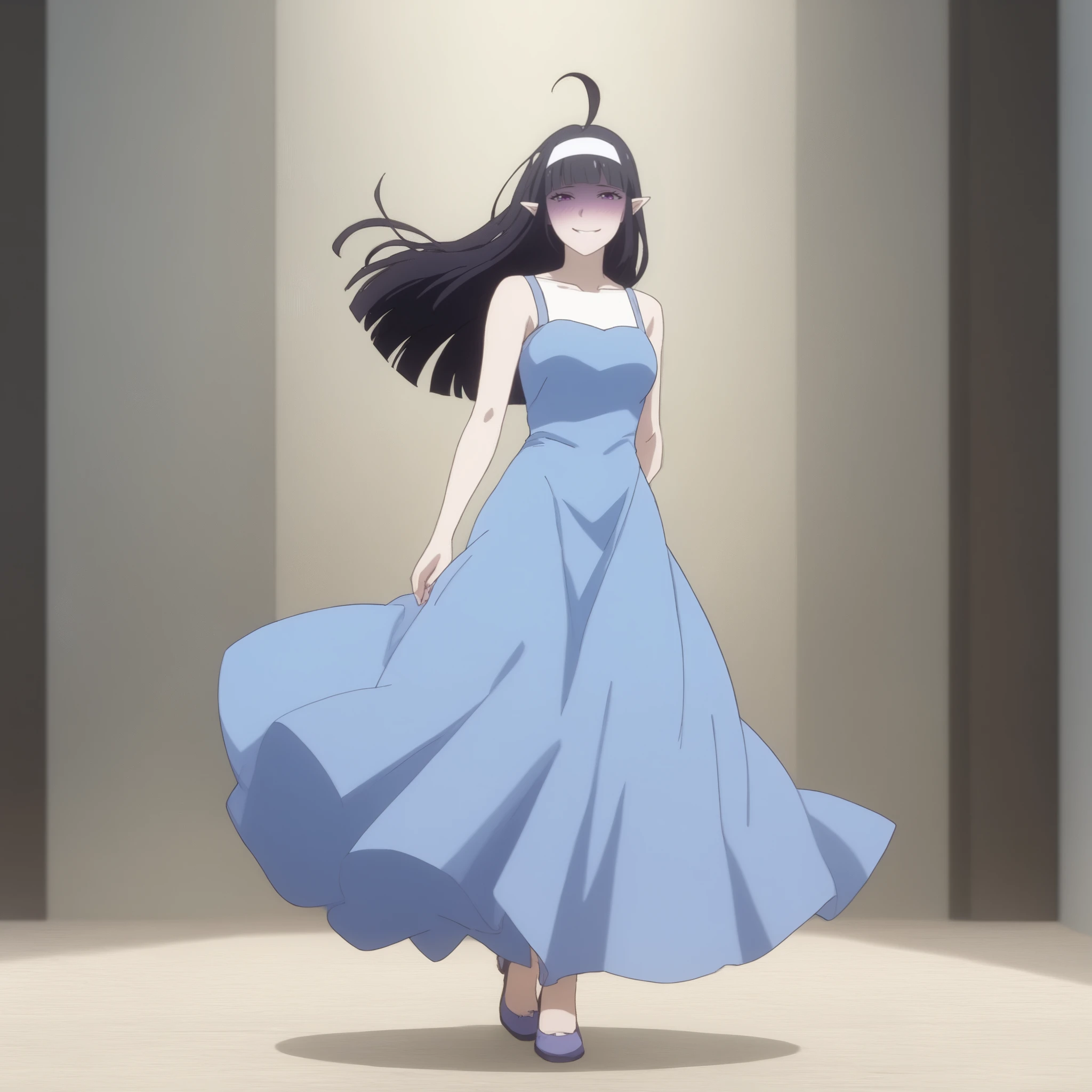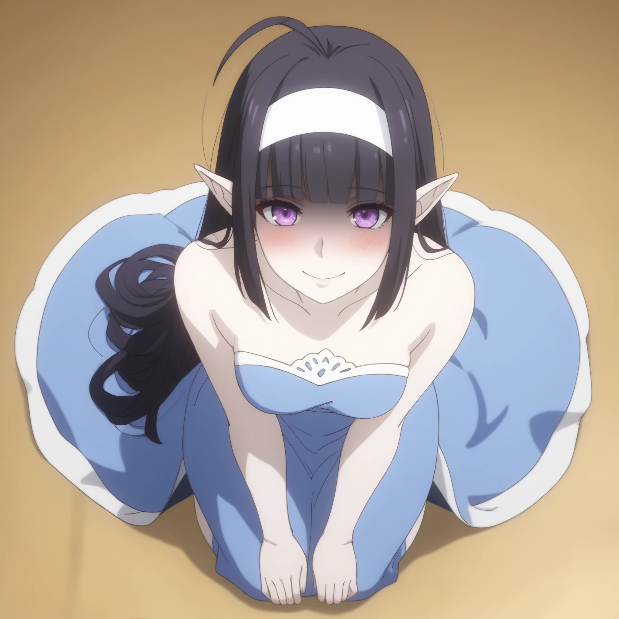 ReMonsterFu, purple eyes, black hair, very long hair, white hairband, blunt bangs, pale skin, shaded face, pointy ears, ahoge,