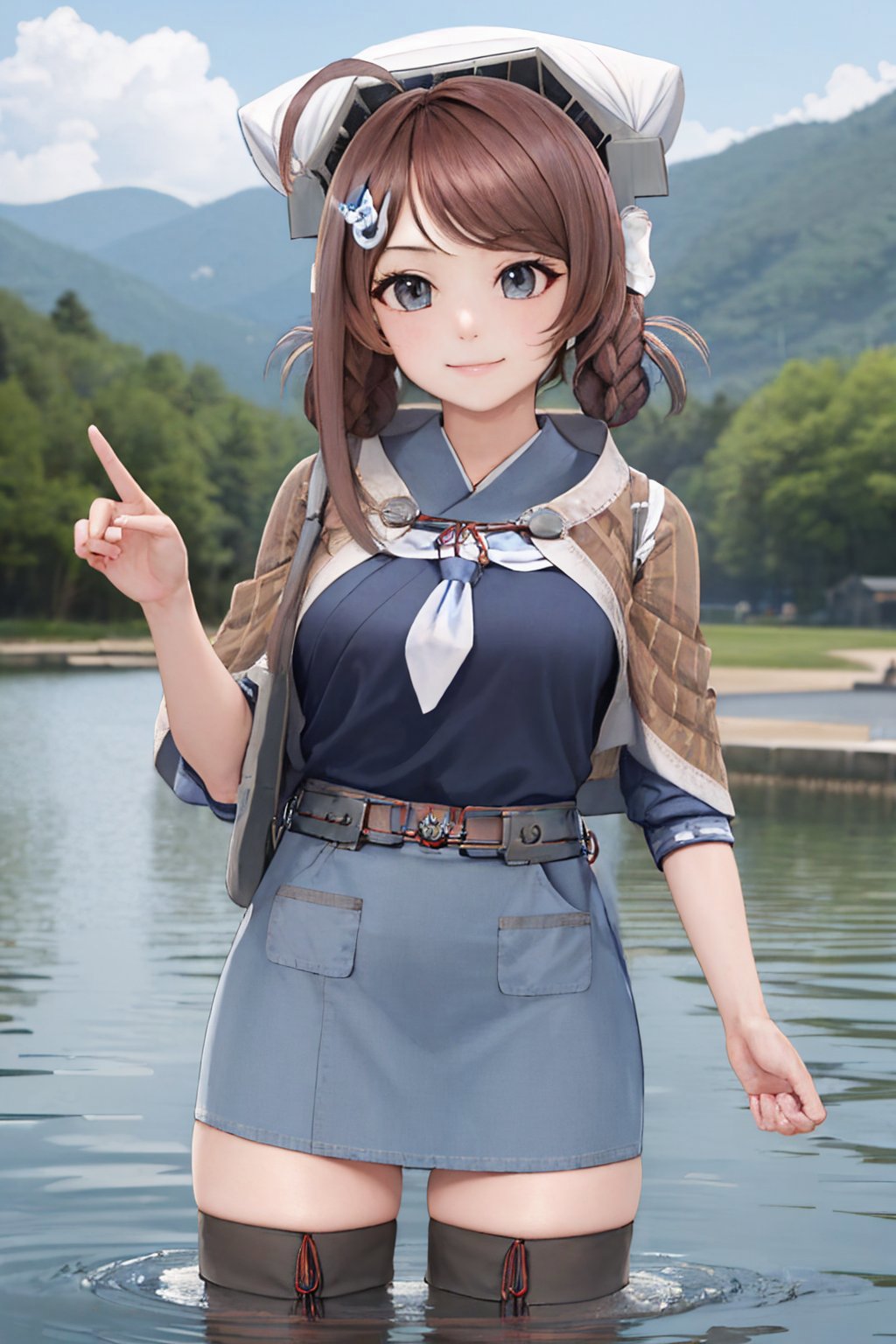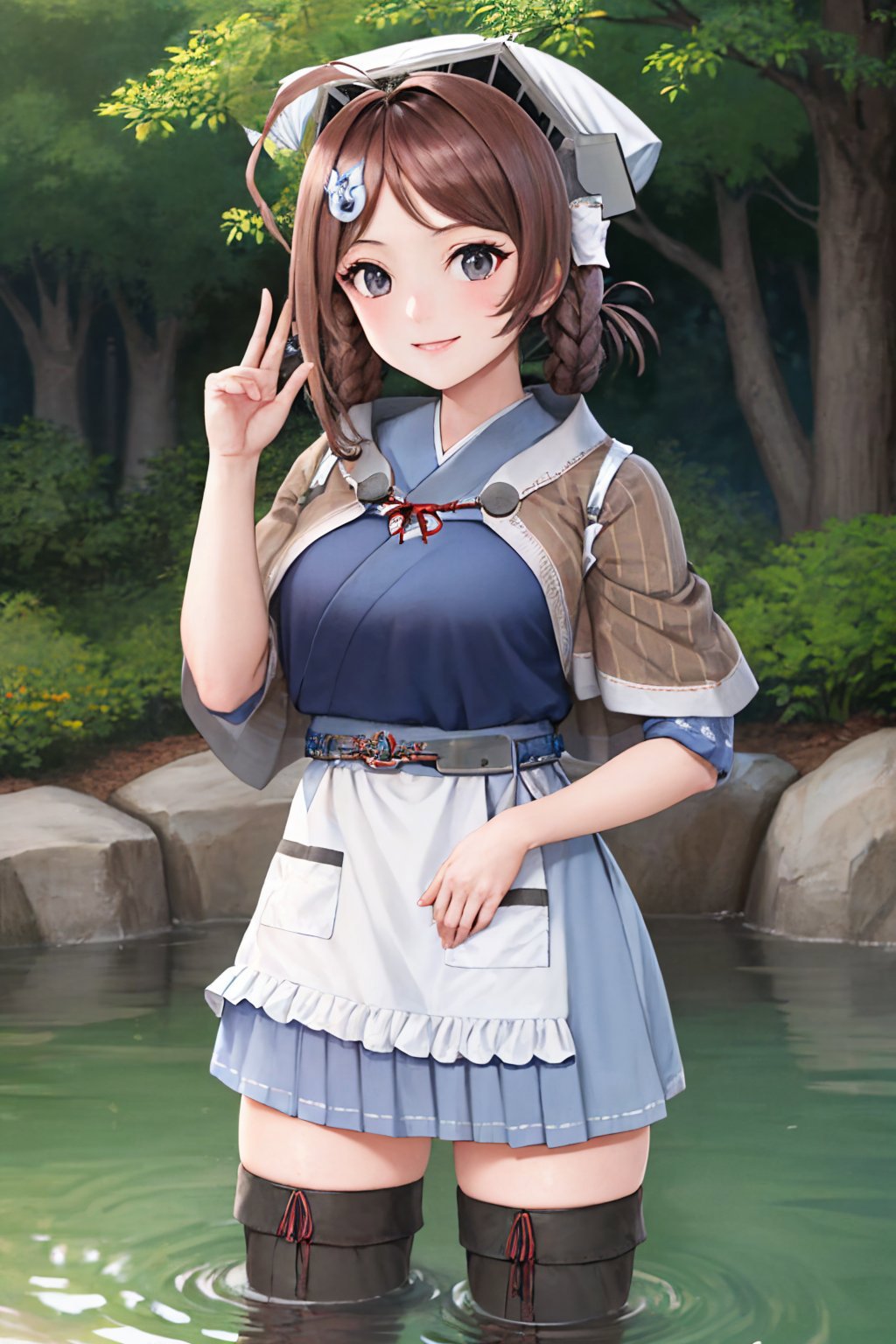 Default Outfit: bandana, headgear, school uniform, blue serafuku, shawl, waist apron, blue skirt, thighhighs