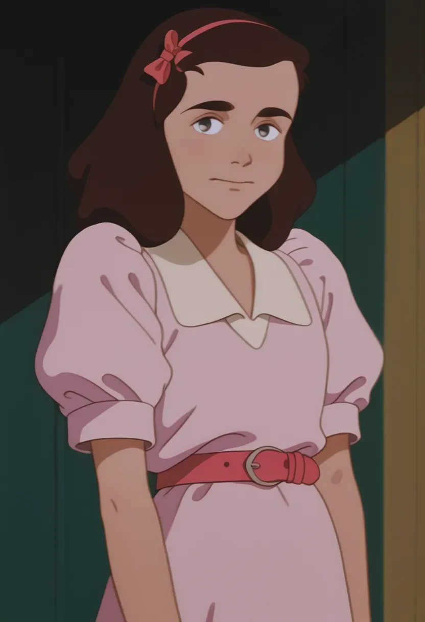An9e90n1kk1, brown hair, thick eyebrows, pink hairband, hair bow, pink dress, puffy sleeves