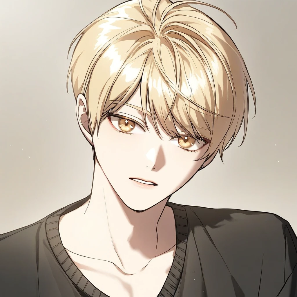Doryeong Han, 1 boy, he has short blond hair, and golden colored eyes, his skin is fair. His body is slim and athletic