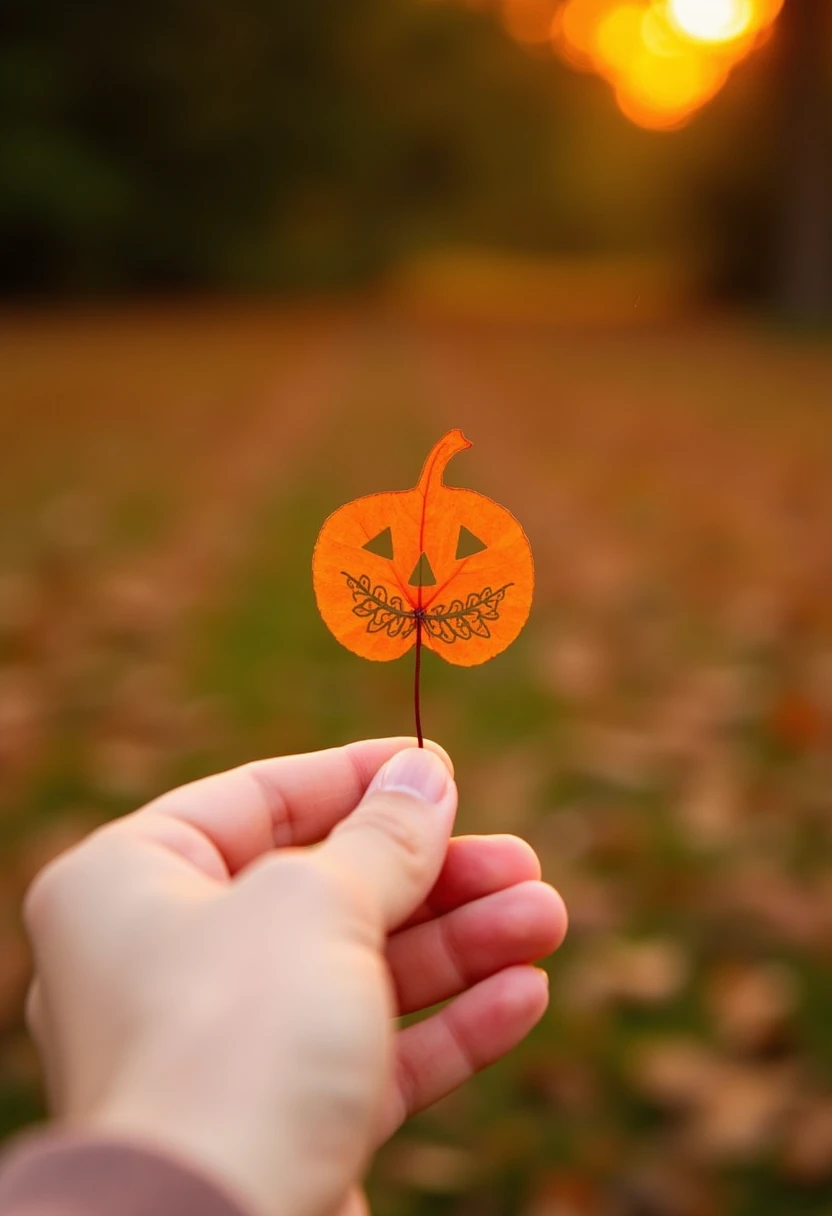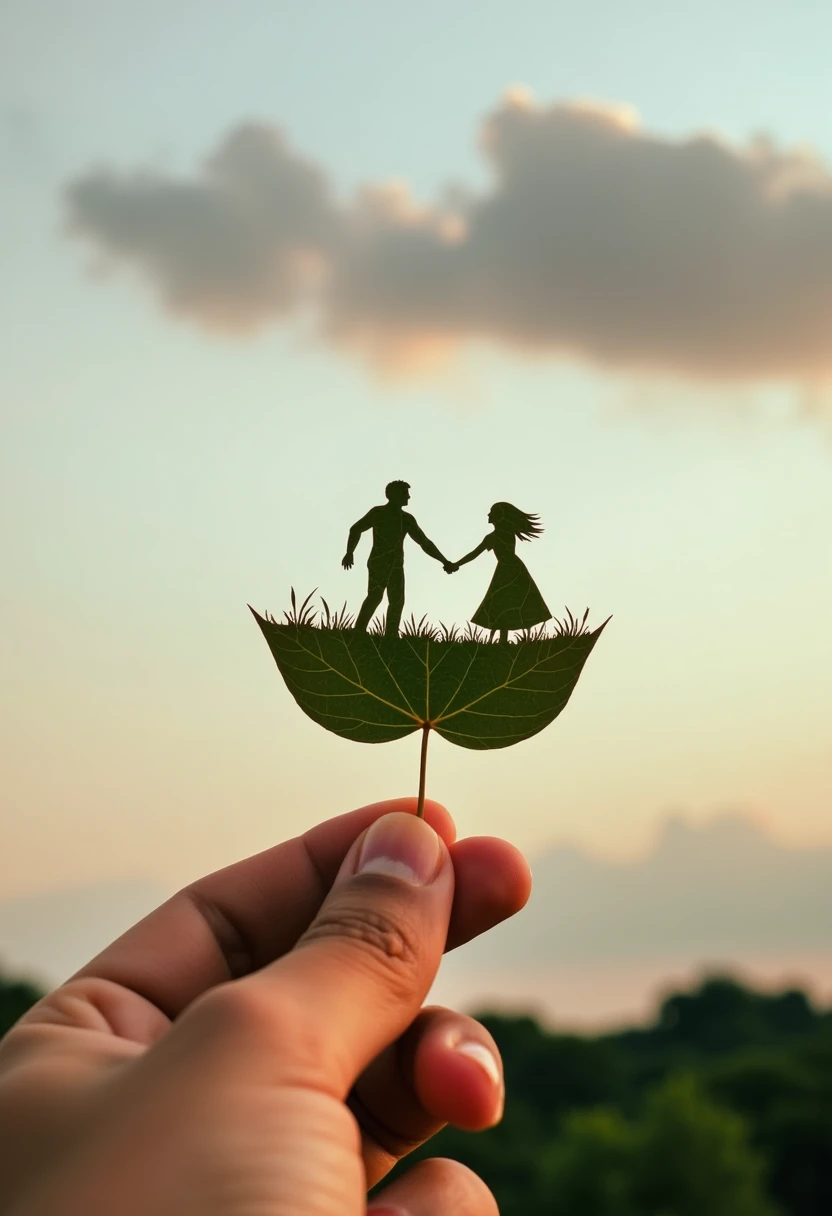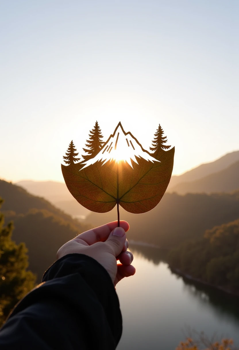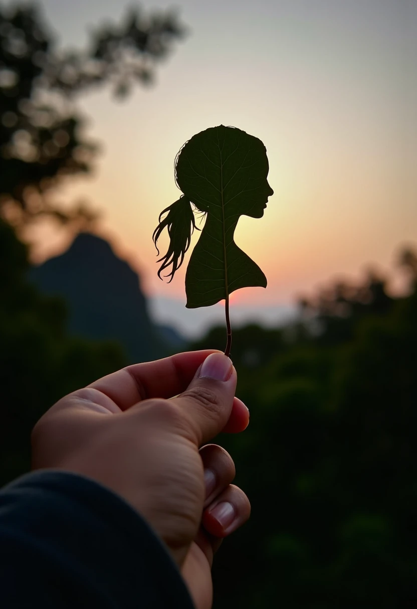 The image is a photograph capturing a person's hand holding a small, intricately cut leaf of SUBJECT AND DESCRIPTION