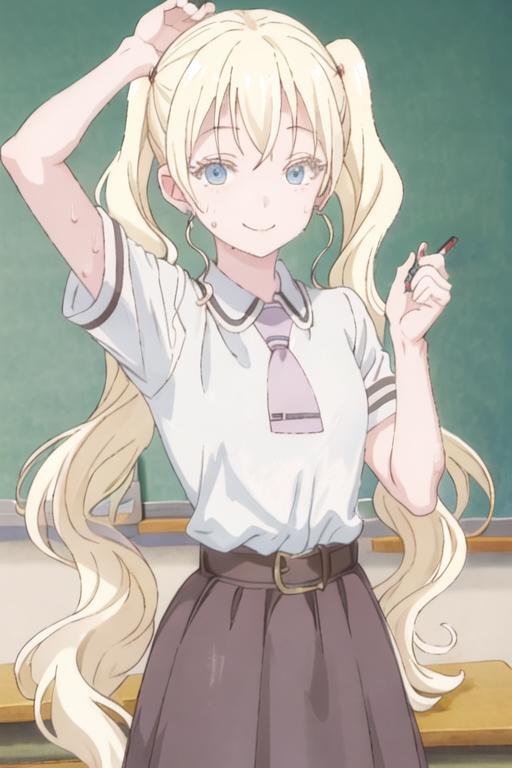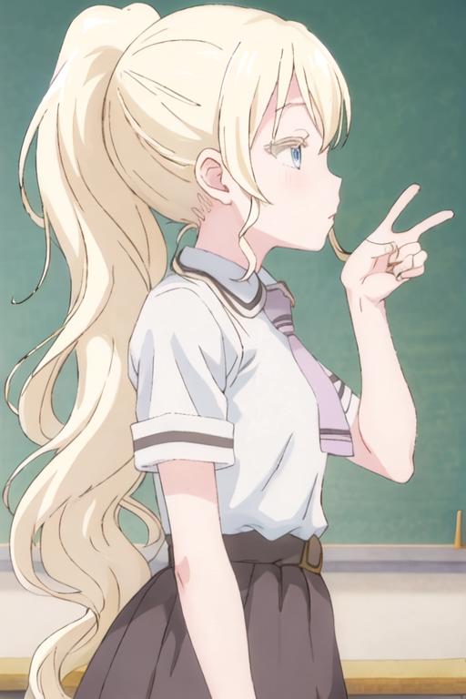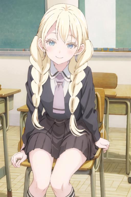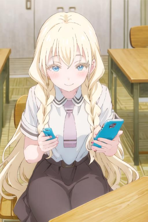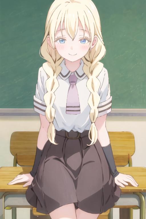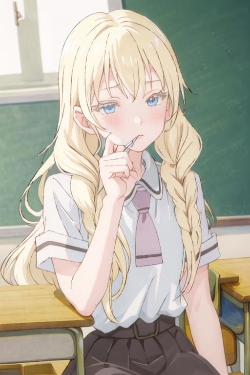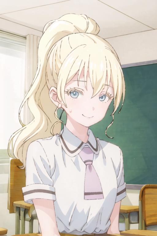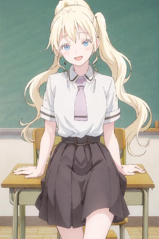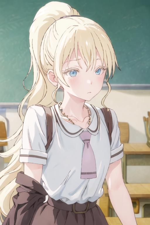 The trigger word is olivia_asobiasobase, and the recommended tags are best quality, masterpiece, highres, solo, {olivia_asobiasobase:1.15}, blonde_hair, long_hair, blue_eyes, necktie, indoors.