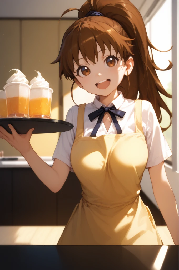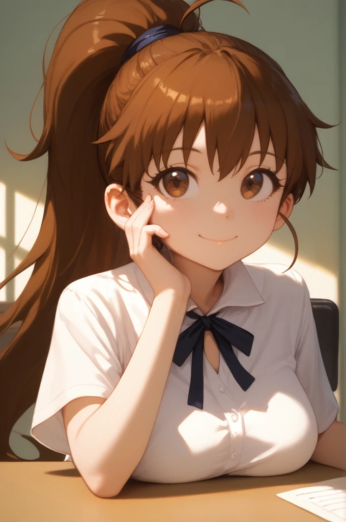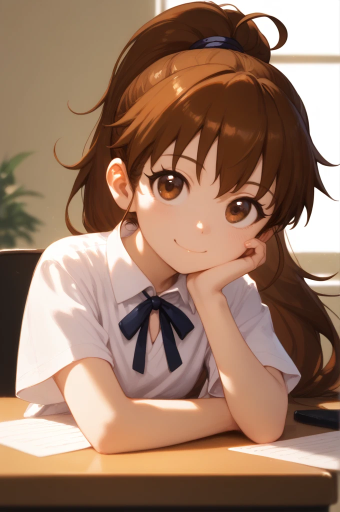 taneshima popura,long hair,ponytail,brown hair,brown eyes,white shirt,collared shirt,short sleeves,neck ribbon,