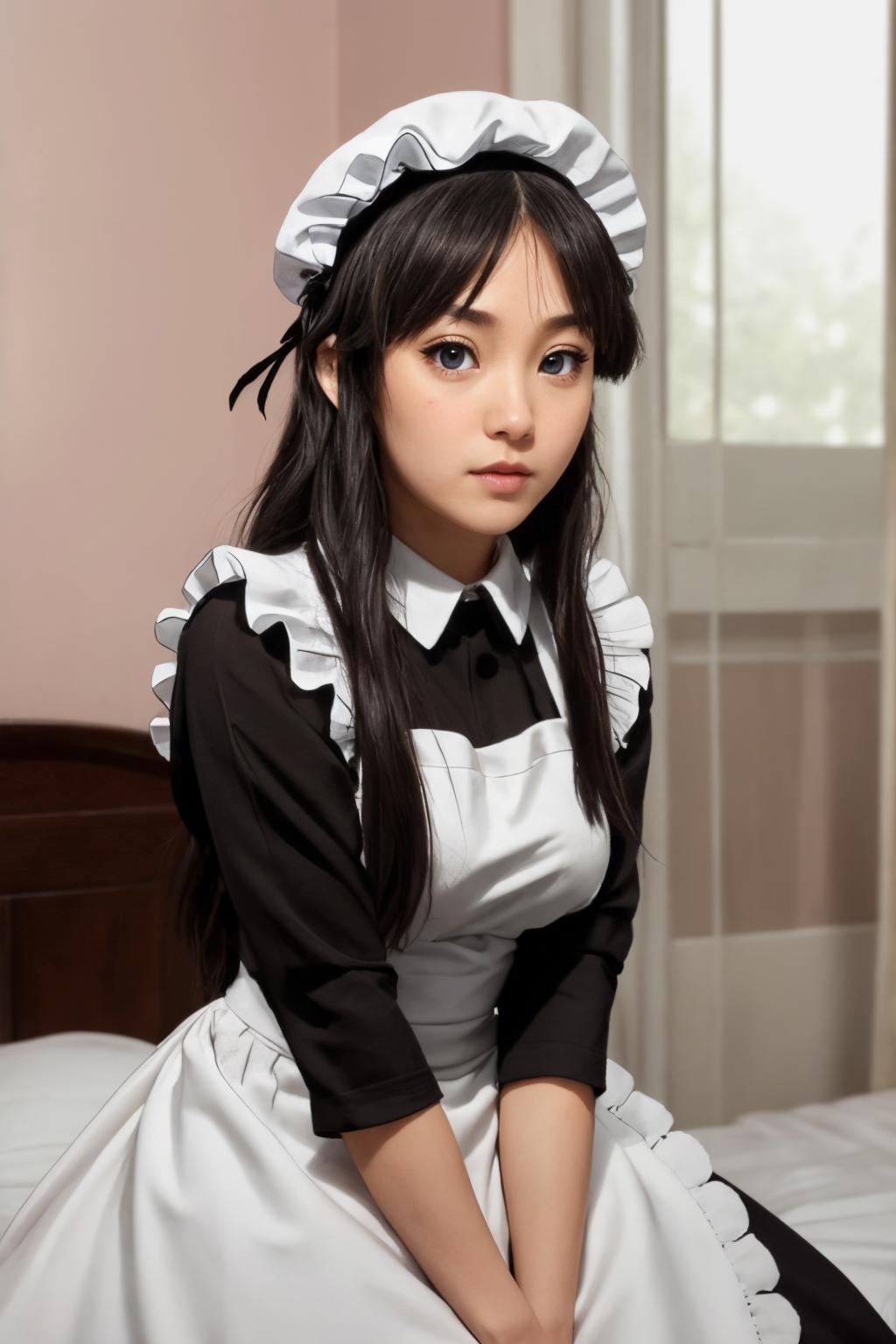 1girl, solo, long hair, black hair, hat, grey eyes, maid, maid headdress, enmaided
