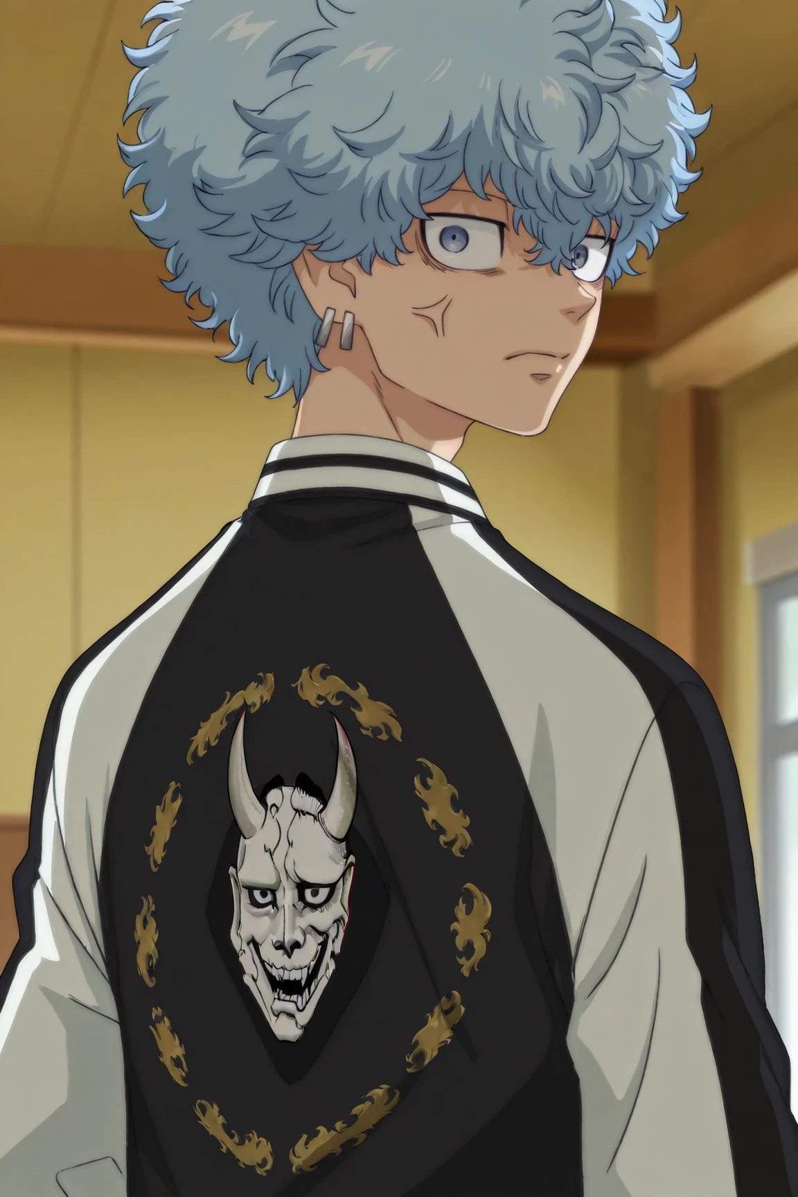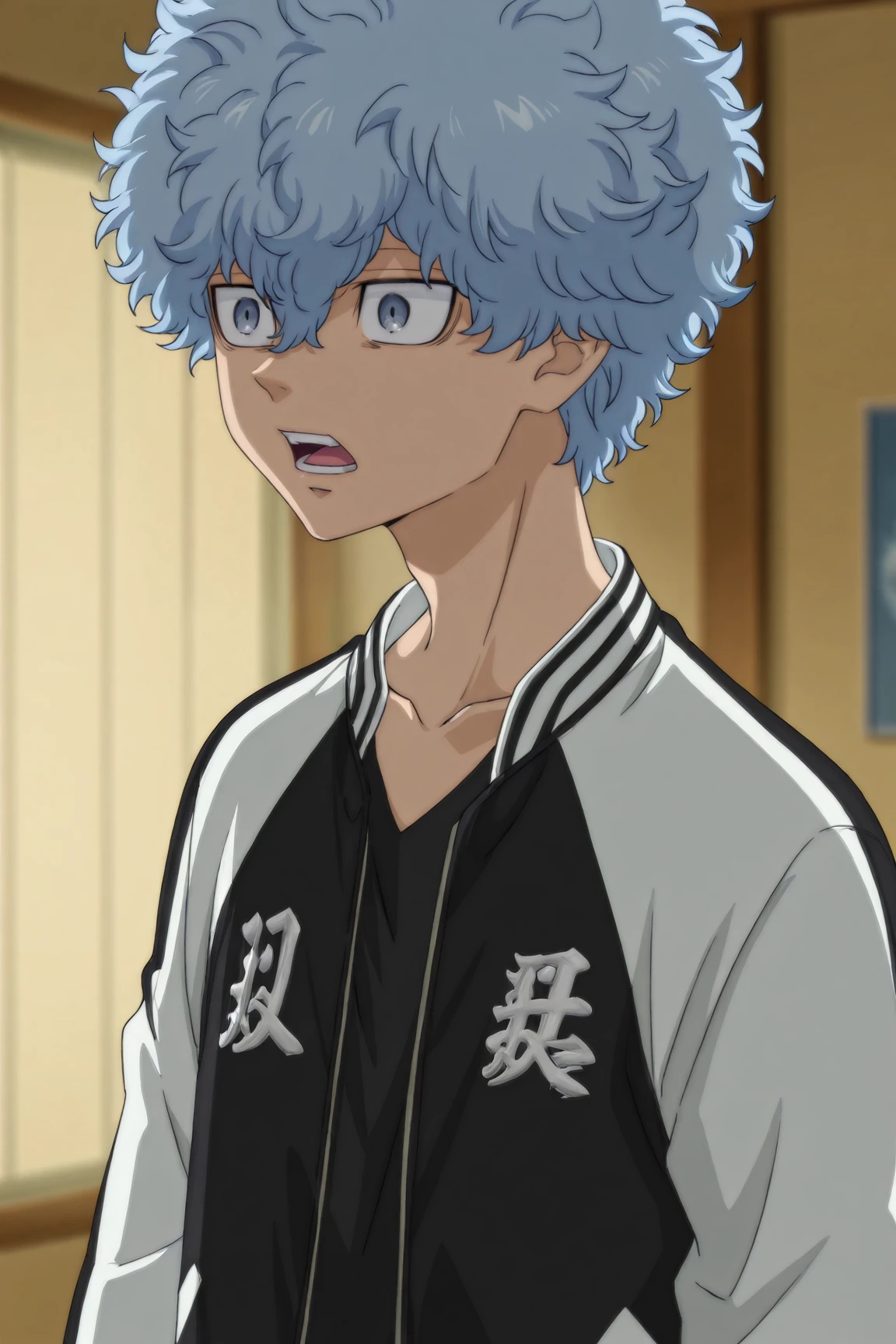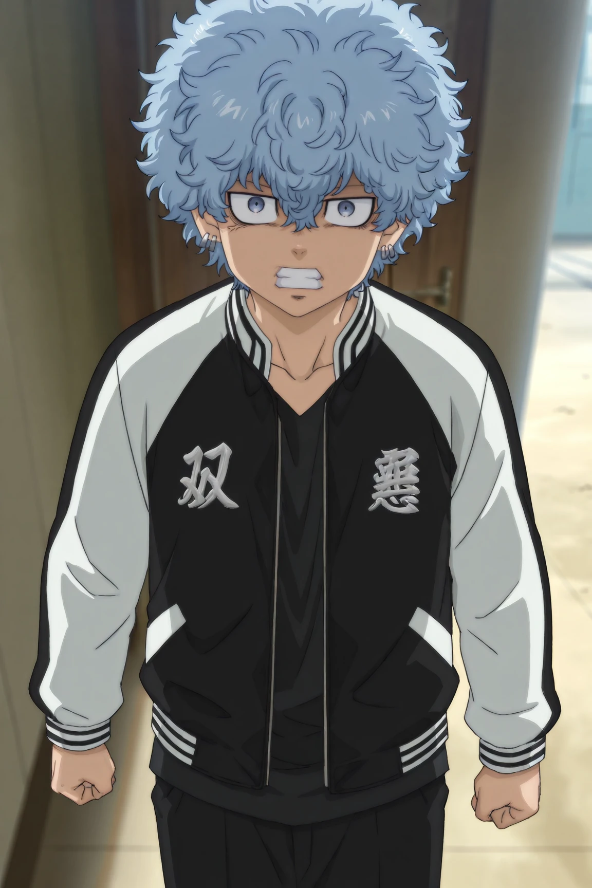 two-tone jacket, black shirt, black pants, white shoes