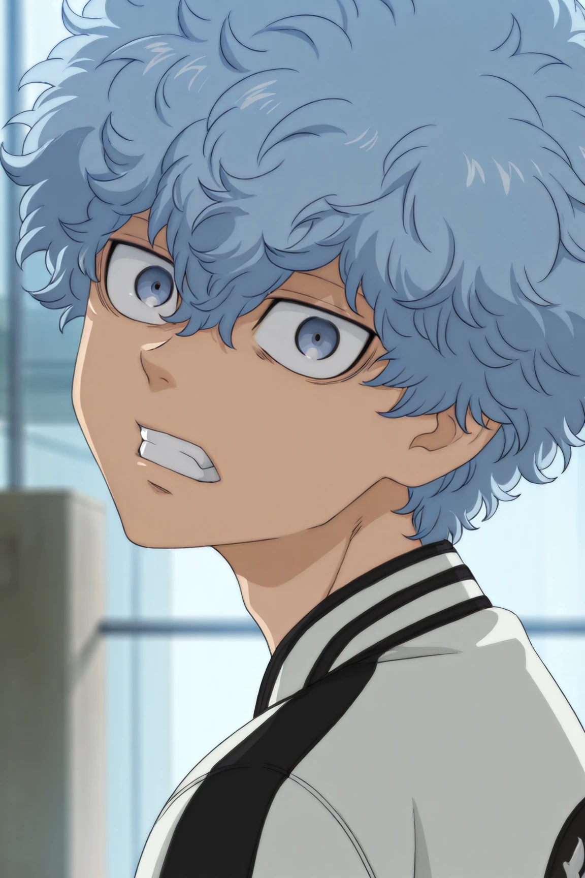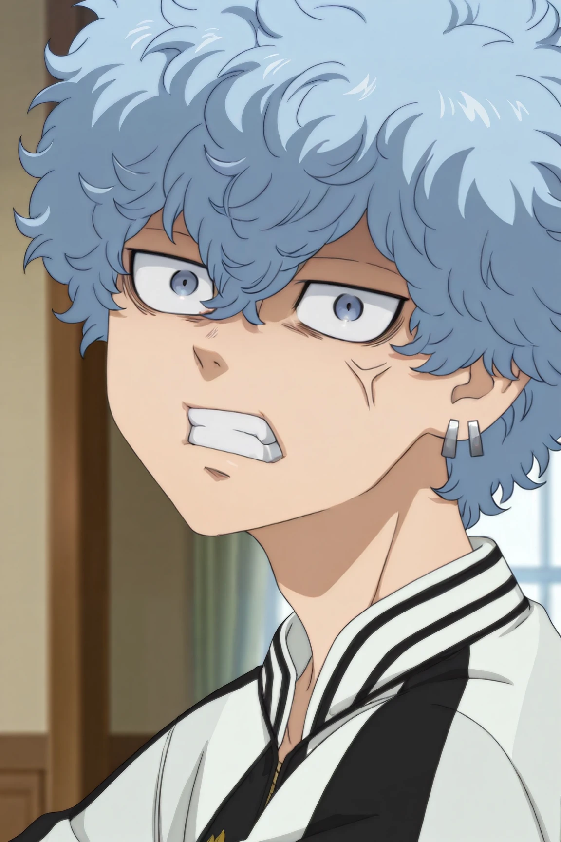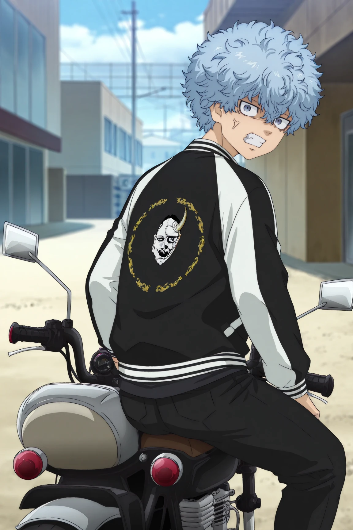 two-tone jacket, black shirt, black pants, white shoes