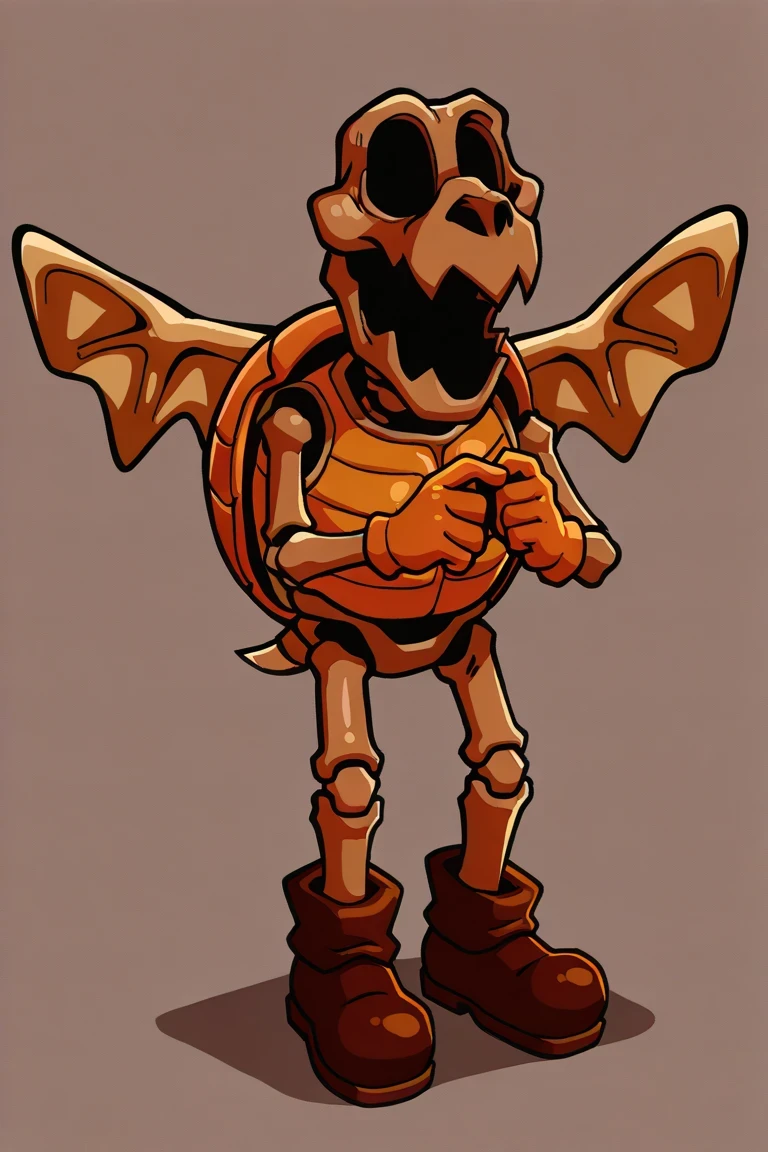 JohnDickMM, 1boy, dry bones, skeleton, shelled, orange-gray shell, short tail, hollow eyes, orange-gray gloves, brown shoes, large orange-gray wings, hollow mouth, horror