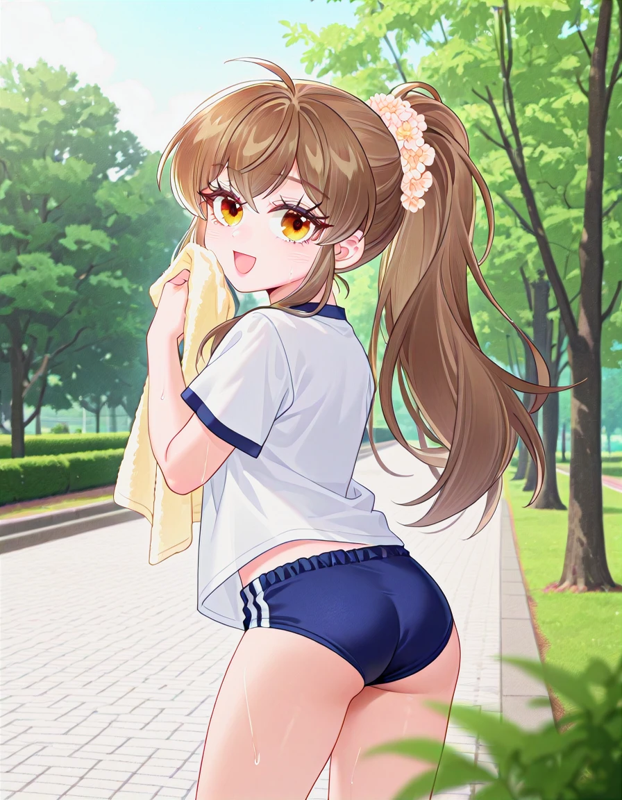 Costume Tag: hair ornament, hair flower, yellow hanfu, frill, wide sleeves, choker, double bun