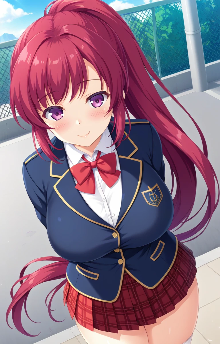 トリガー(Trigger):asamikei, [red hair:pink hair:0.4], long hair, ponytail, purple eyes, huge breasts
