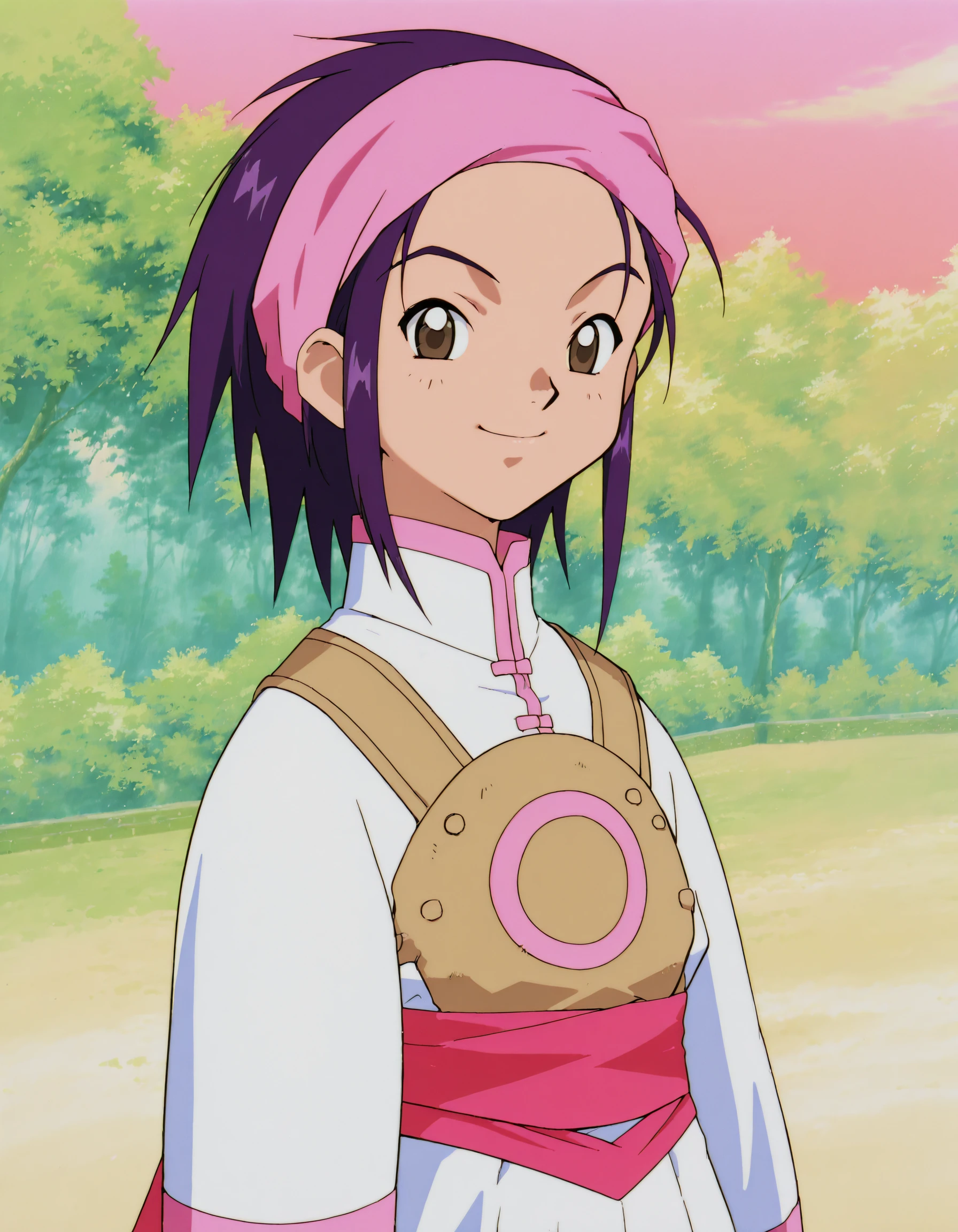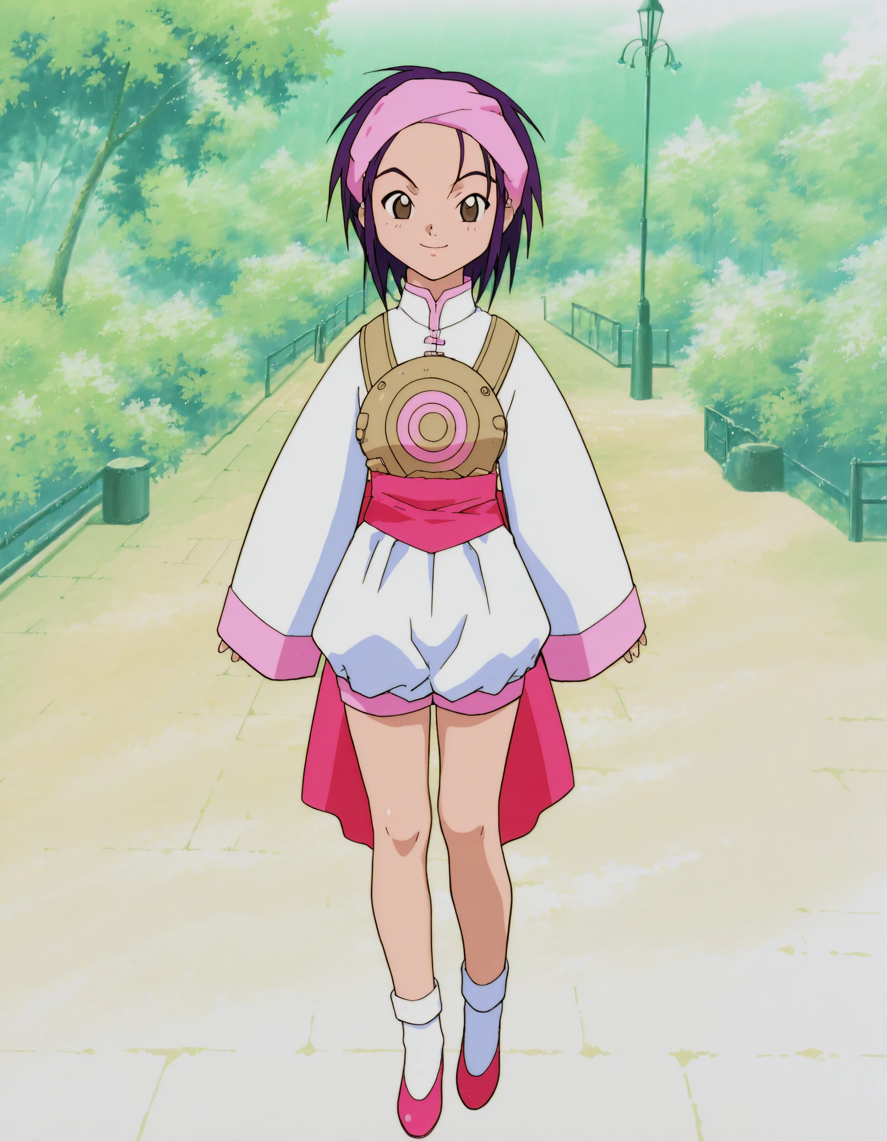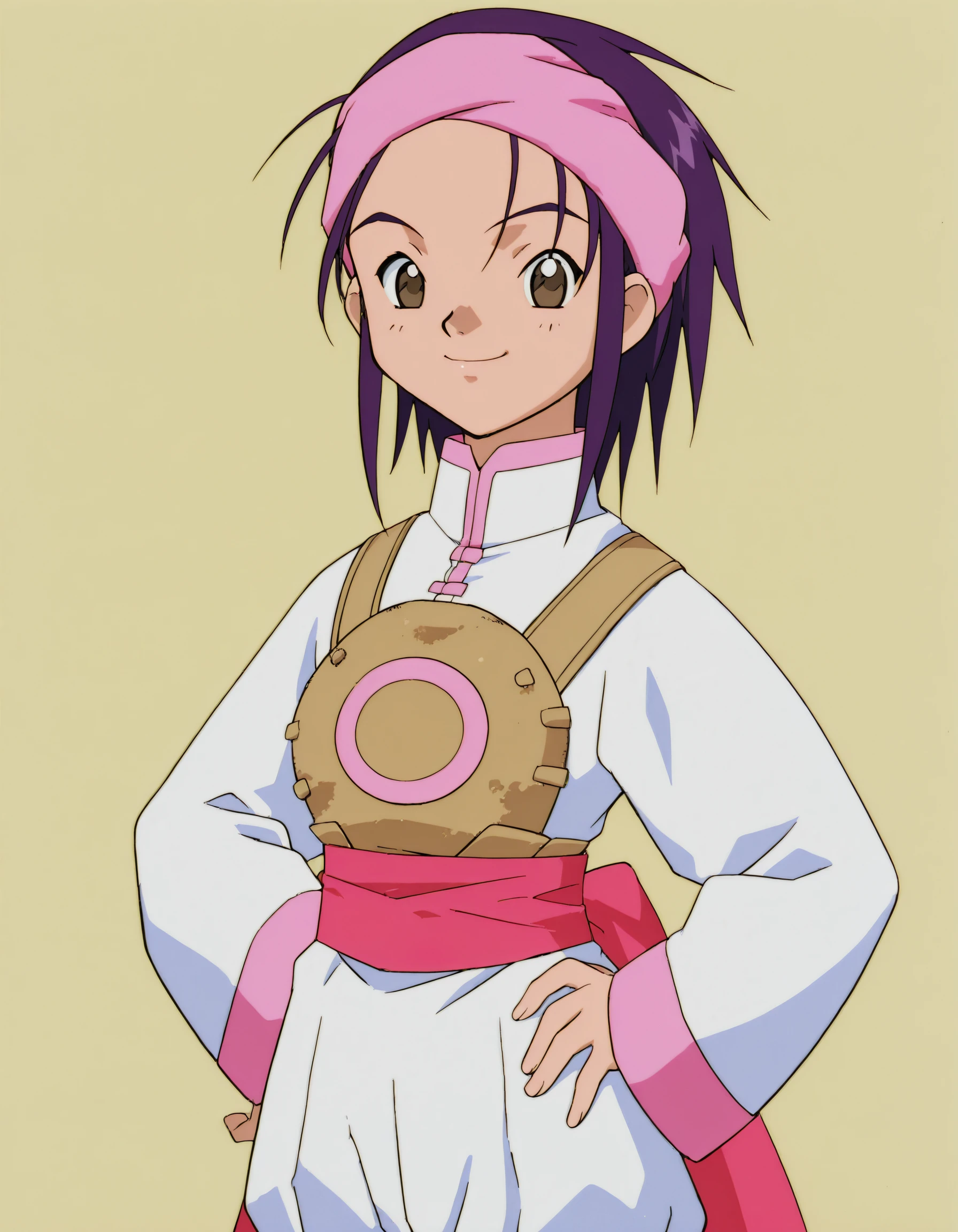 hanmyo, 1girl, retro artstyle, martial arts uniform, short hair, purple hair, solo, long sleeves, brown eyes, headband, smile, sash,pink footwear