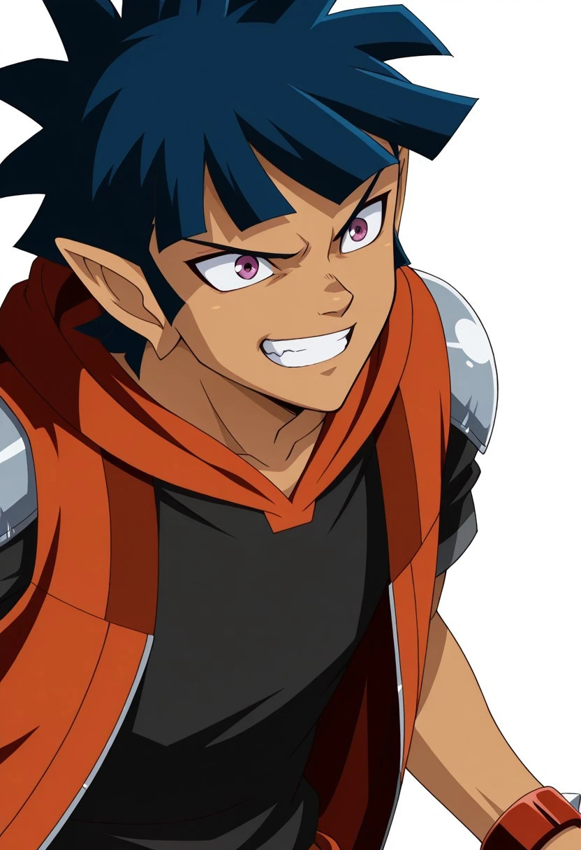 1boy, male focus, blue hair, purple eyes, spiked hair, dark skin, pointy ears,
