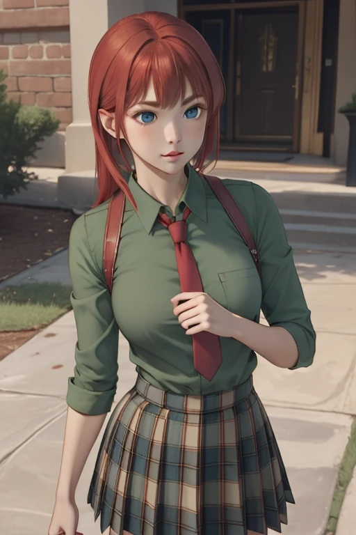 AlyssaCCT3, green shirt, red tie, checkered skirt, red hair
