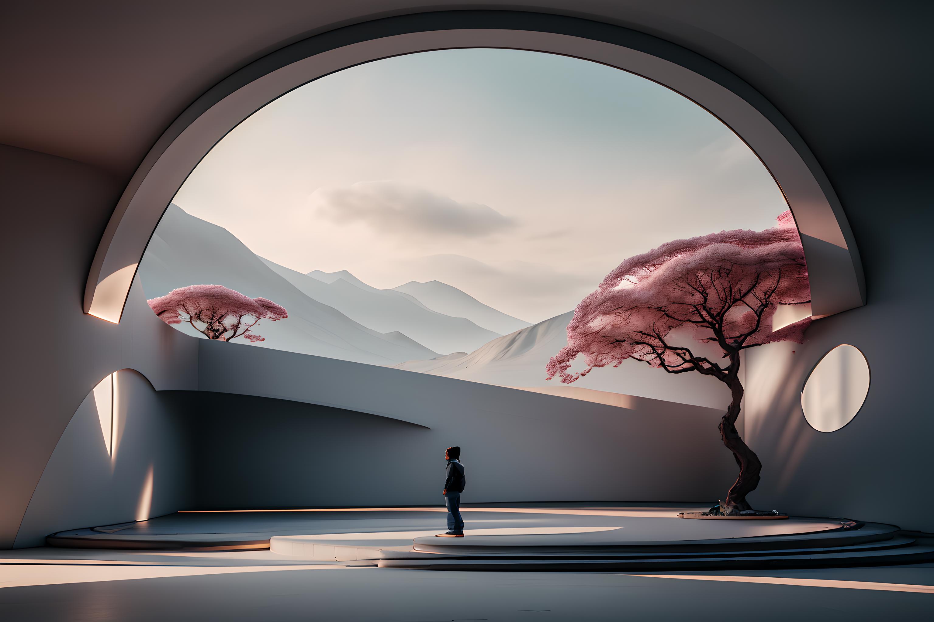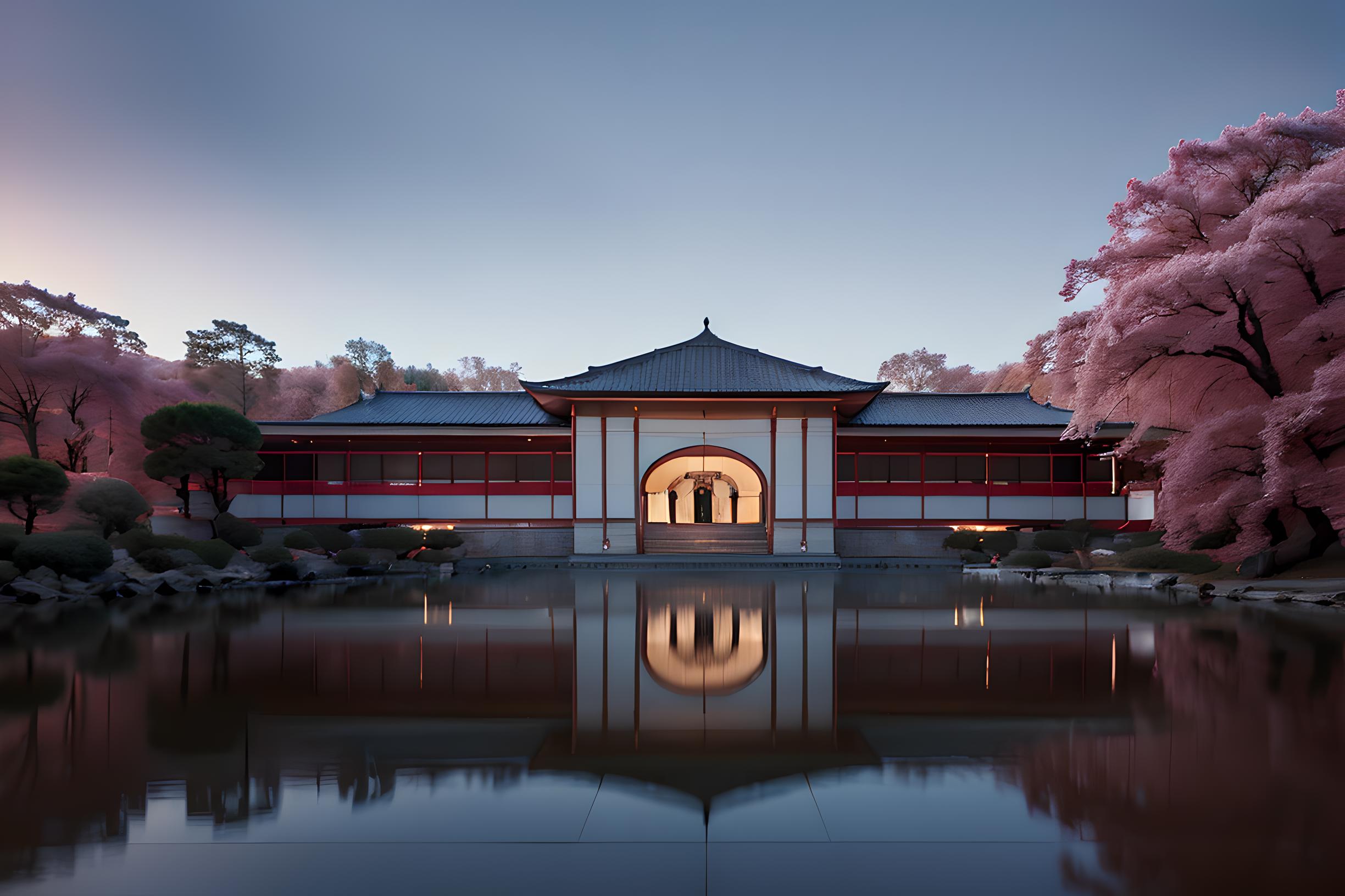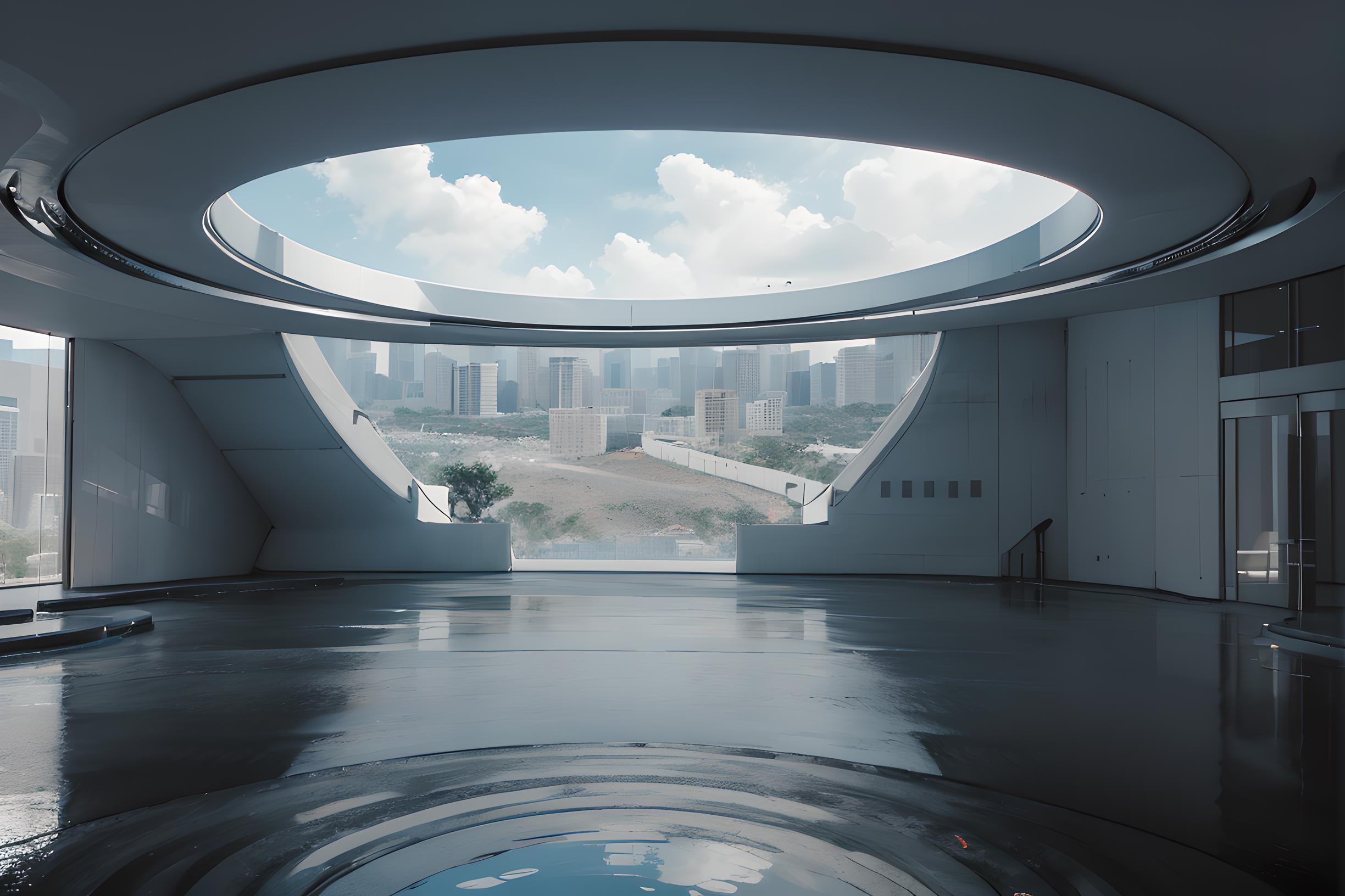 Common prompt words:CGphotobuilding bsw, no humans, scenery, reflection, tree, sky, blue theme, cloud, outdoors, reflective floor, water, cherry blossoms,circular structure,door,  window, architecture, building, east asian architecture, stairs, still life, bare tree, table, indoors, sceneryletterboxed, day, city, ground vehicle, lamppost, house