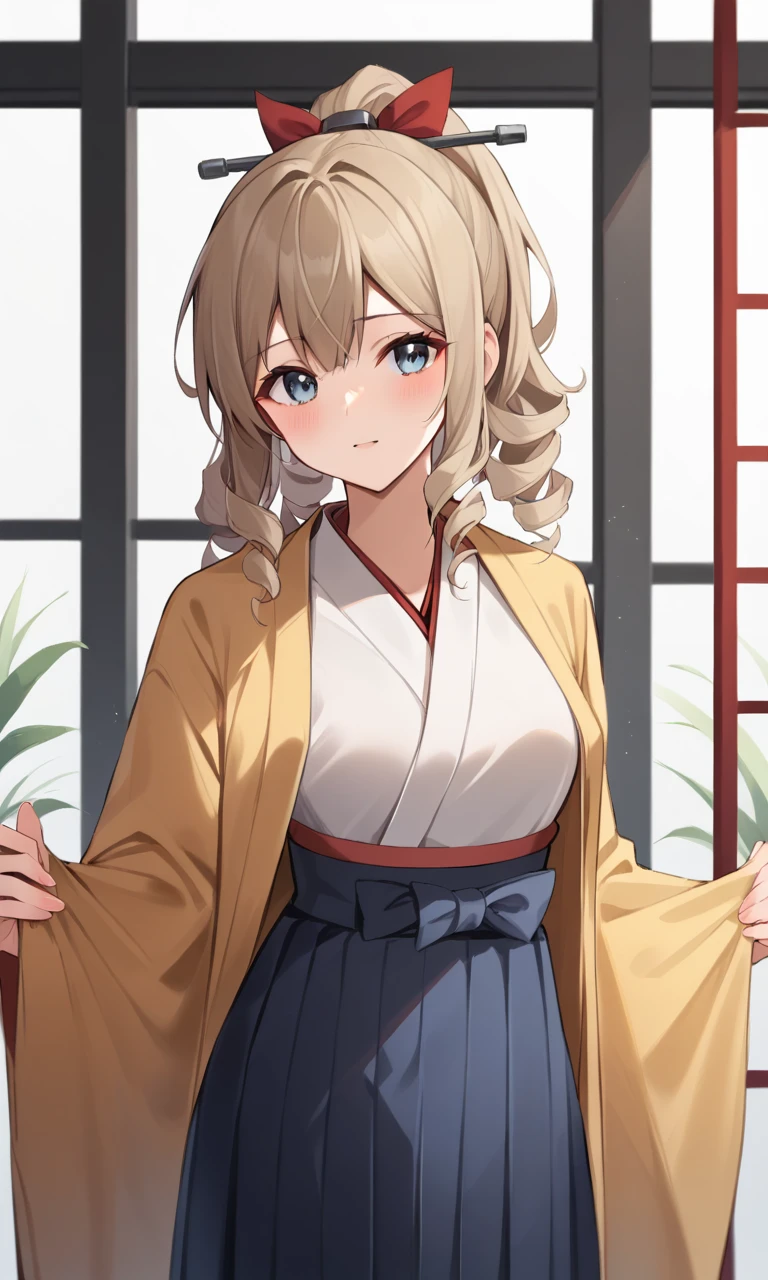 Default Outfit : hatakazeKC, long hair,skirt,hair ornament, hair ribbon, ponytail, japanese clothes, wide sleeves, kimono, red ribbon, drill hair, hakama, hakama skirt, white kimono, haori, furisode, meiji schoolgirl uniform,