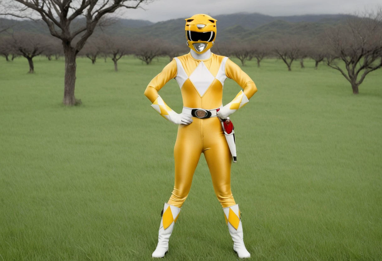 Prompts: yellow power ranger, morphed, helmet, yellow catsuit, white belt gloves boots, holstered weapon