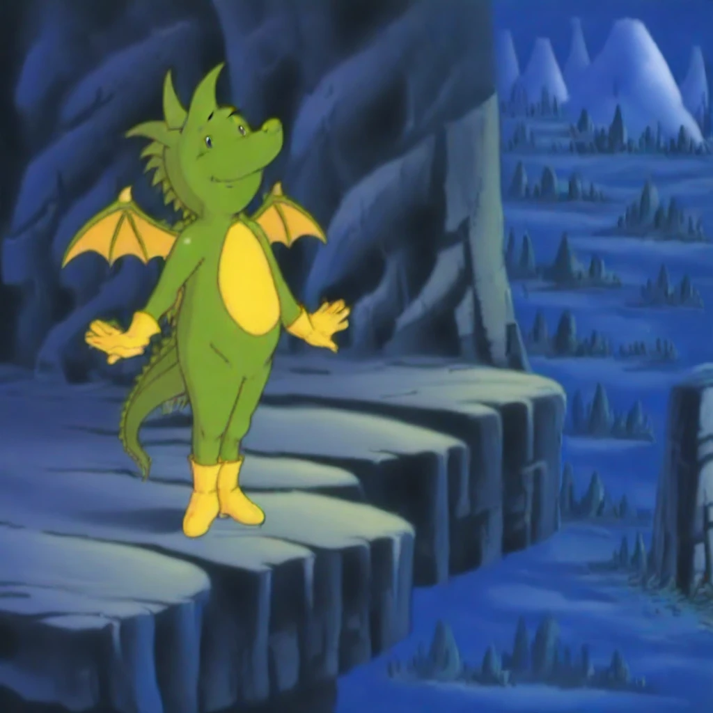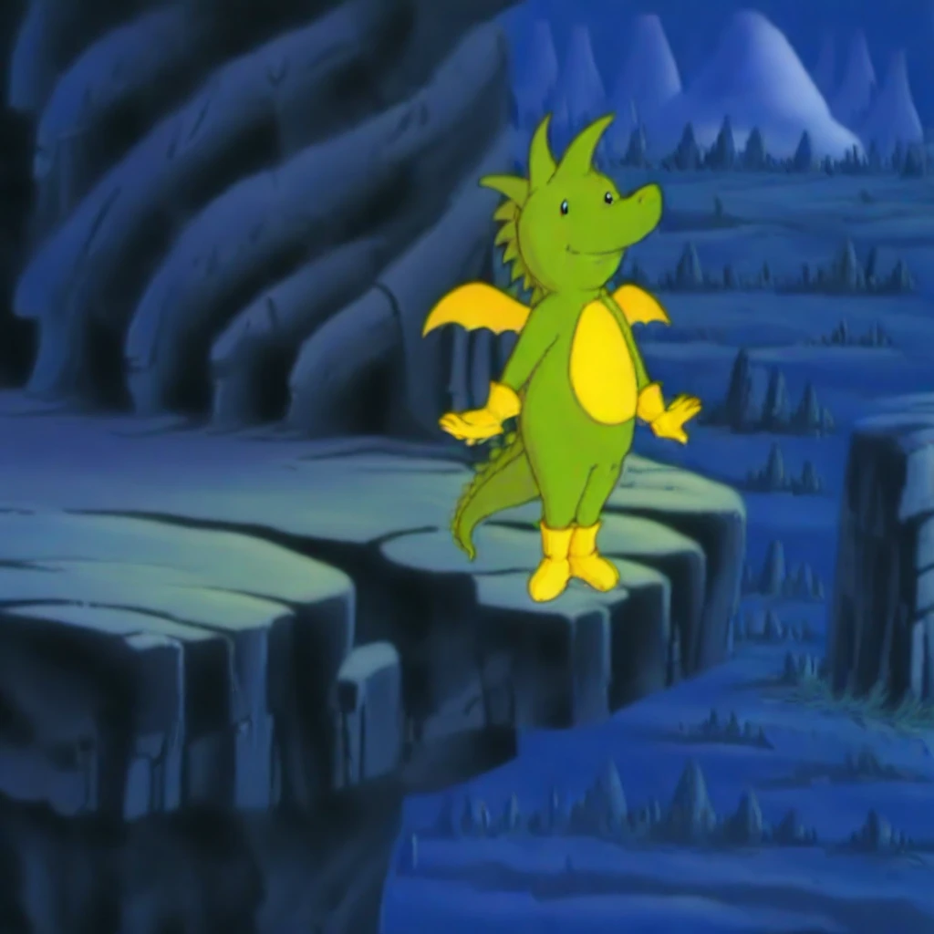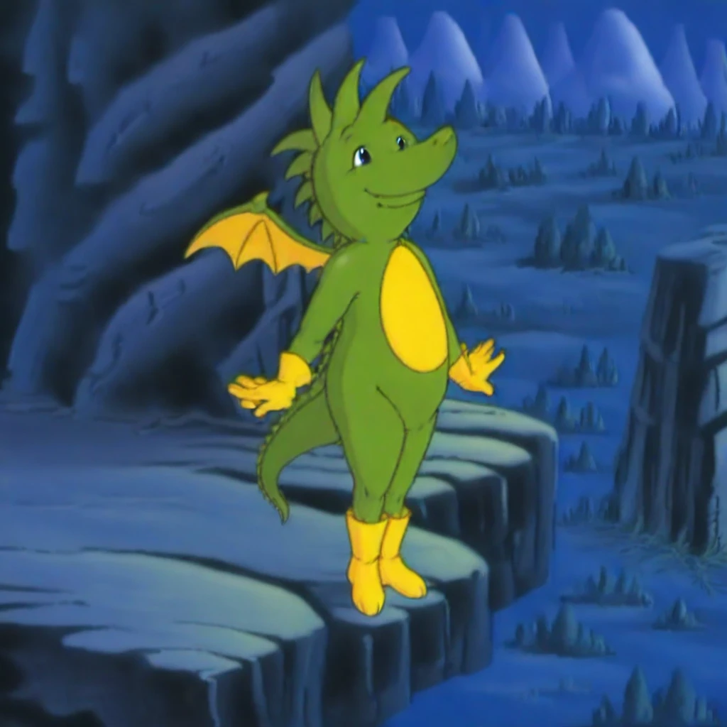 Tabaluga ,male, dragon, green scales,yellow dragon wings, yellow gloves, yellow feet,red cloak,long cloak,standing,smiling