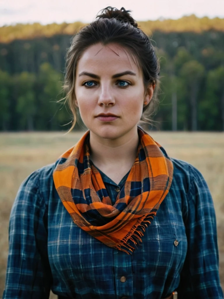 blue eyes and dark brown hair tied in a bun, wearing a blue plaid shirt, an orange shawl, a black belt with a golden buckle, a brown skirt, and black boots