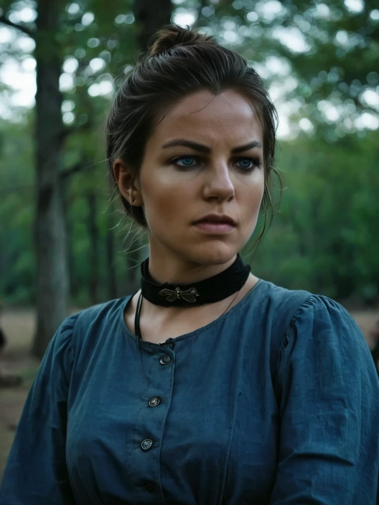 blue eyes and dark brown hair tied in a bun, wearing a blue blouse, a worn-looking black belt, a dark blue long skirt, and black boots