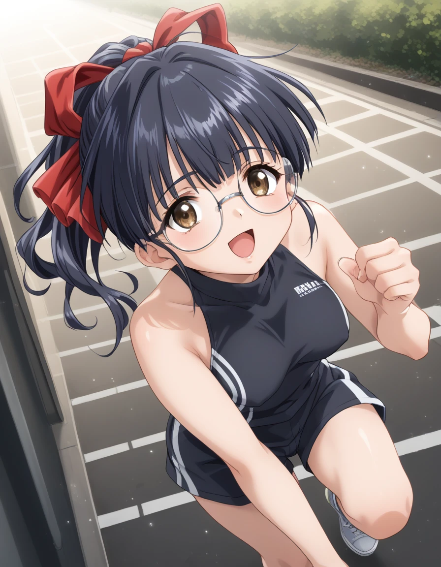 Kawasaki_Meimi, 1girl, large breasts, brown eyes, glasses, black hair, blue hair, long hair, ponytail, bangs, sidelocks, hair ribbon, red ribbon