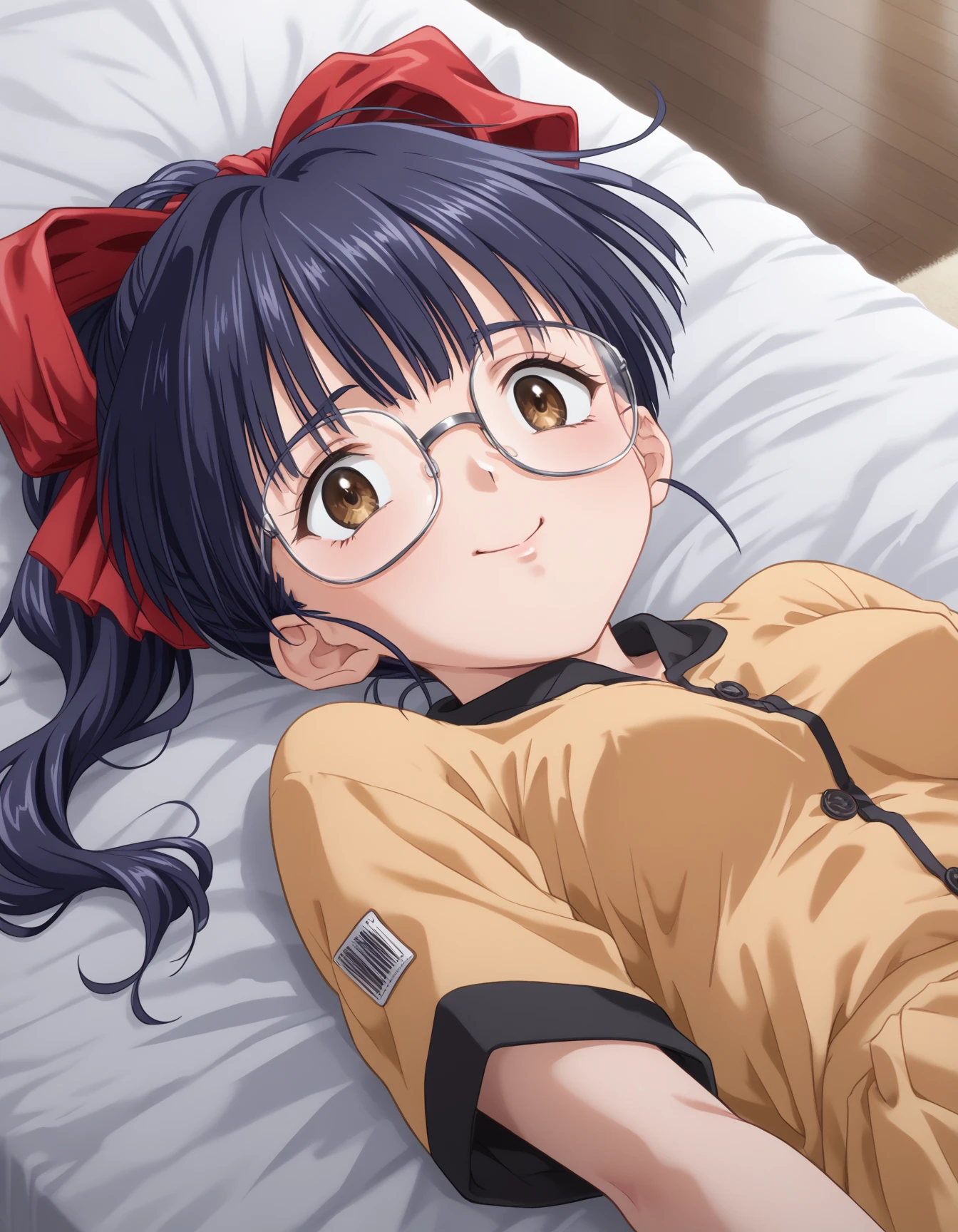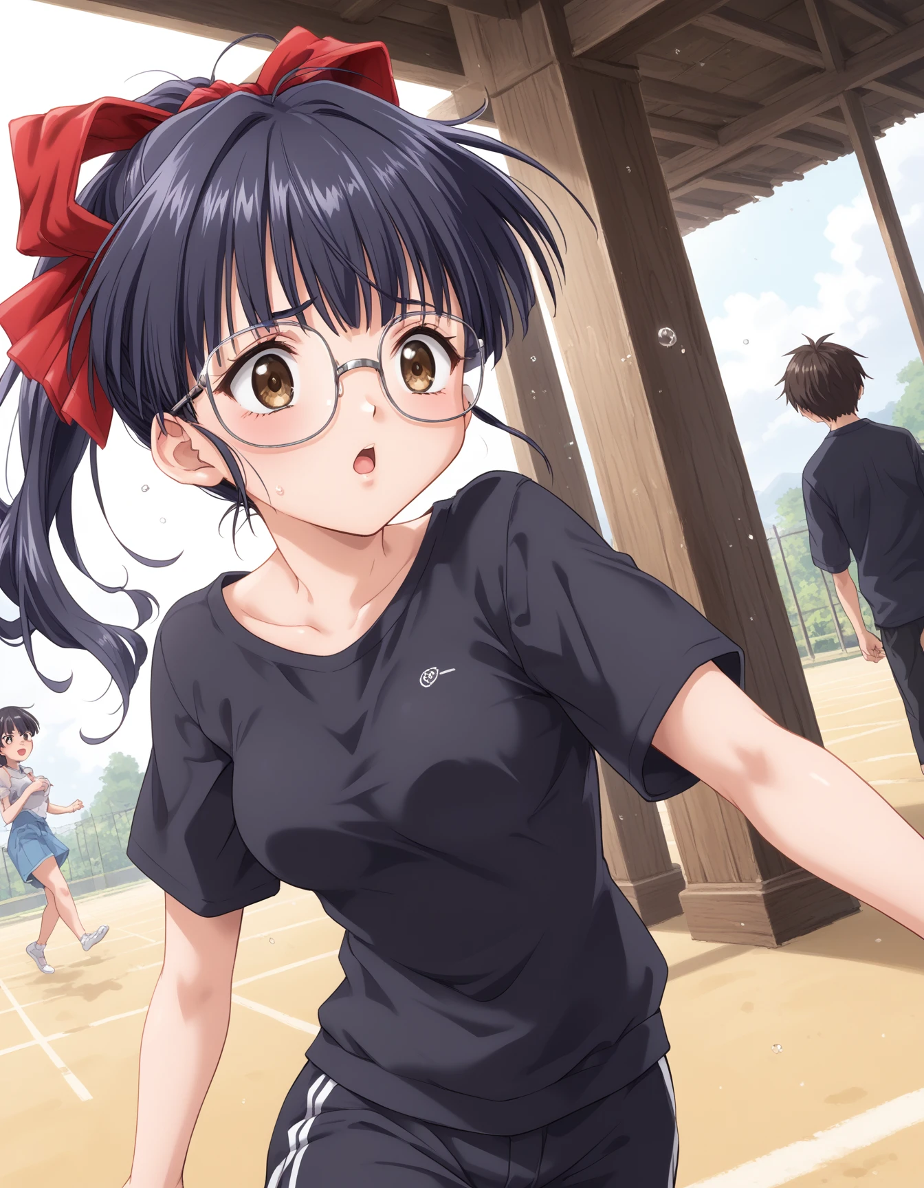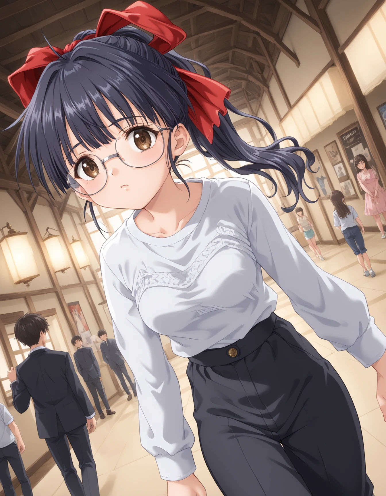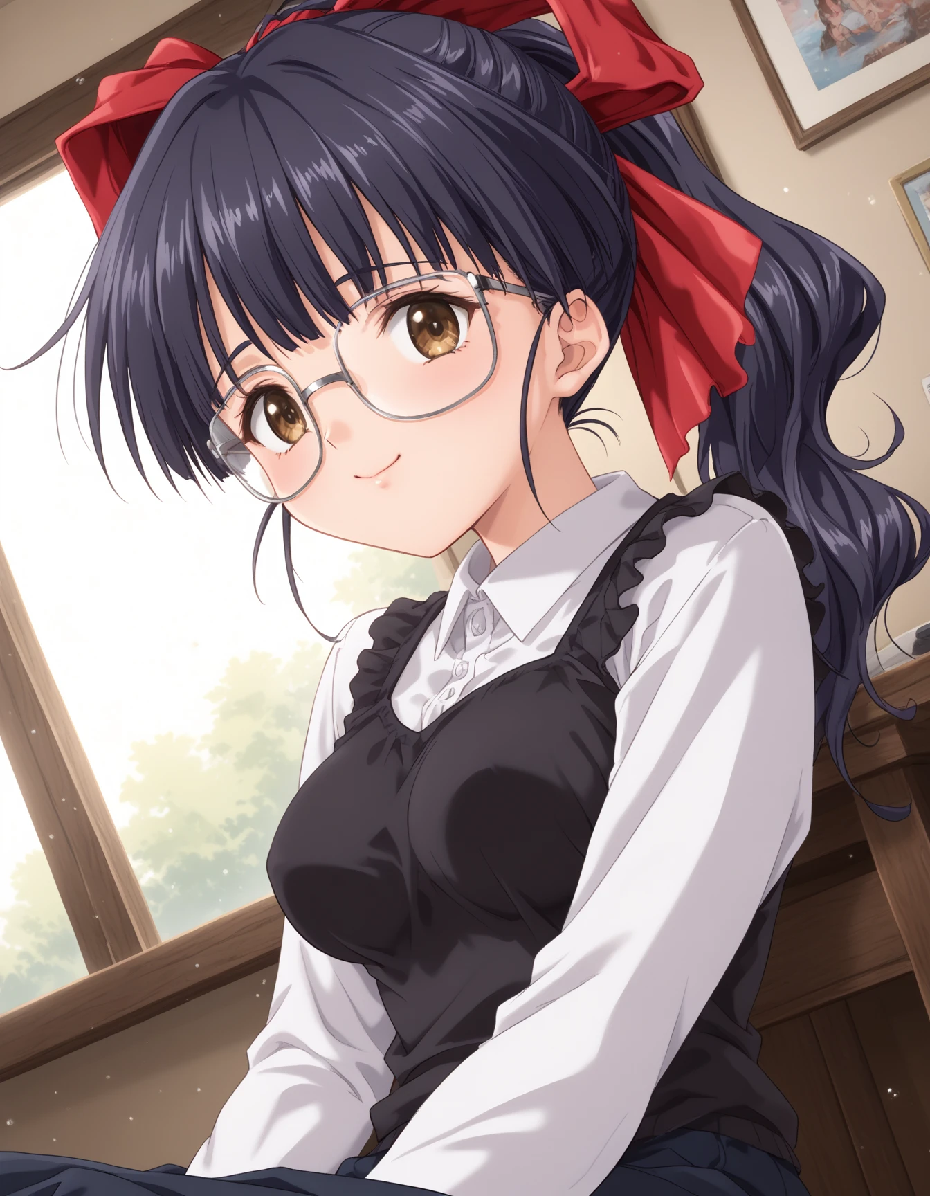 Kawasaki_Meimi, 1girl, large breasts, brown eyes, glasses, black hair, blue hair, long hair, ponytail, bangs, sidelocks, hair ribbon, red ribbonDescription