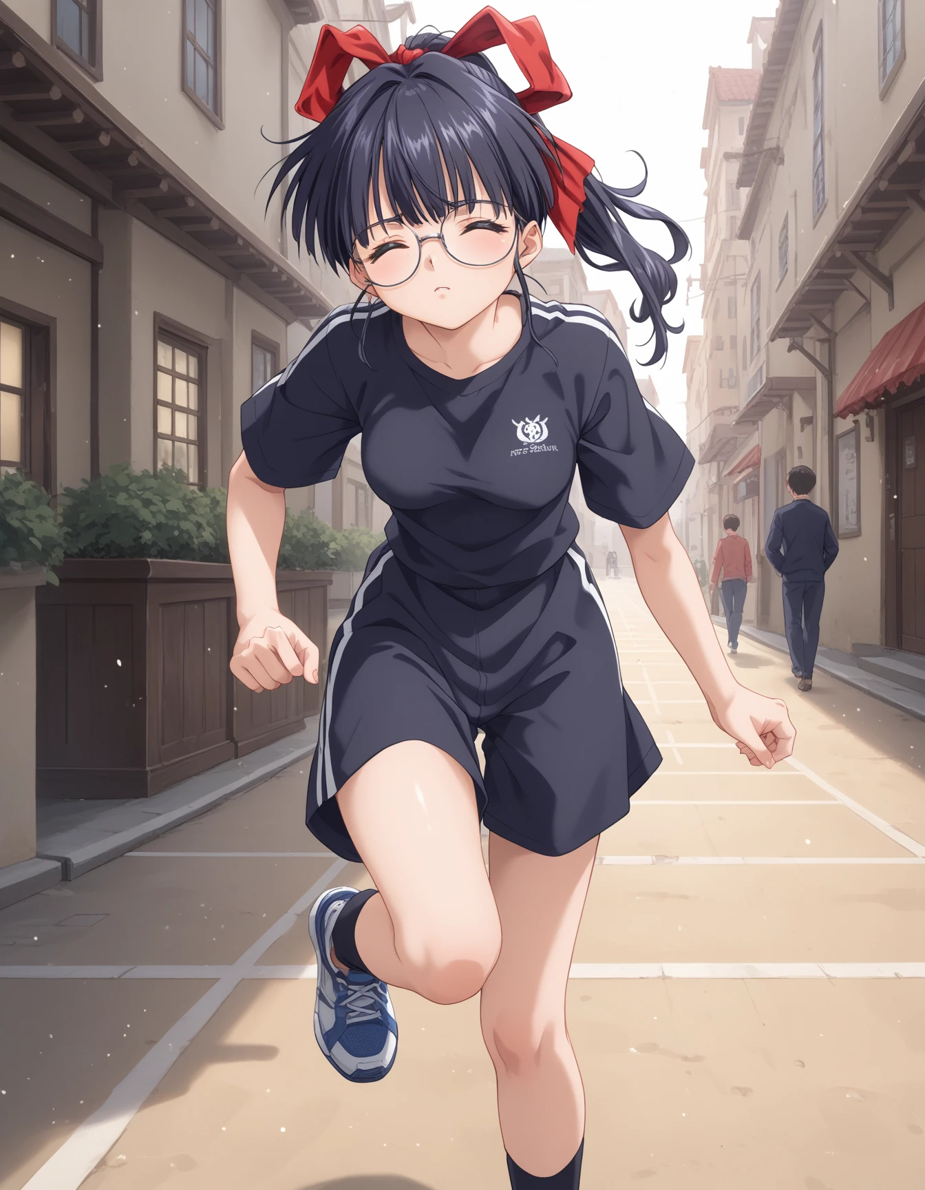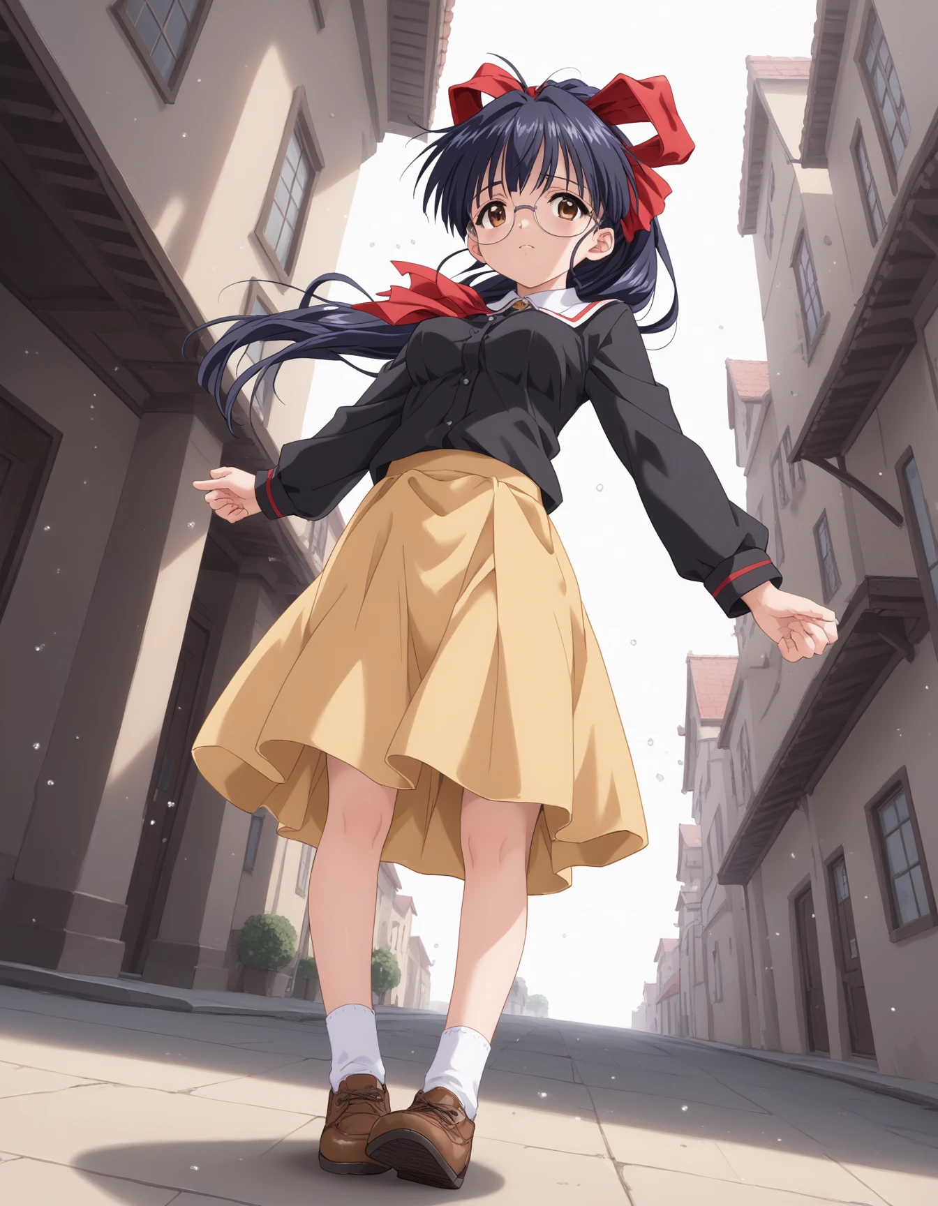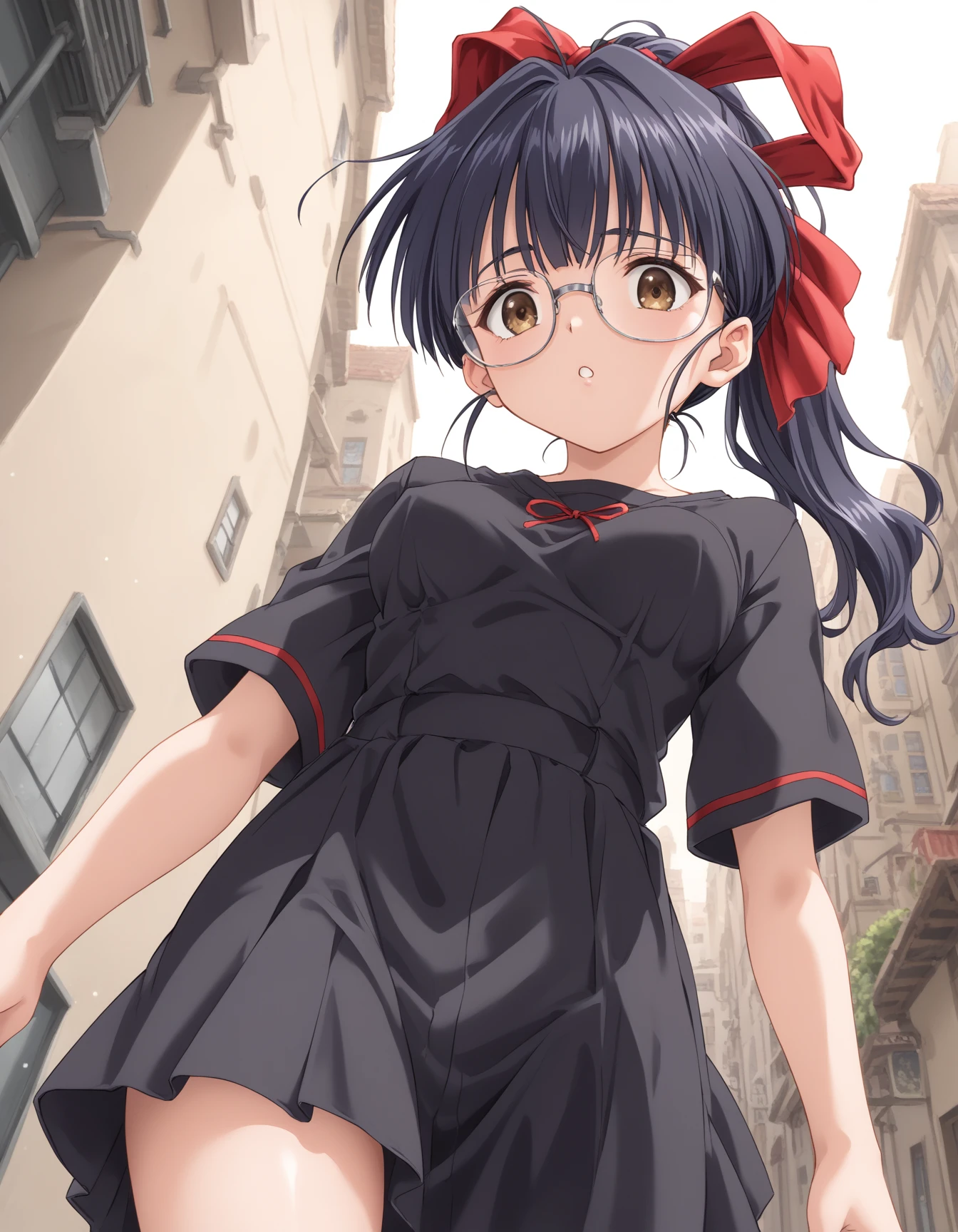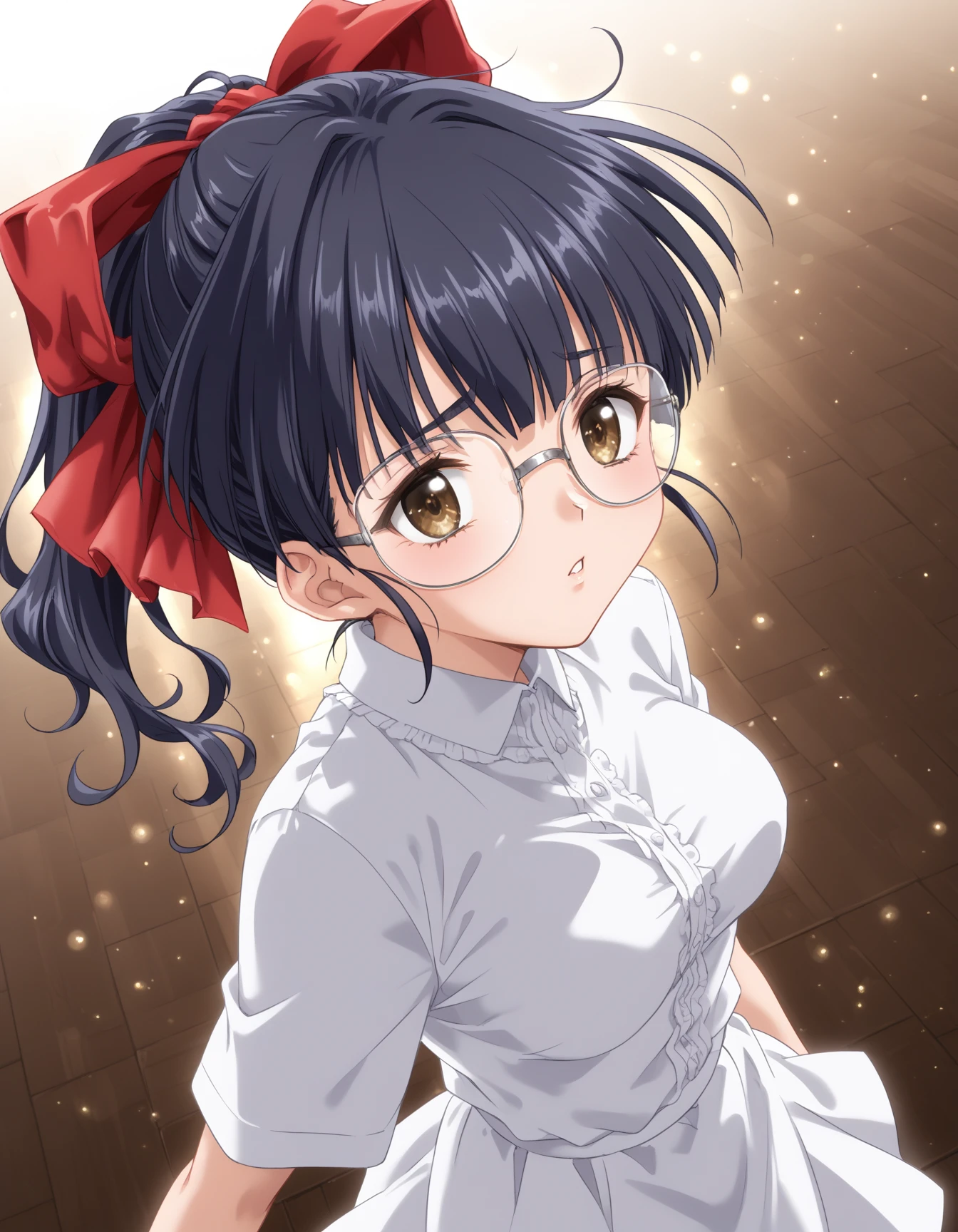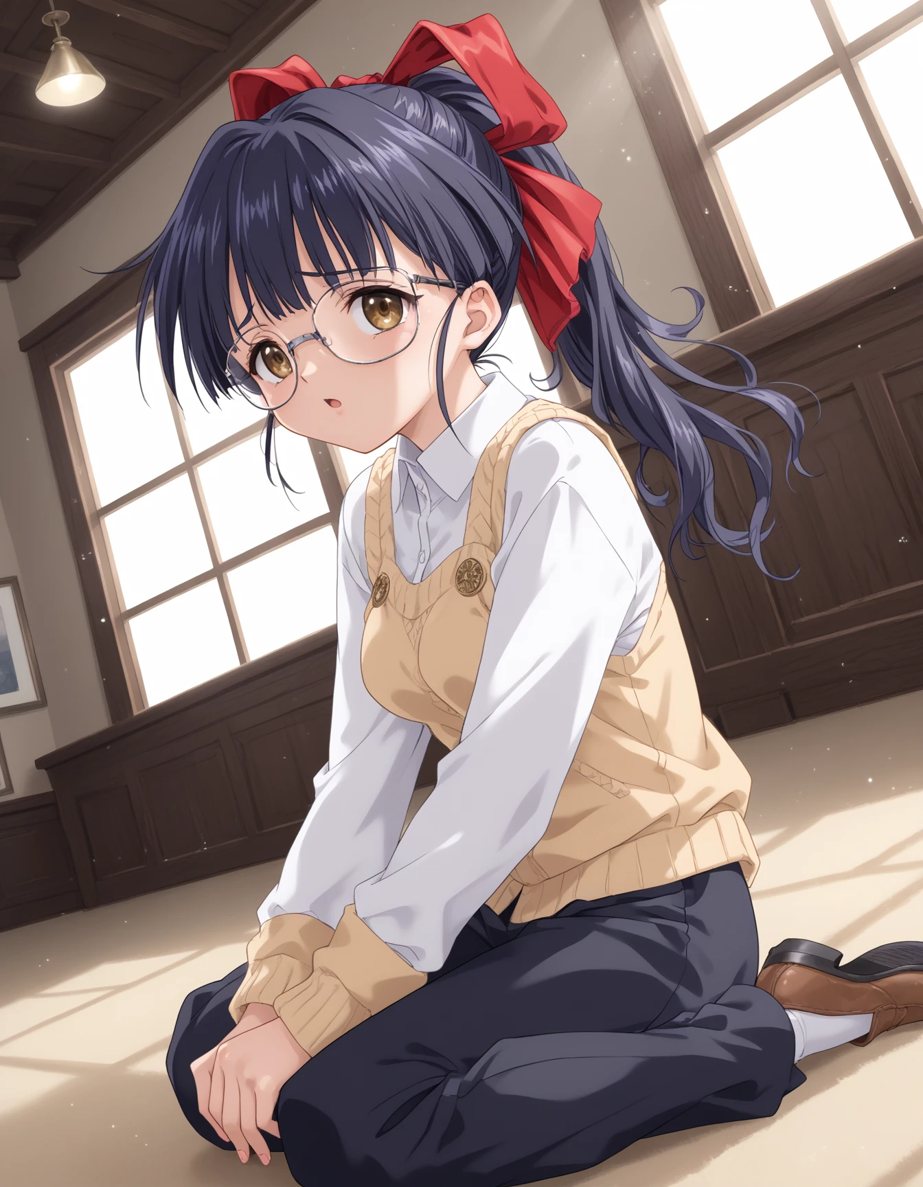 Kawasaki_Meimi, 1girl, large breasts, brown eyes, glasses, black hair, blue hair, long hair, ponytail, bangs, sidelocks, hair ribbon, red ribbonDescription