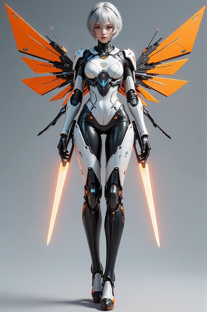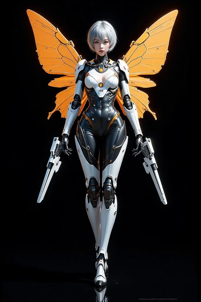 Mechanical girls with winged armor, cyberpunk city backdrop, neon lights reflecting off metallic surfaces, dynamic flight pose, intricate wing details glowing.