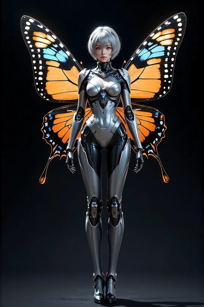 Mechanical girls with winged armor, ancient temple ruins setting, sunbeams highlighting polished metal, wings mimicking butterfly patterns, serene standing stance.
