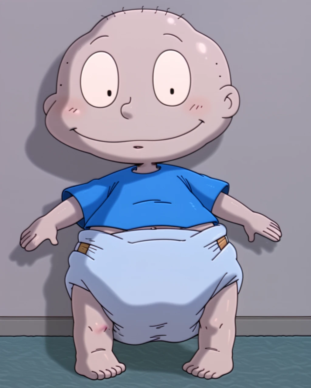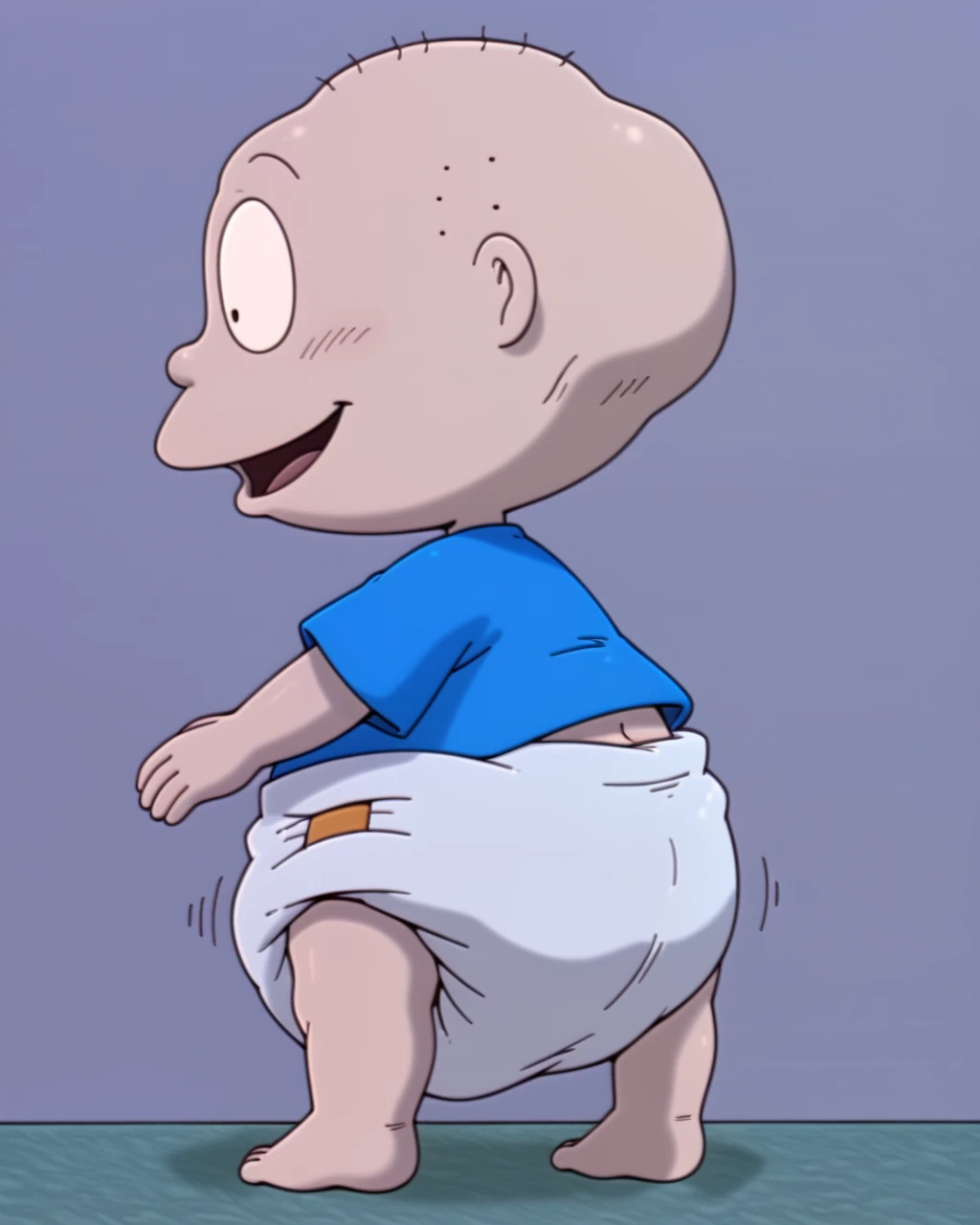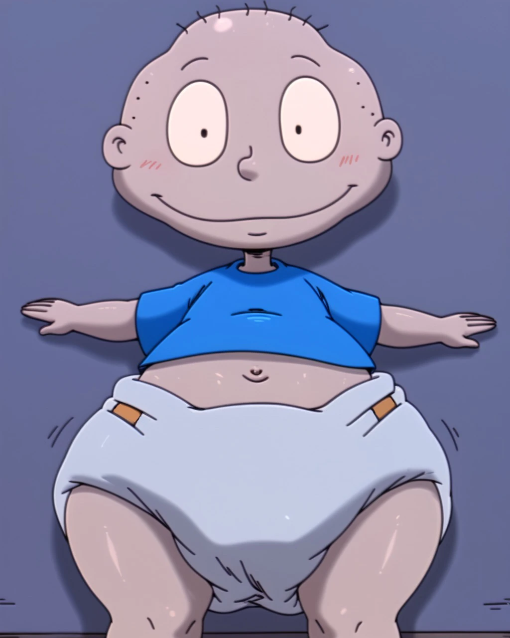 Trigger words: 1boy, solo, male, blue shirt, short sleeves, bald, diaper, belly button, short shirt