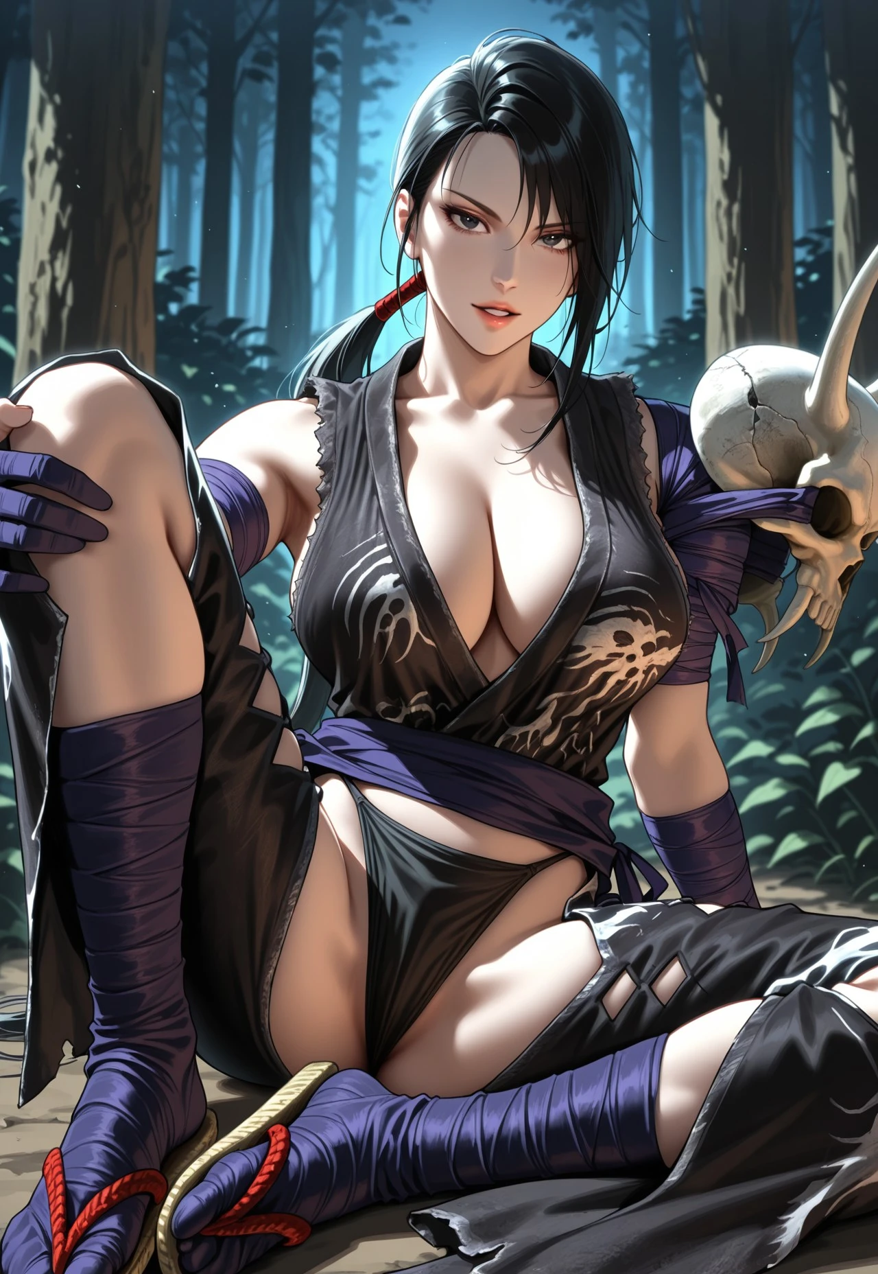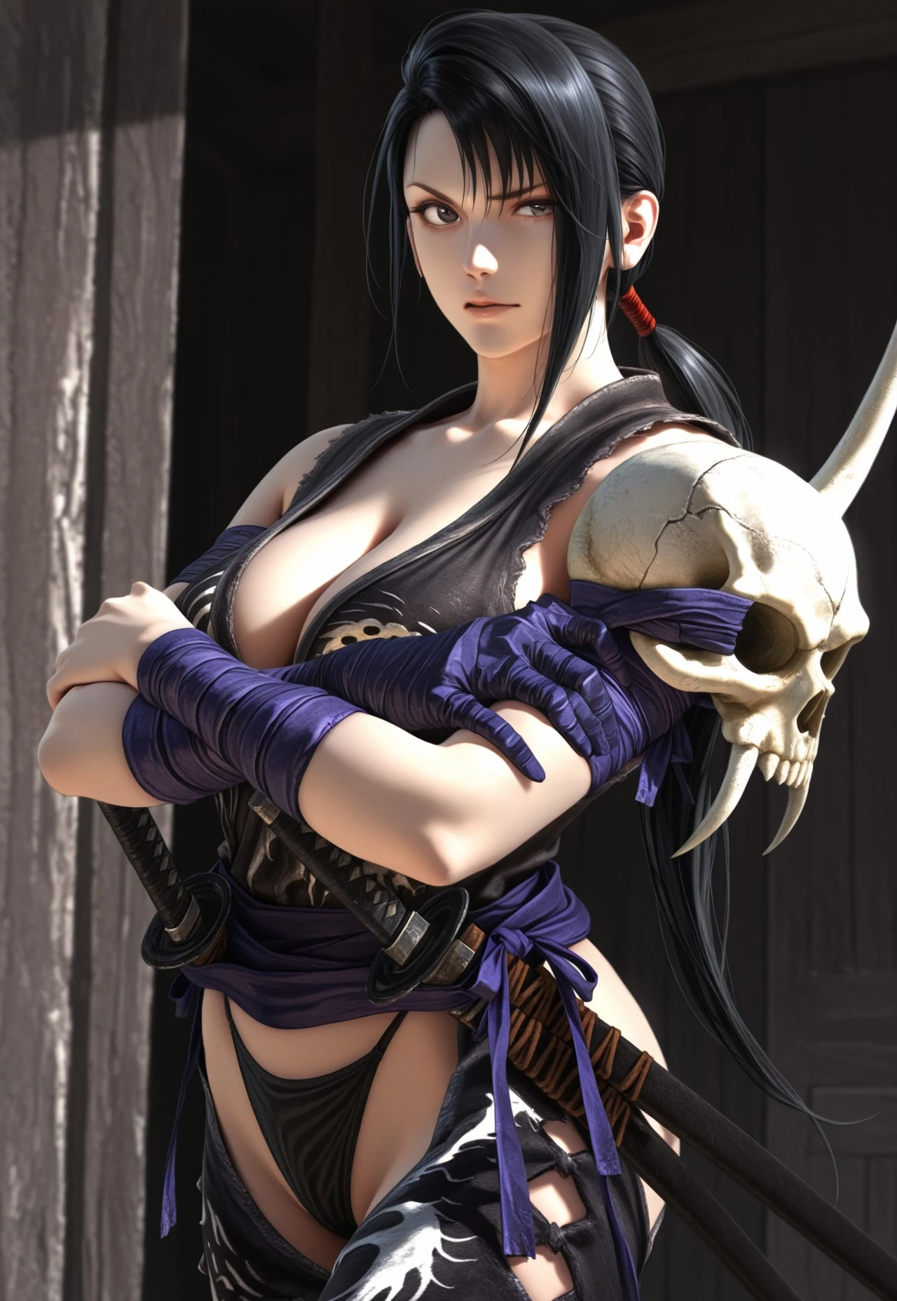 Black tunic, sleeveless, cleavage, skull pauldron, bare shoulder, purple arm bandages, arm guards, single glove, Sash, chaps, black panties, tabi, sandals,