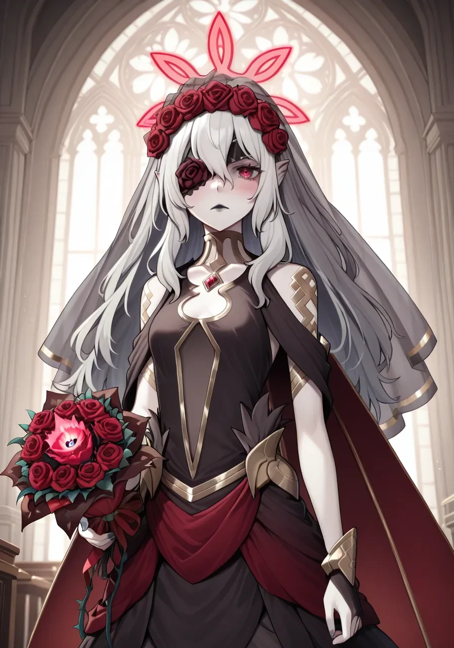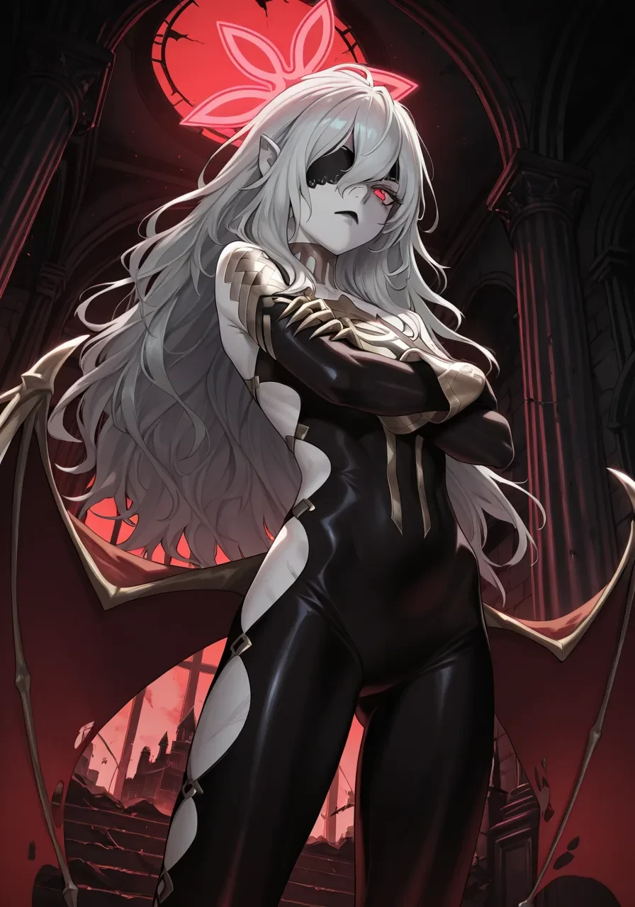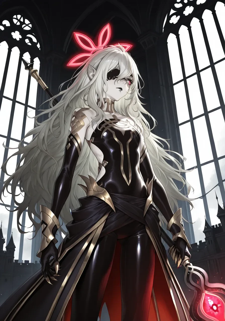 Trigger Words: EmblaFE1, grey hair, long hair, eyepatch, red eyes, halo, pale skin, pointy ears, black lips