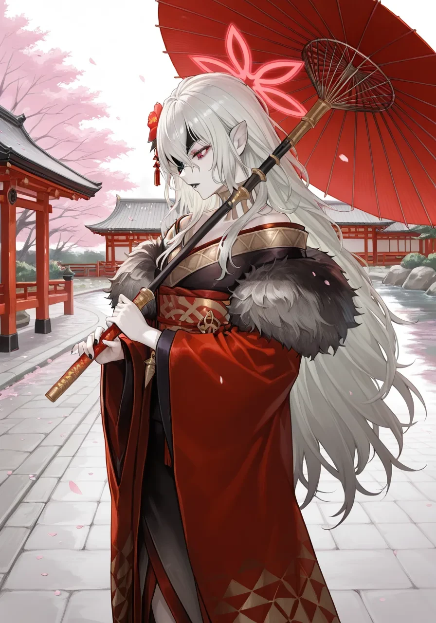 New Year: EmblaNYR, hair ornament, hair flower, japanese clothes, fur trim, kimono, sandals, gradient clothes, umbrella