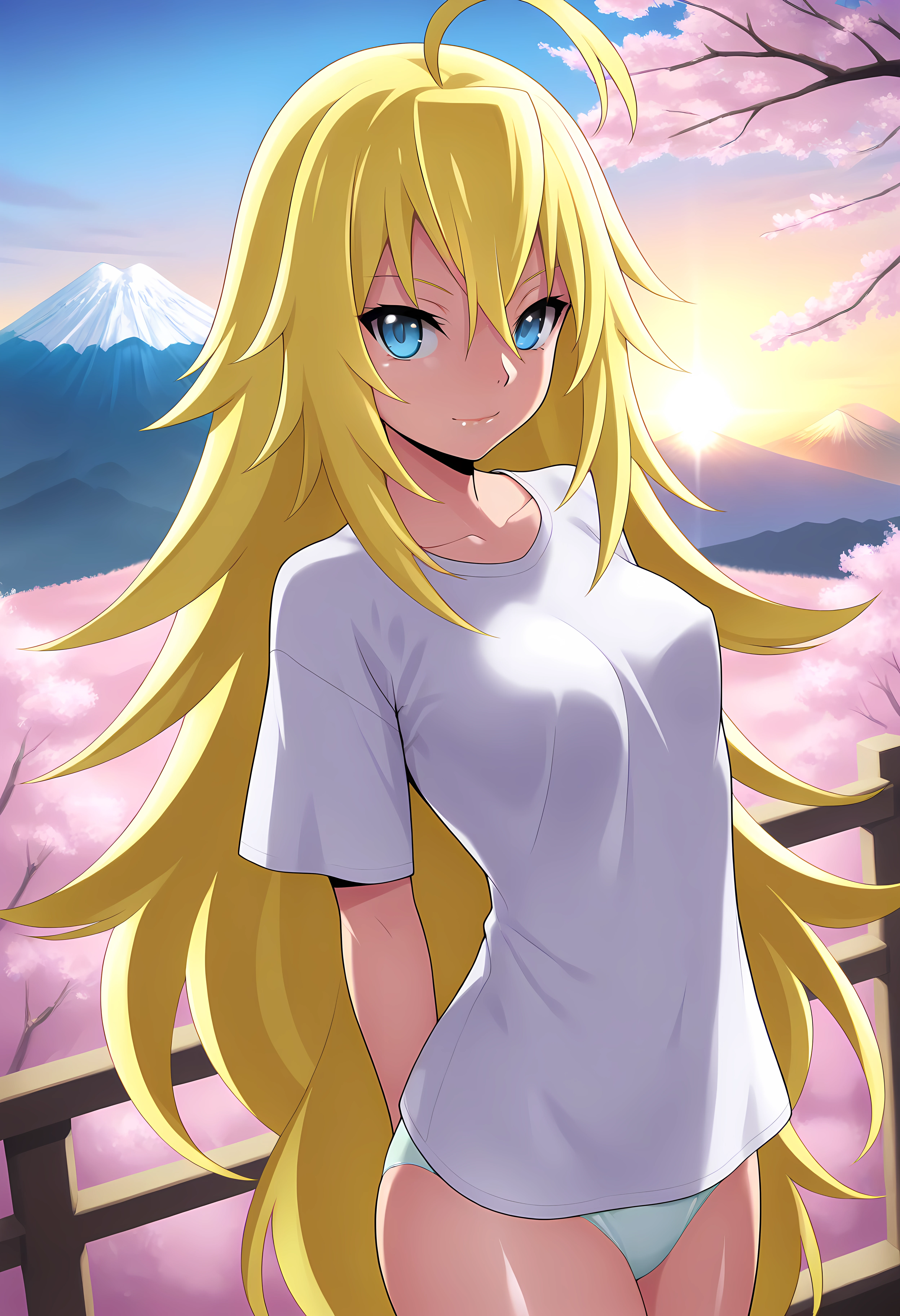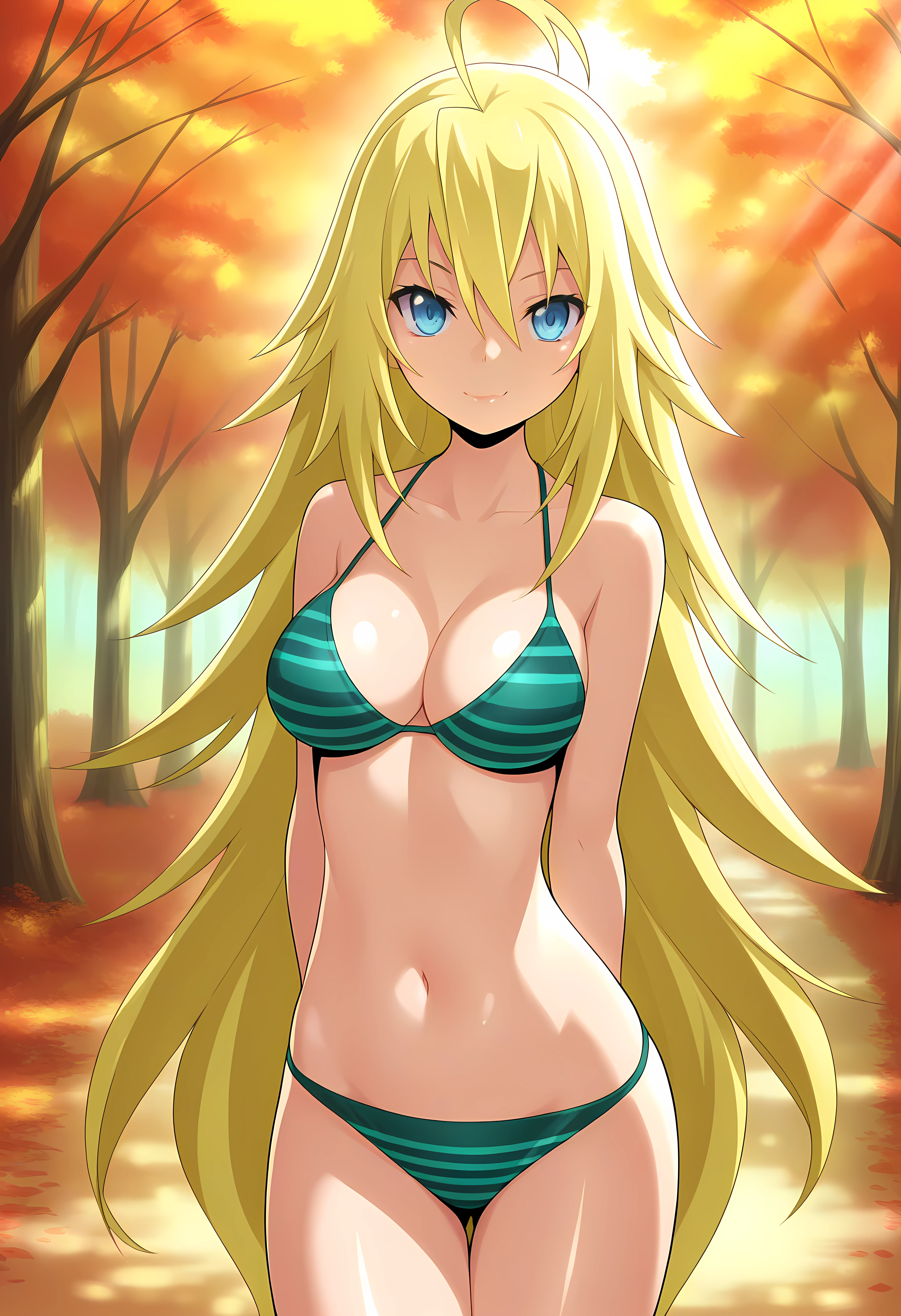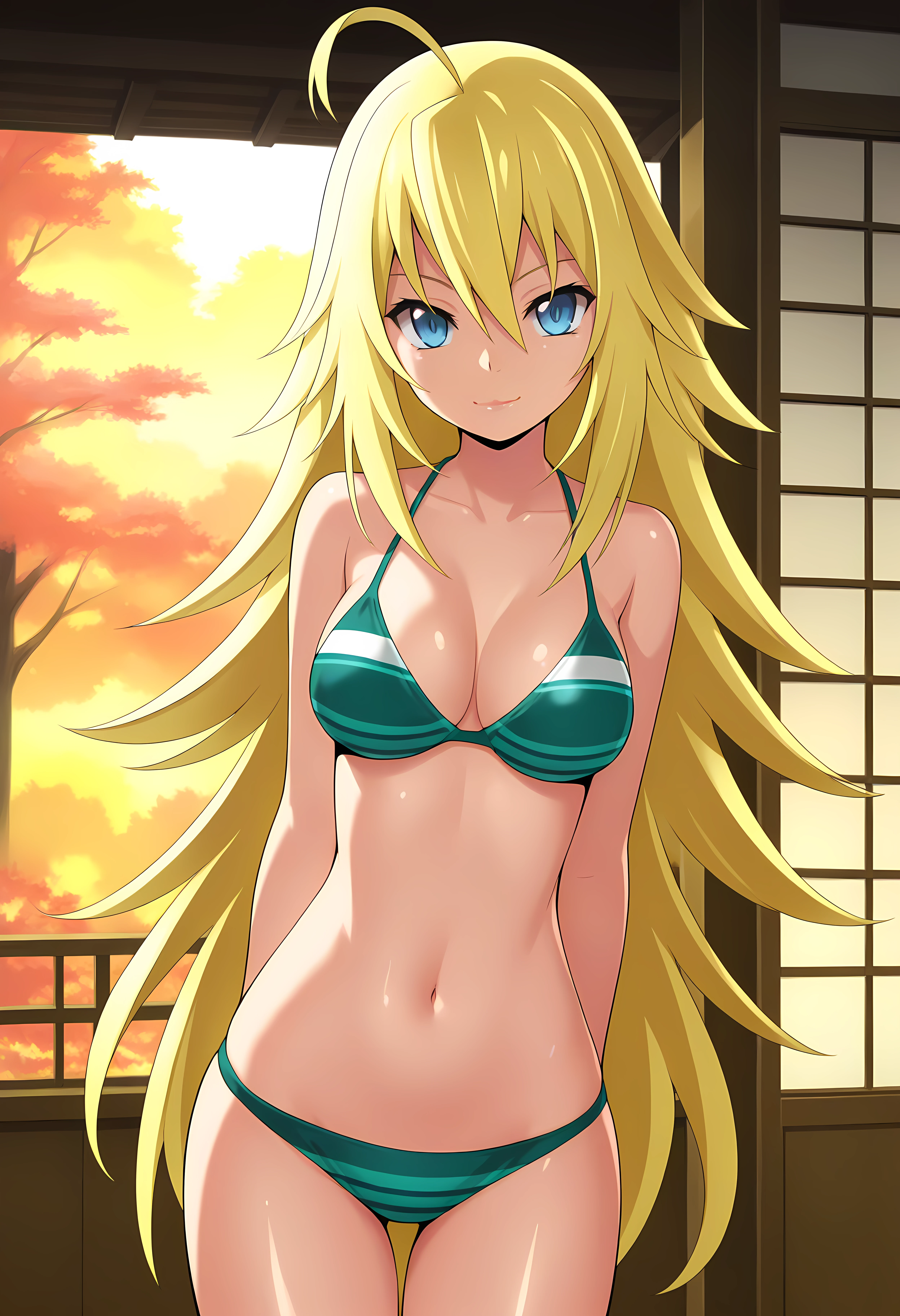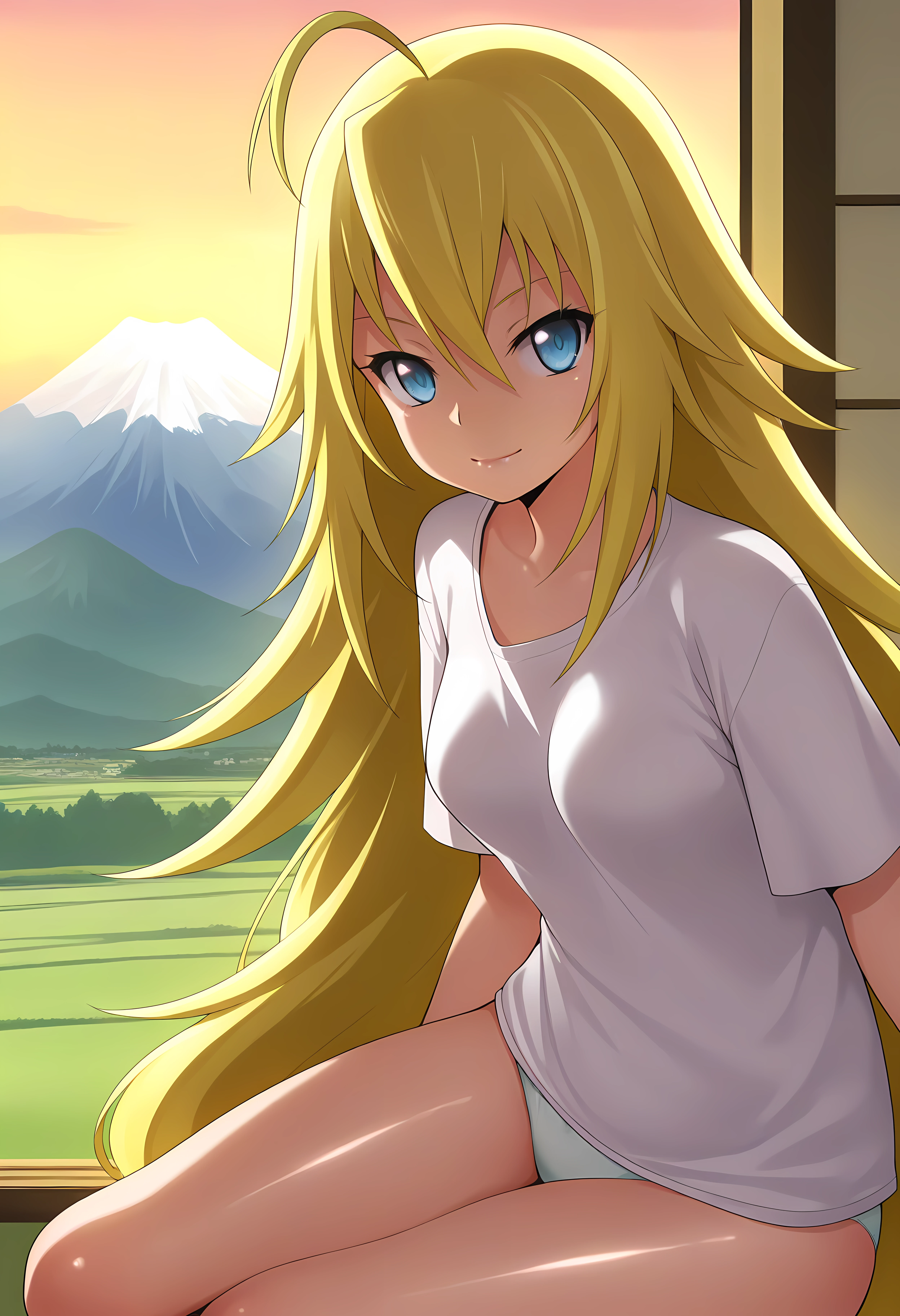 Appearance → ohwx, blonde_hair, long_hair, 1girl, breasts, ahoge, blue_eyes, large_breasts, hair_between_eyes, very_long_hair,