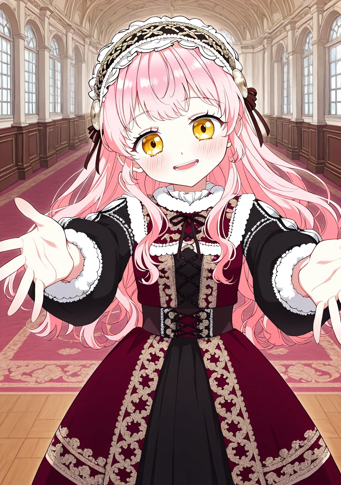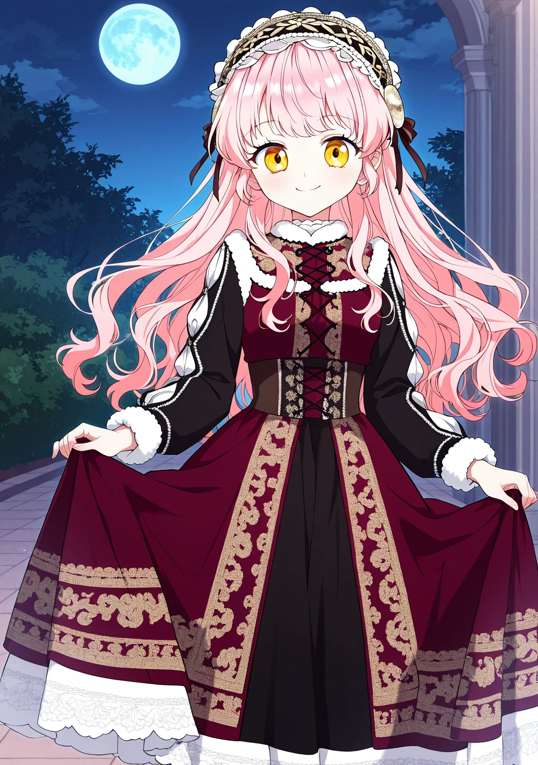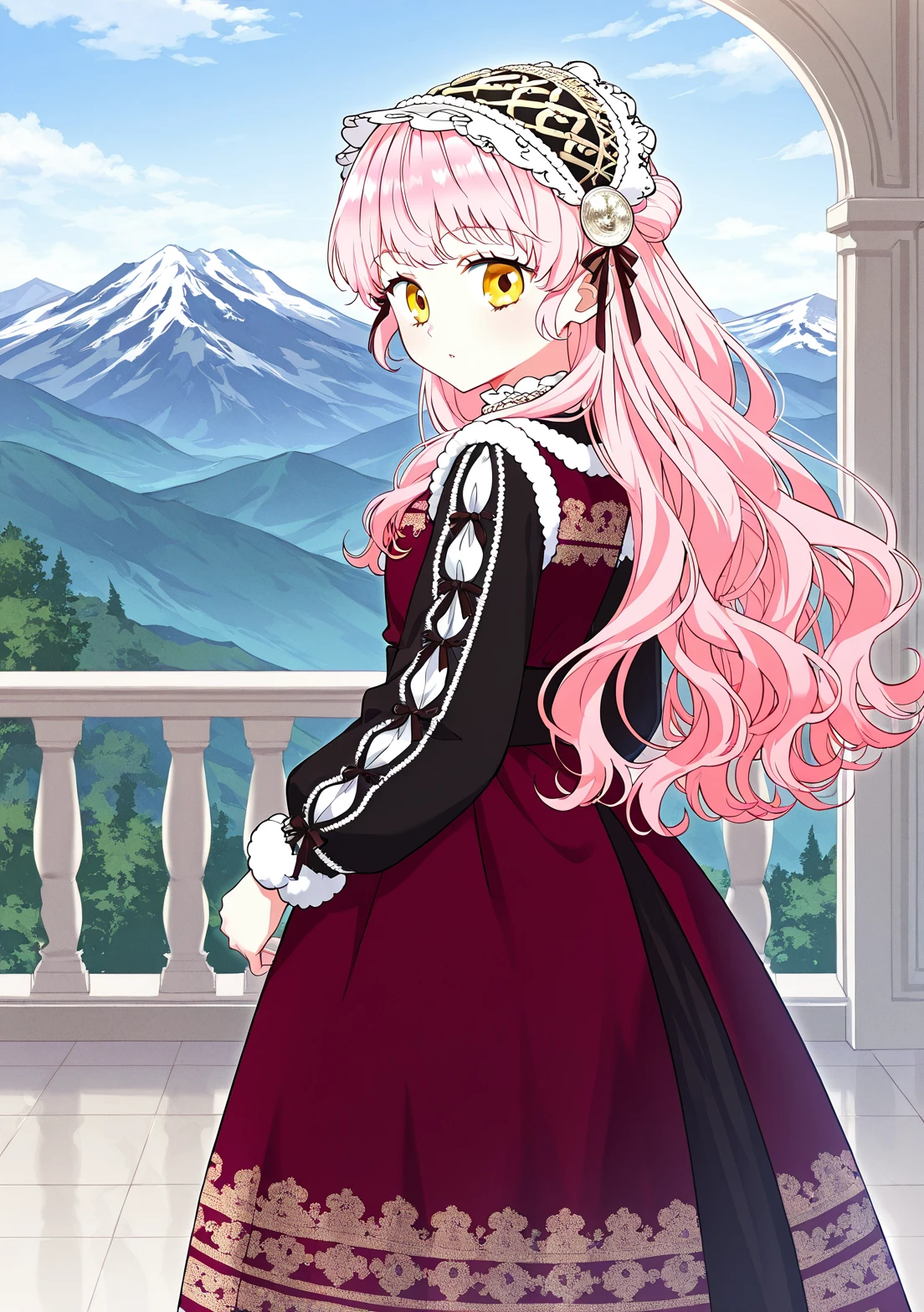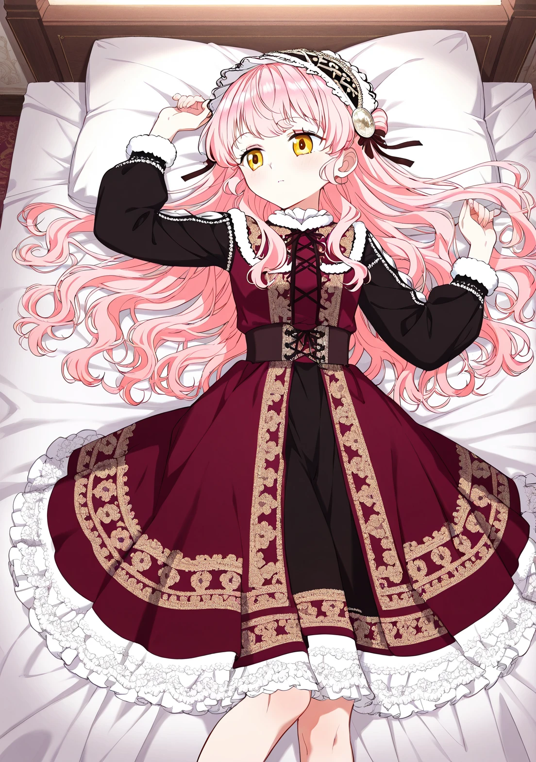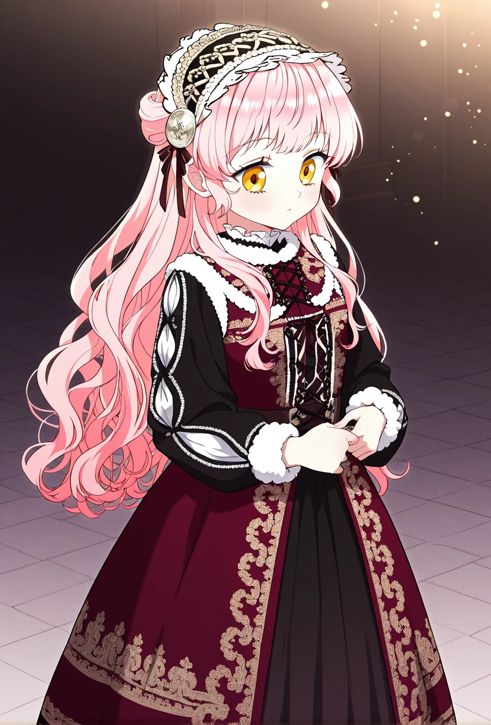 AyrinEtam, 1 girl, solo, small stature, golden eyes, long hair, pink hair, soft curls, side strands, parted bangs, blunt bangs, gold hair ornament, lace headpiece, black and white headdress, criss-cross ribbon, gold medallion,
